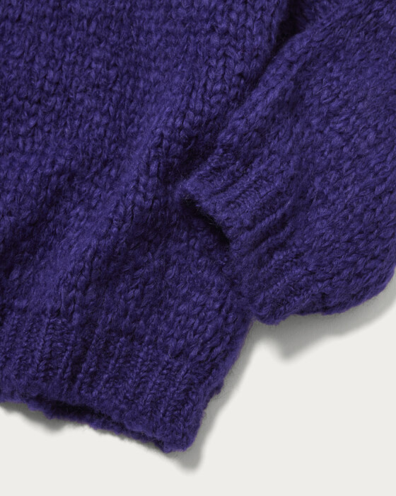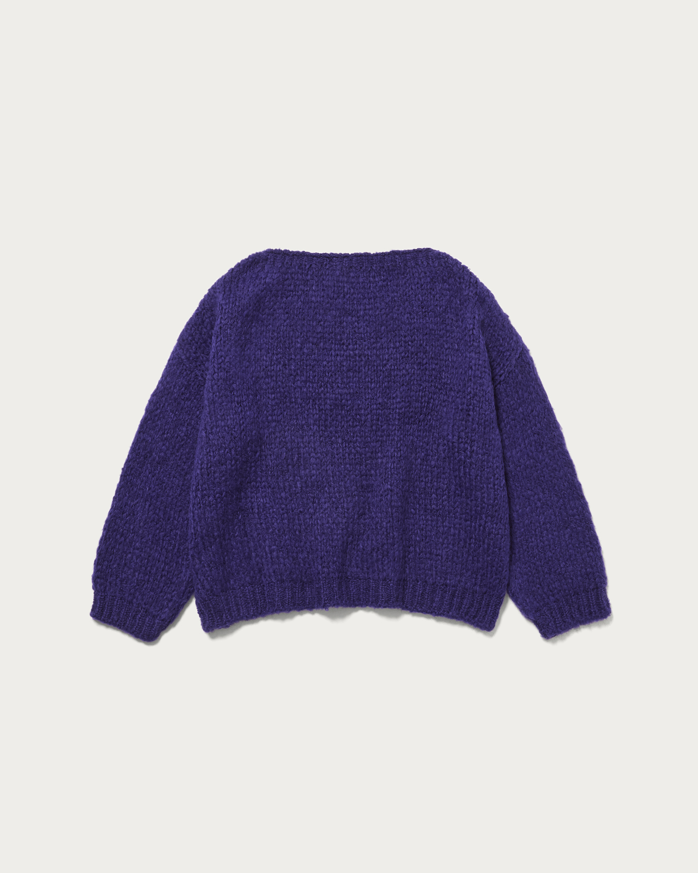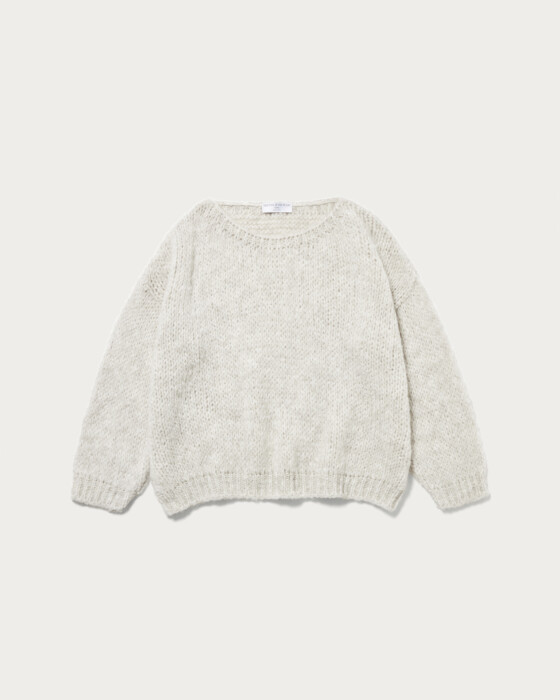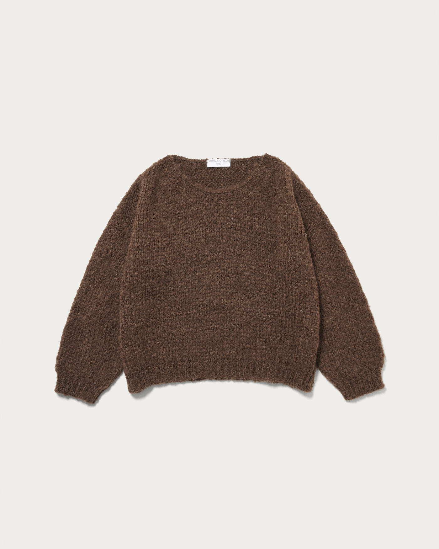 This is a feminine knit with a charming, soft, and fluffy texture, knitted in a low gauge. The moderately loose sizing creates a relaxed feel and offers exceptional comfort. It has been custom-made with a slightly shorter length than the inline version, making it easy to pair with voluminous skirts or wide pants. This piece is versatile enough to be worn casually or dressed up elegantly.