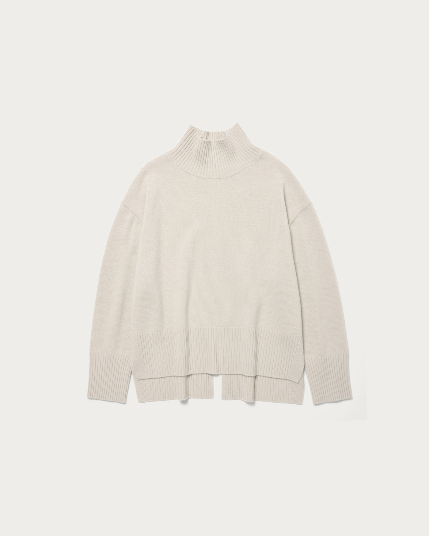 This item features a wool material characterized by its plump and soft texture, offering an inviting sense of comfort. The design point is the difference in length between the front and back, and the moderately loose sizing creates a relaxed feel. The effortlessly stylish silhouette complements a mature casual style. It is a piece that combines warmth and comfort, evoking a sense of the season.
