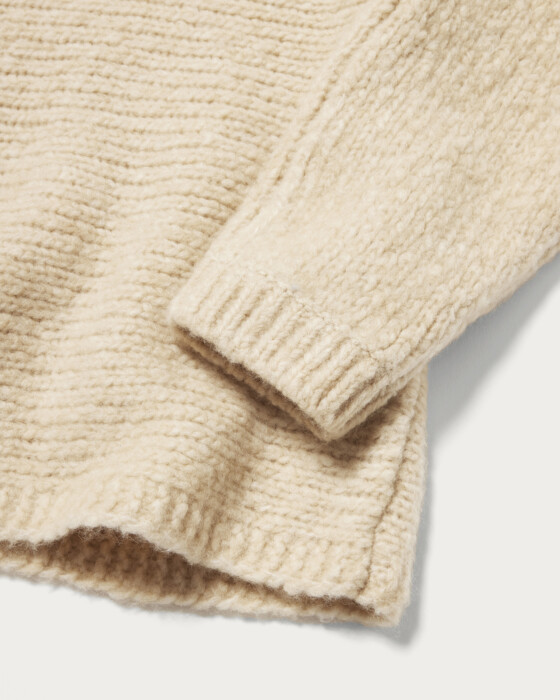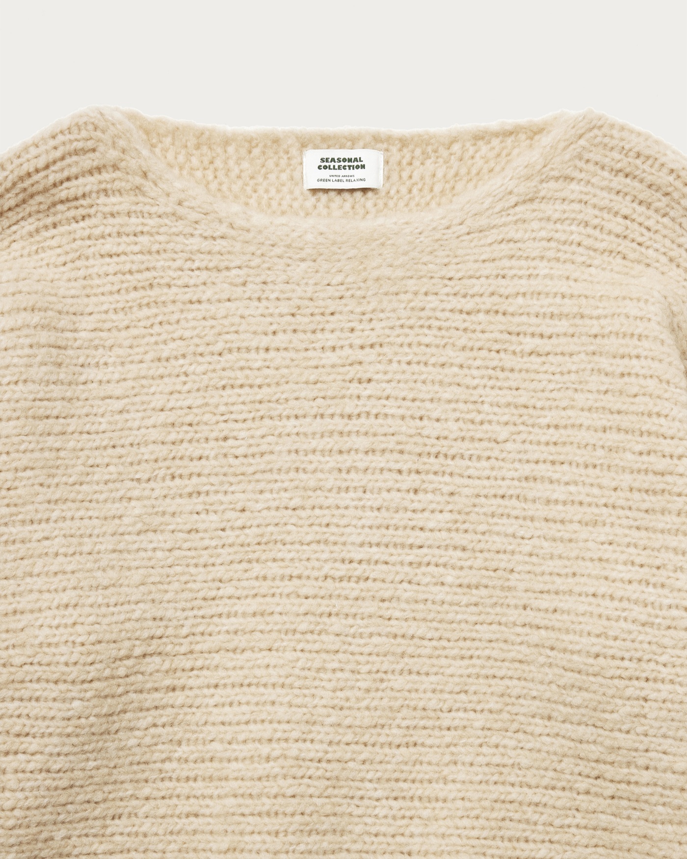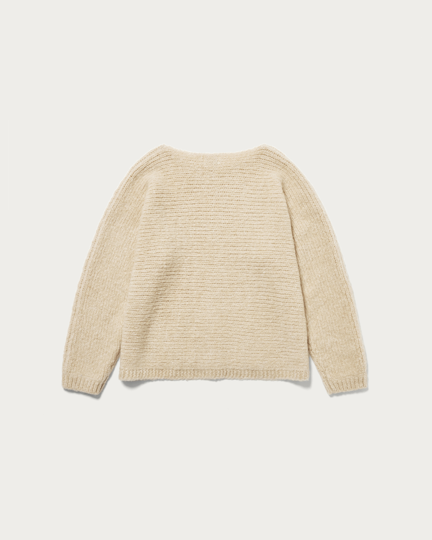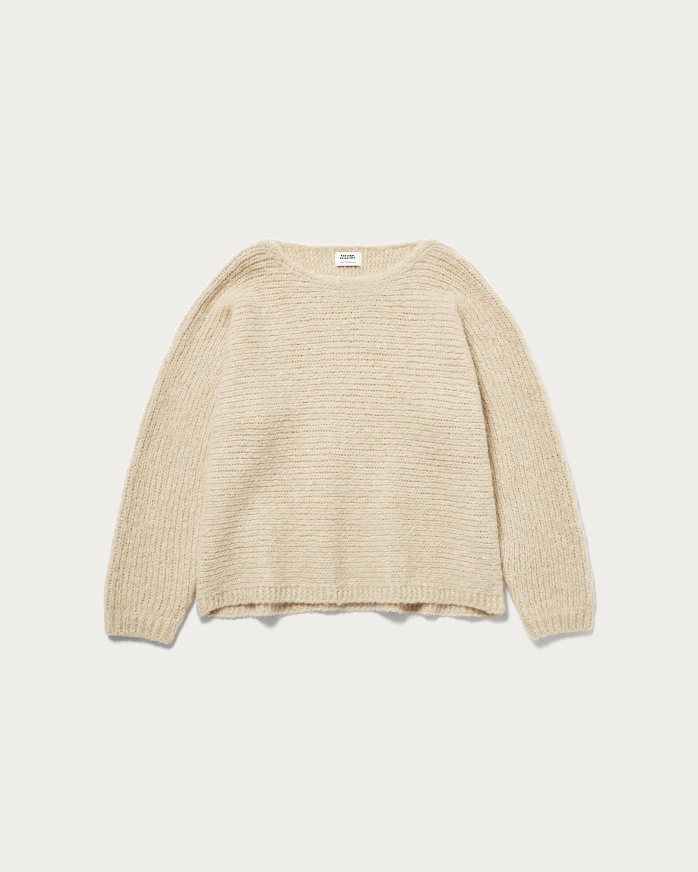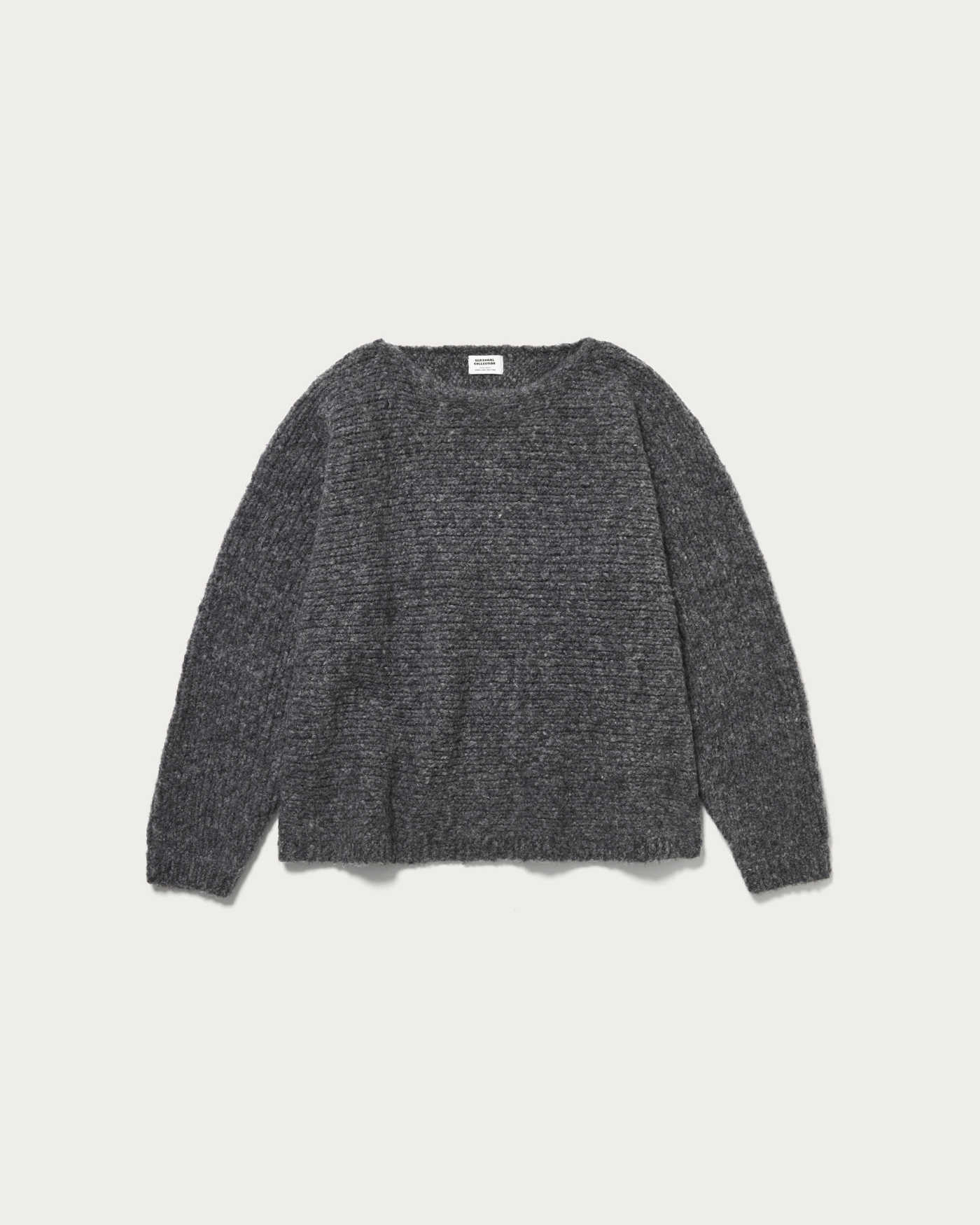 This is a low-gauge knit made with Italian yarn, known for its lightness and softness. The wide boat neck gives a relaxed impression, and the dolman sleeve design adds to the sense of ease. Additionally, the horizontal knitting technique creates a fluffy softness with a three-dimensional silhouette. The result is a piece that is casual yet exudes an elegant atmosphere.