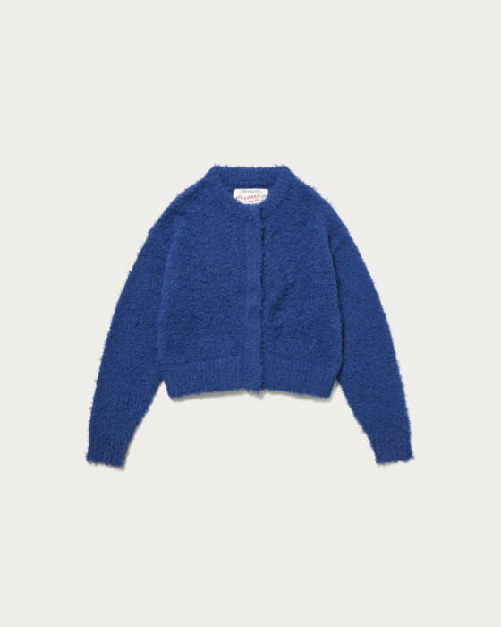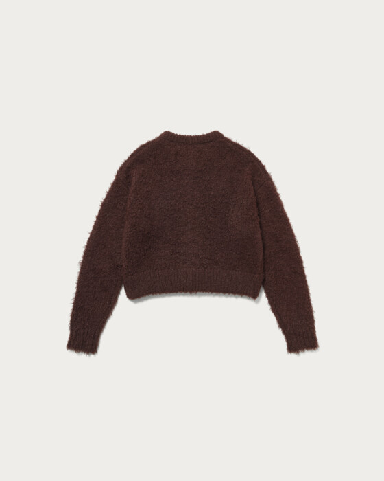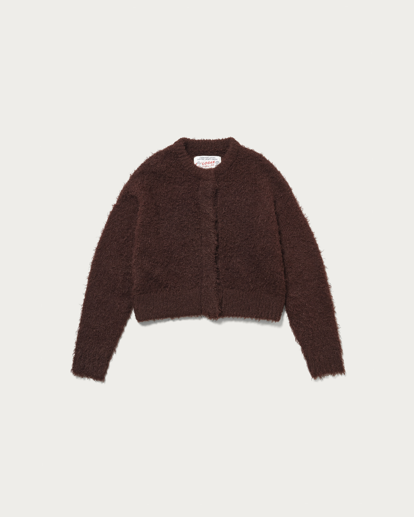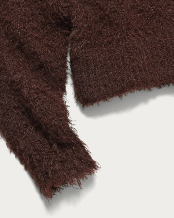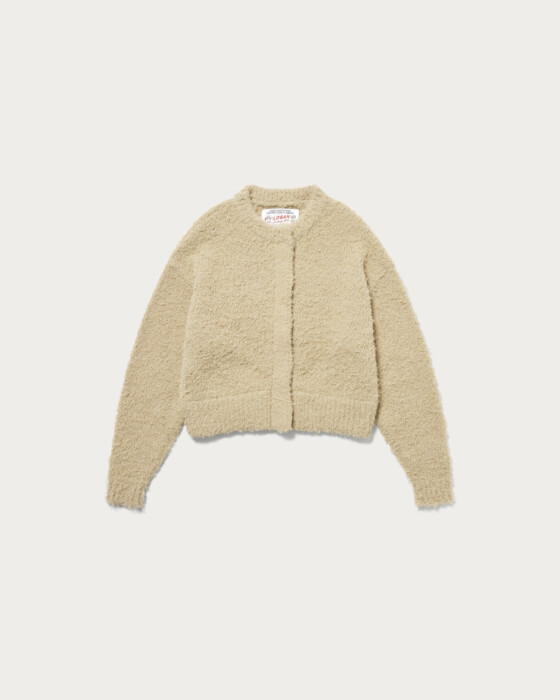 We have specially crafted this cardigan, known for its fluffy and soft texture, from the design stage. By subtly mixing a touch of metallic thread with the brushed yarn, it achieves an elegant finish that gently shimmers with movement. The use of metallic thread in the same color ensures it isn't too flashy, offering a calm impression that perfectly complements a sophisticated feminine style. This standout piece is perfect for the winter season, making a statement all on its own.