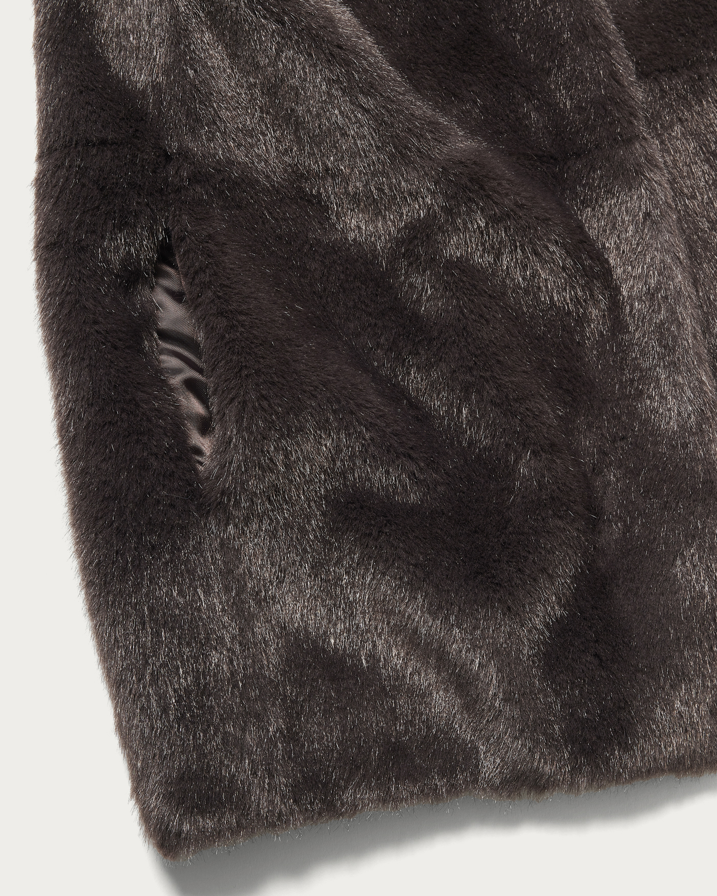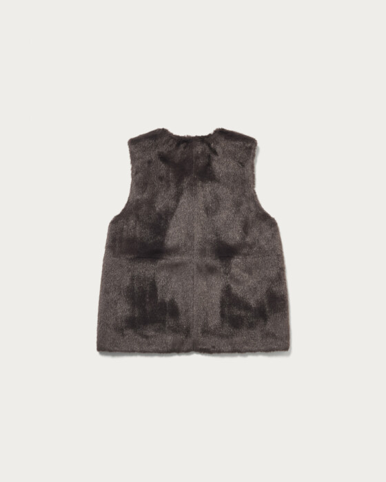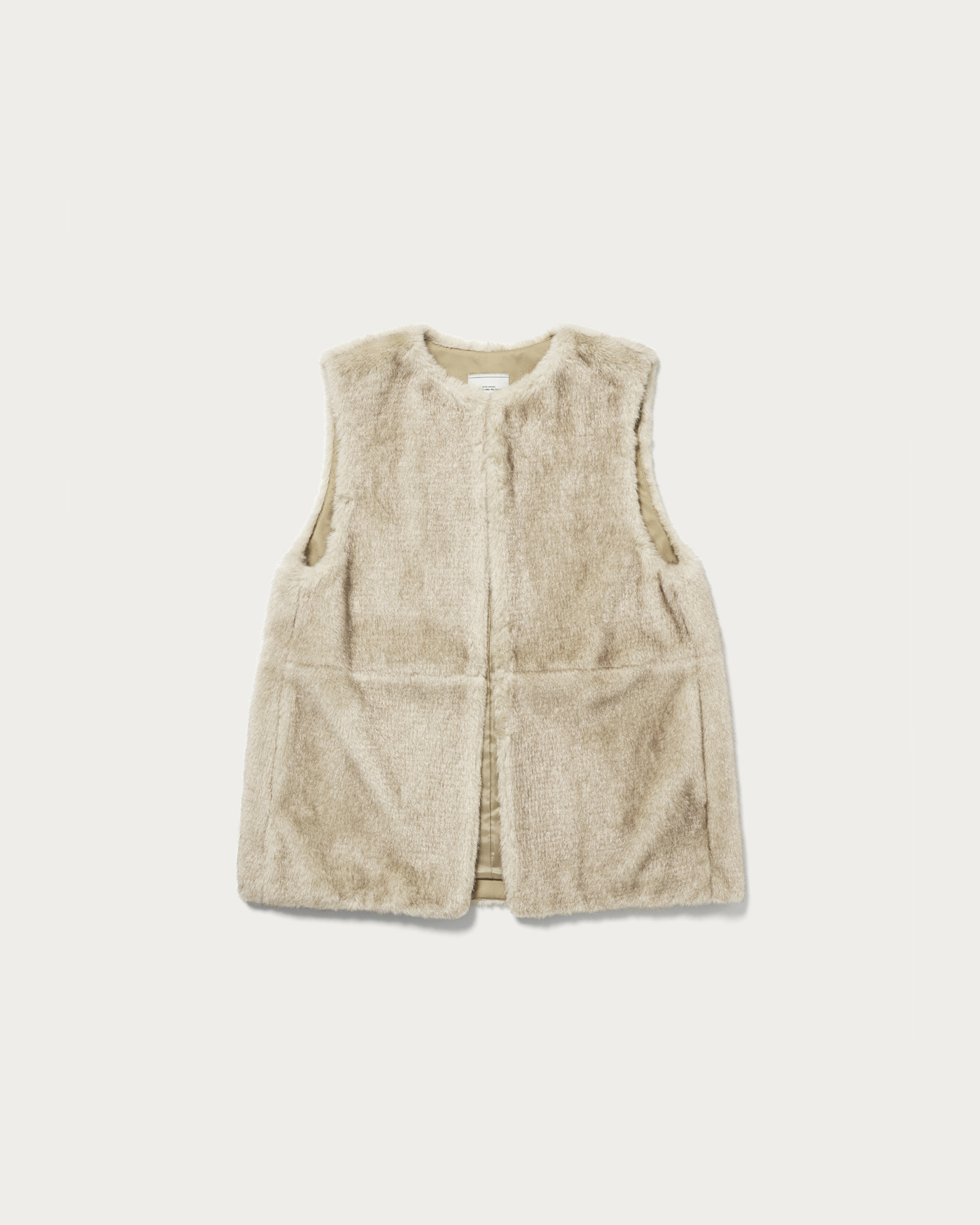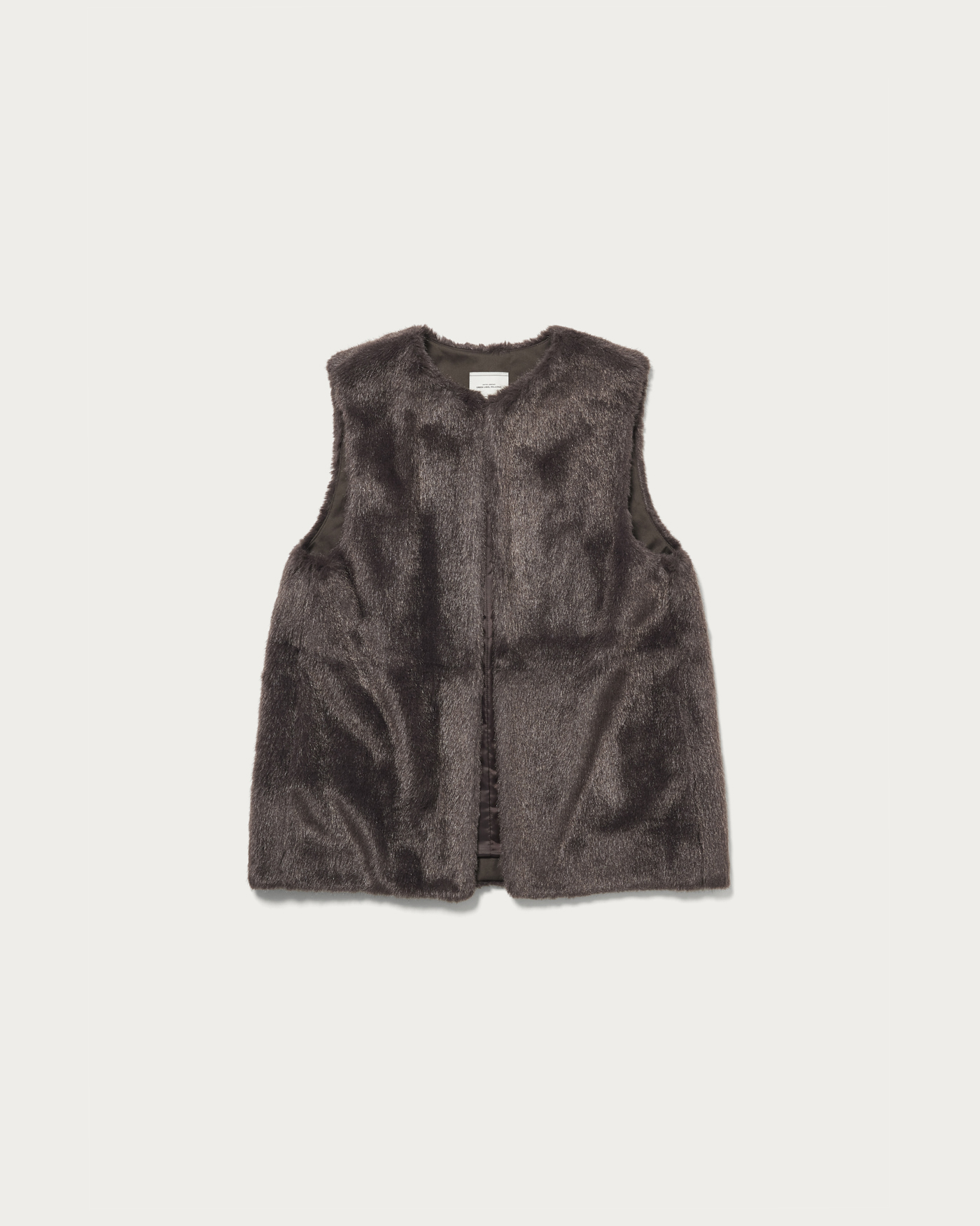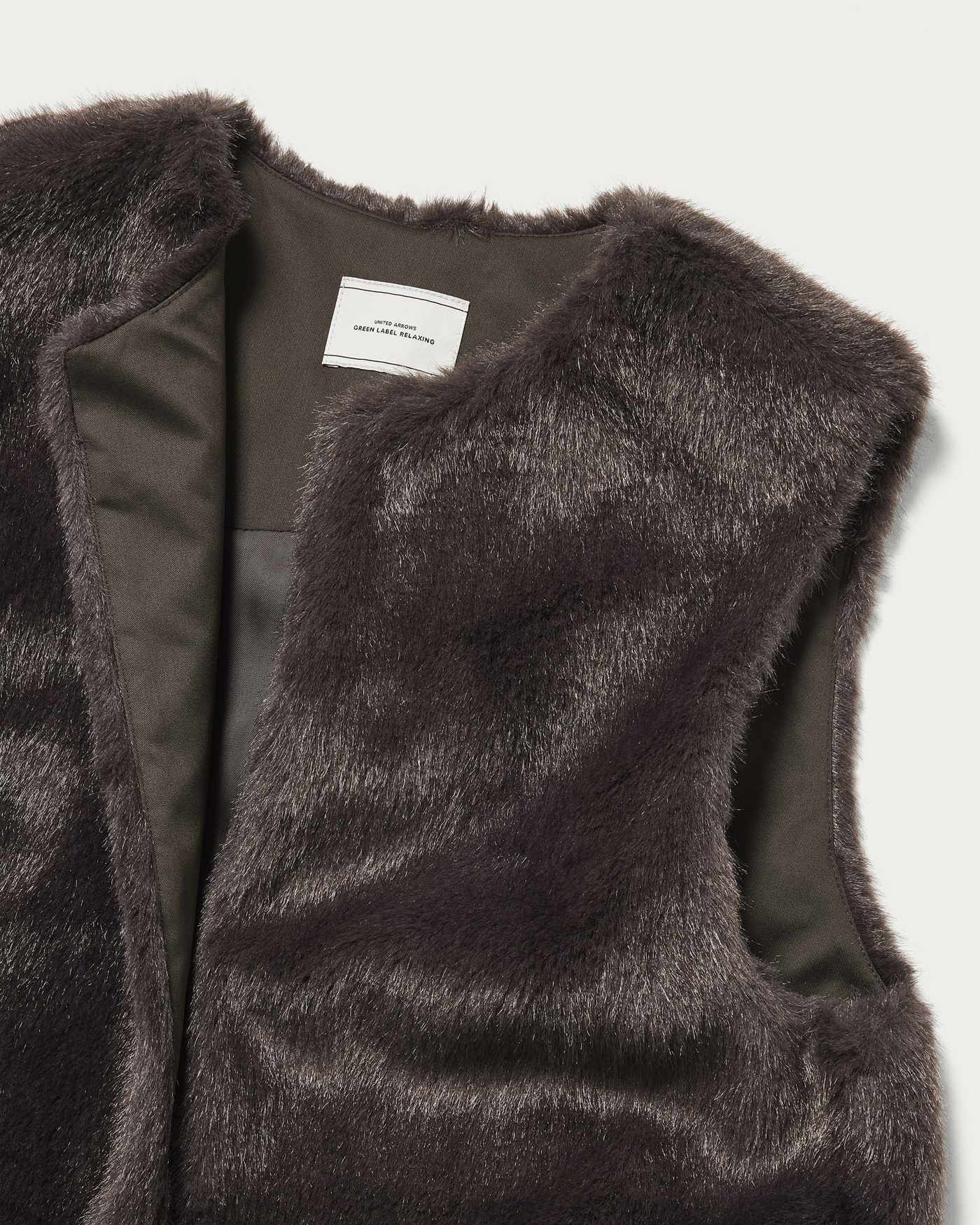 We have prepared a vest made with luxurious faux fur that instantly elevates the winter mood. Just throw it on, and your styling is complete. With a perfect length that covers the hips, it pairs easily with both pants and skirts. Additionally, the waist is tailored to naturally draw the eye upward, offering a flattering silhouette. This is a recommended item that balances seasonal appeal with ease of wear.