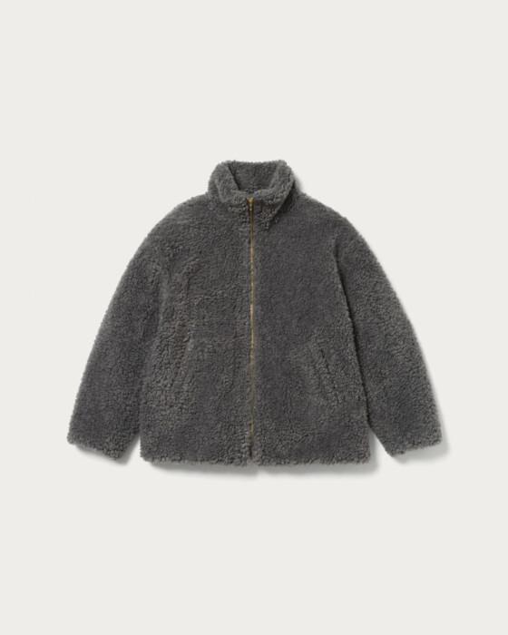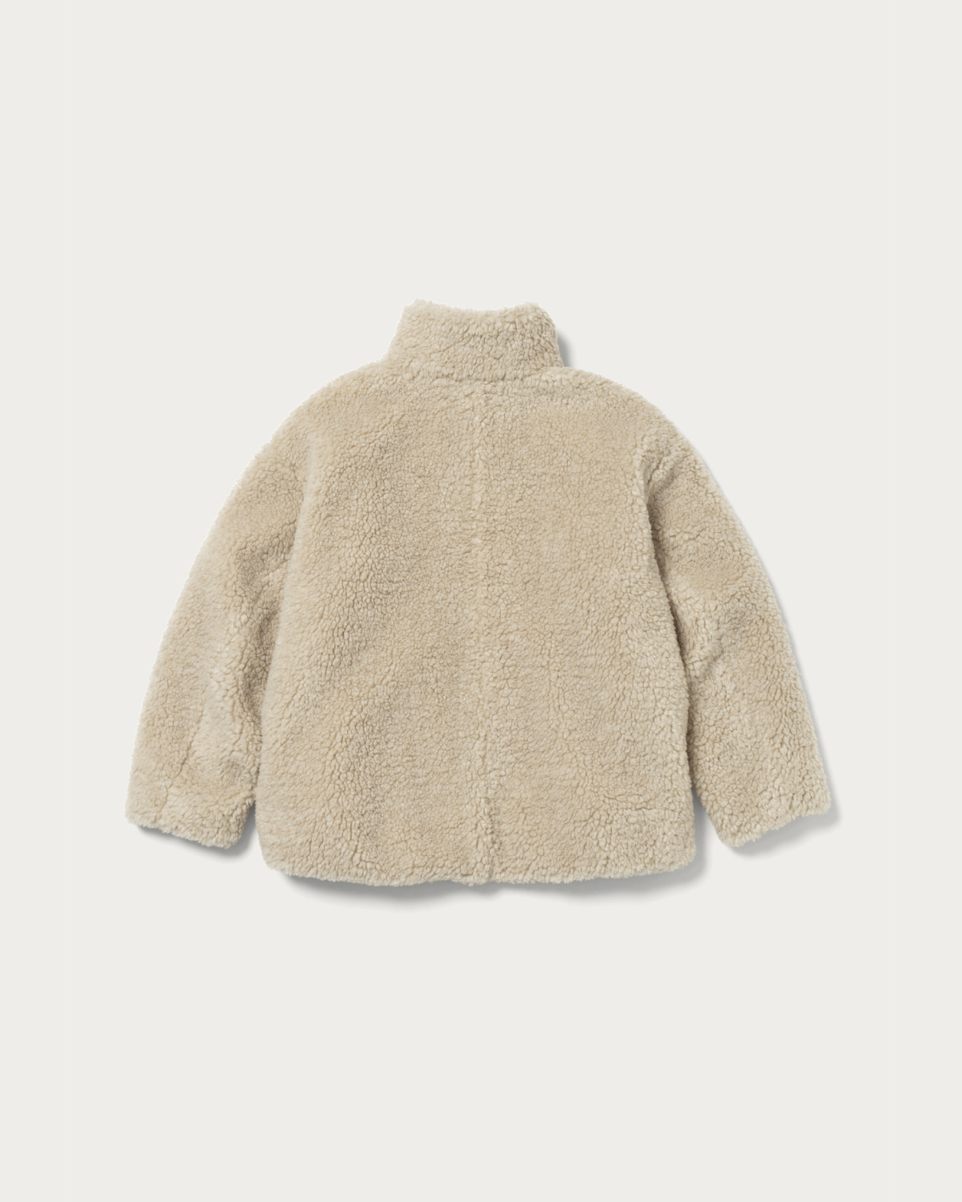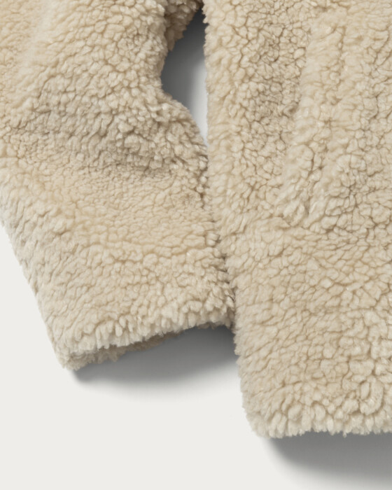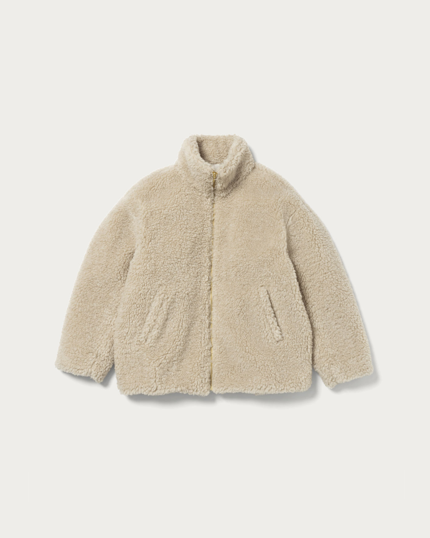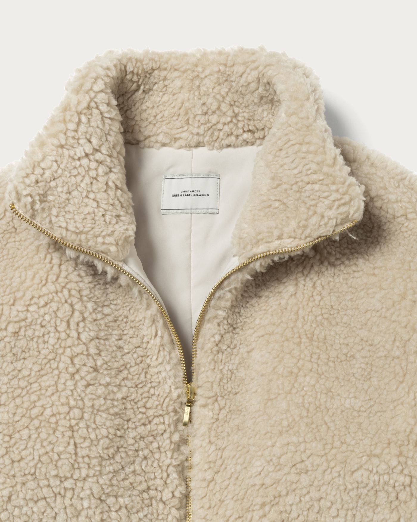 This boa blouson features a plush, voluminous texture and a soft touch that is truly captivating. The material used is 100% high-quality recycled polyester from France's ECOPEL, a company that prioritizes environmental and social considerations. The blouson is adorned with gold accents, giving it an elegant and feminine impression. The hem is designed with a drawstring, allowing you to create a charming cocoon silhouette.