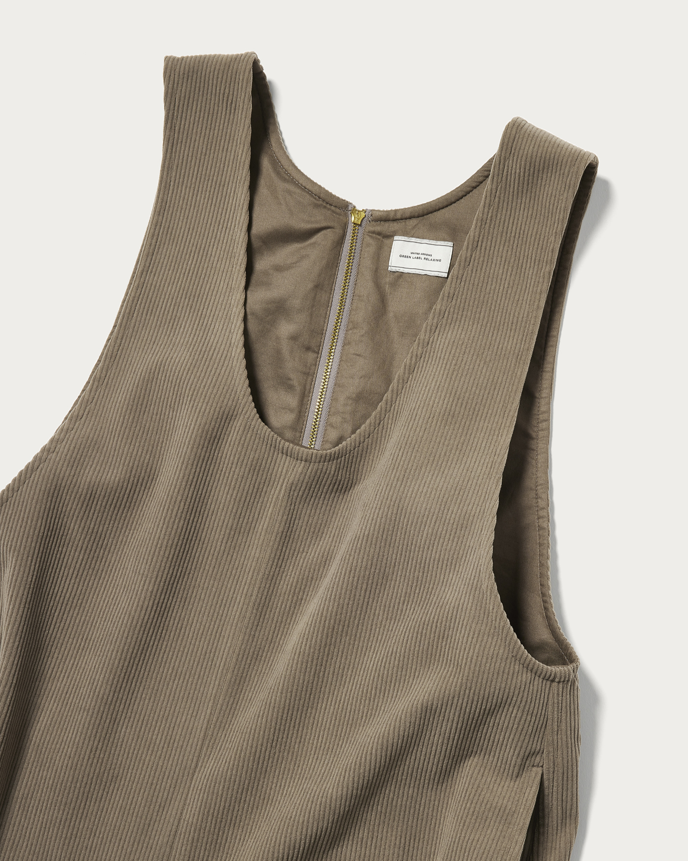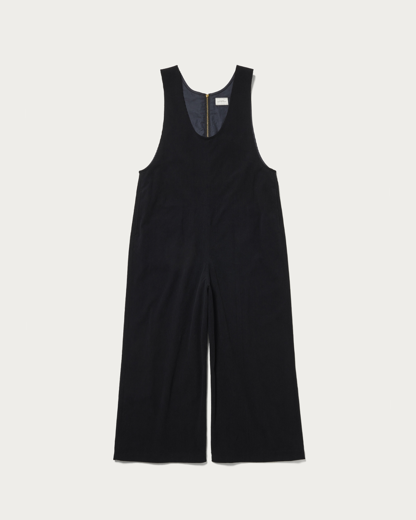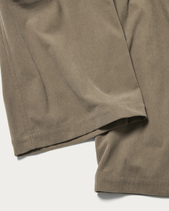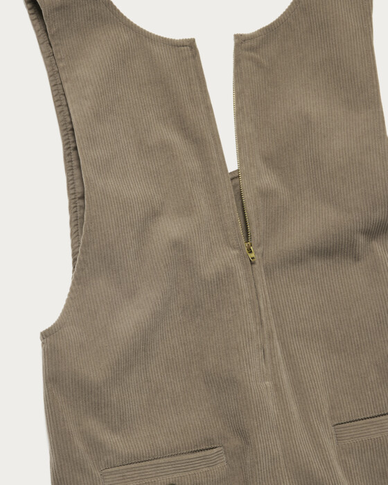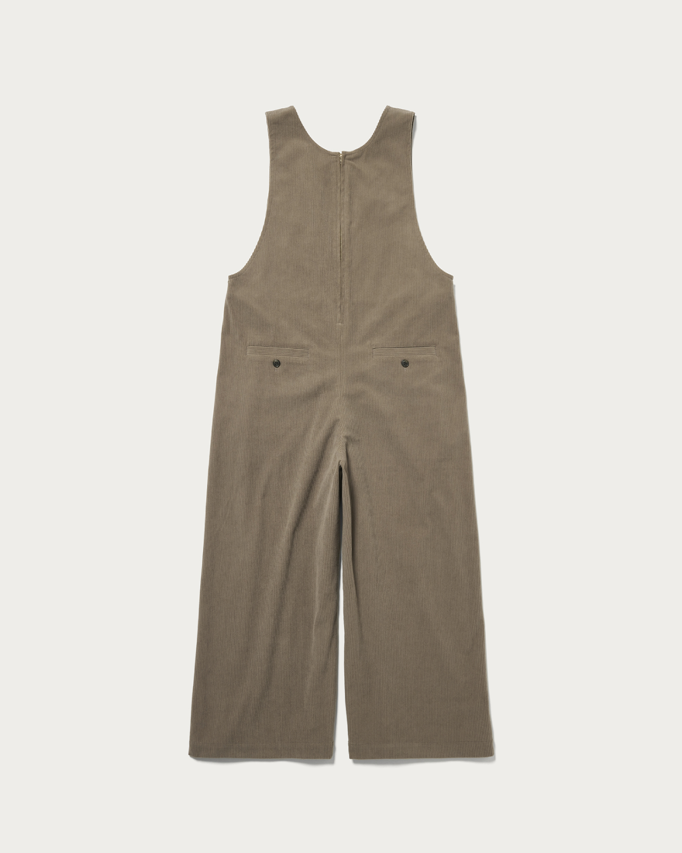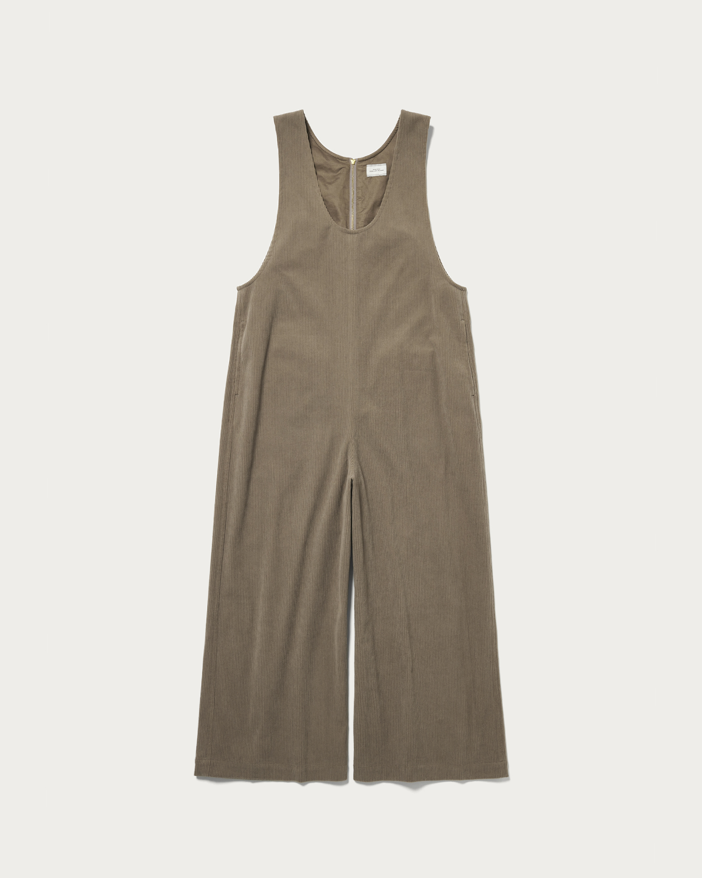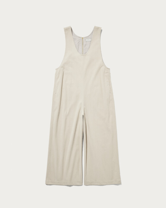 This is a wide silhouette jumpsuit that doesn't flare out too much. The deep neckline adds a touch of effortless style, and the back zipper makes it easy to put on and take off. Made from jersey material, it offers high elasticity and exceptional ease of movement. The unique faded color of the corduroy gives it a sophisticated and stylish look.