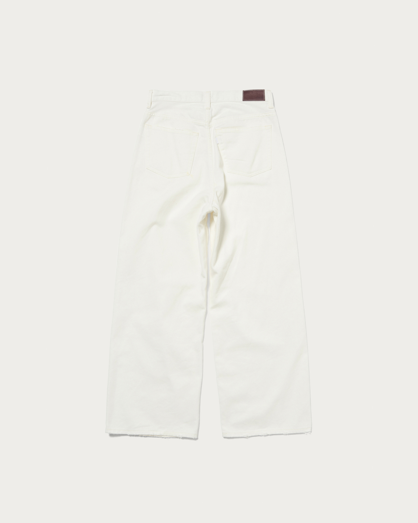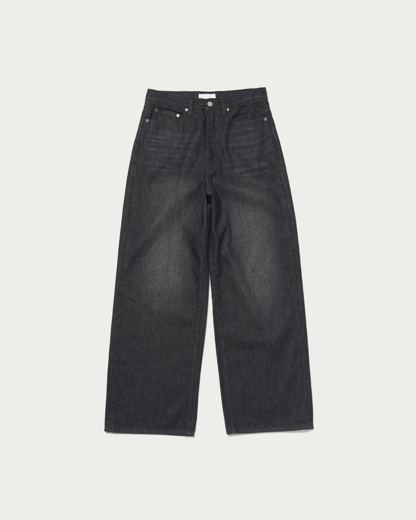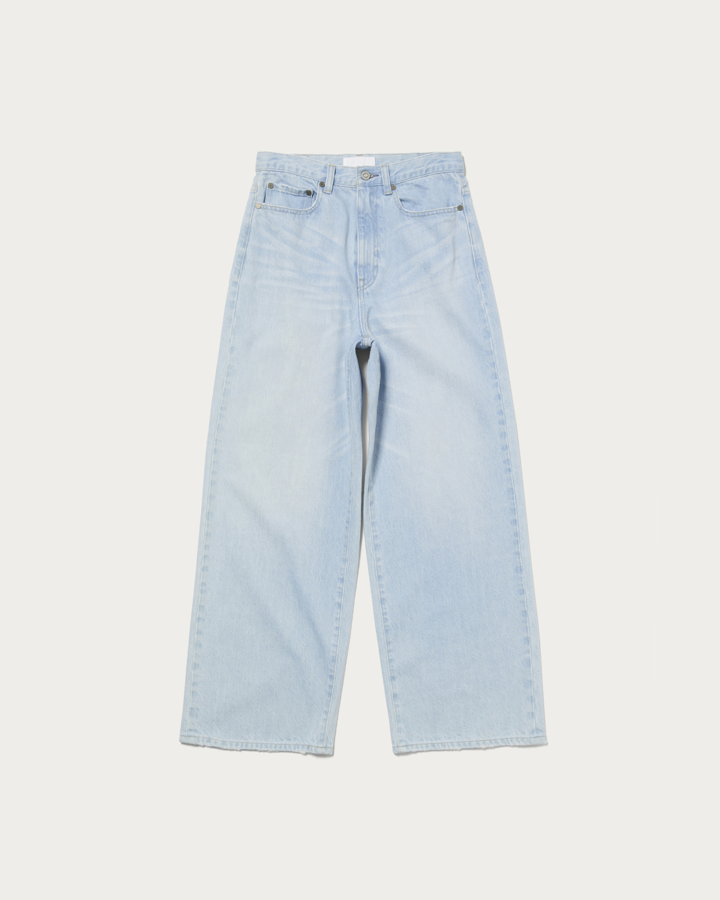 The denim pants with a moderately relaxed wide straight silhouette are designed for a light and comfortable fit that emphasizes relaxation. The line from the waist to the mid-hip is carefully crafted to create a sleek appearance. Subtle distressed detailing at the hem adds an accent. The material is 10.5-ounce, providing a perfect balance of thickness while ensuring a soft and comfortable wearing experience.