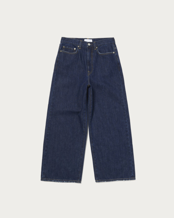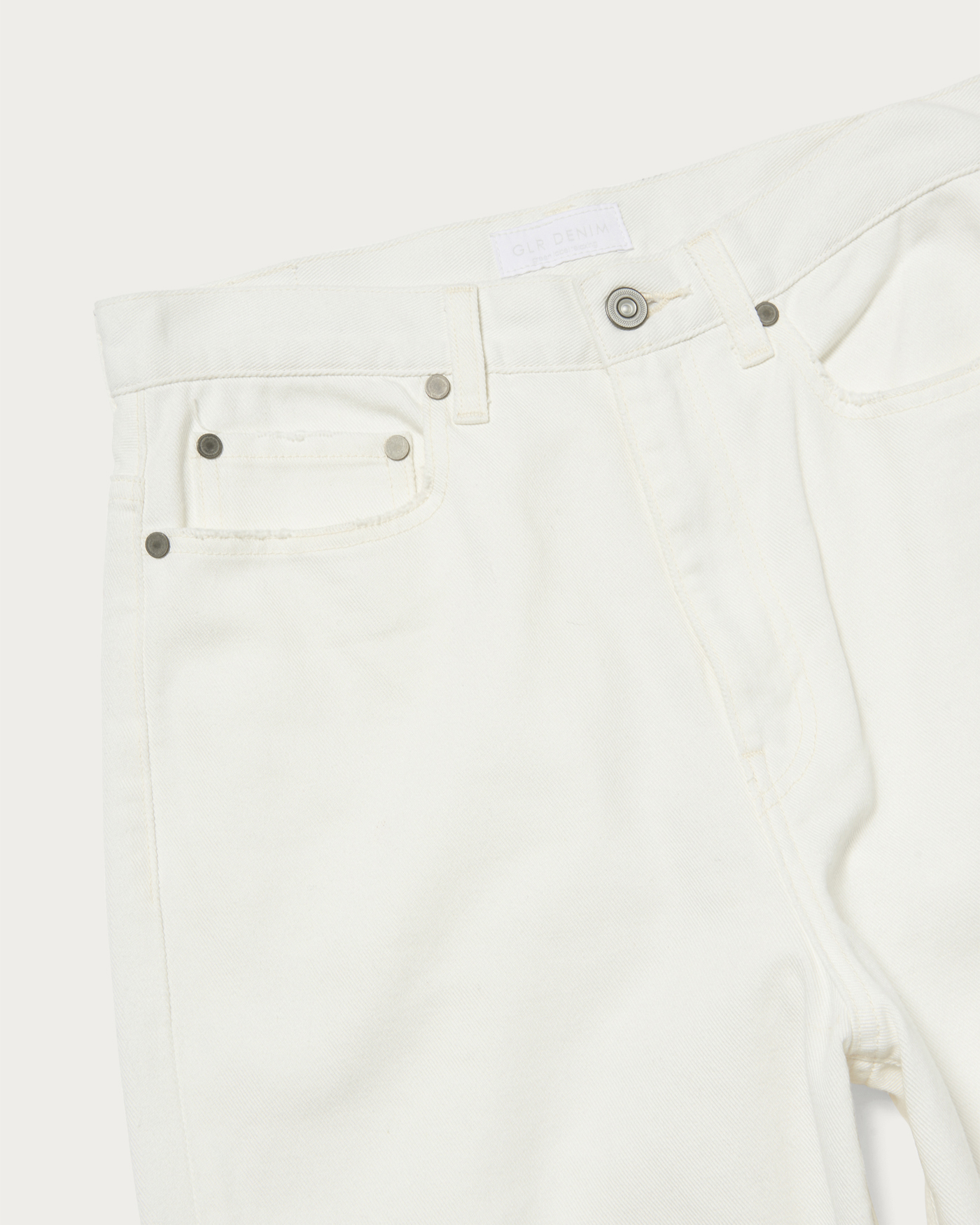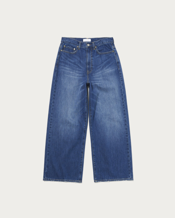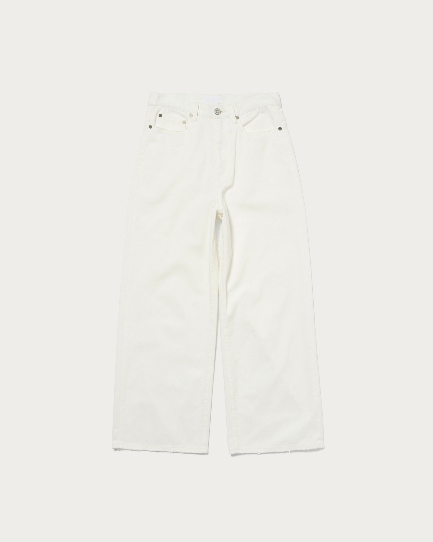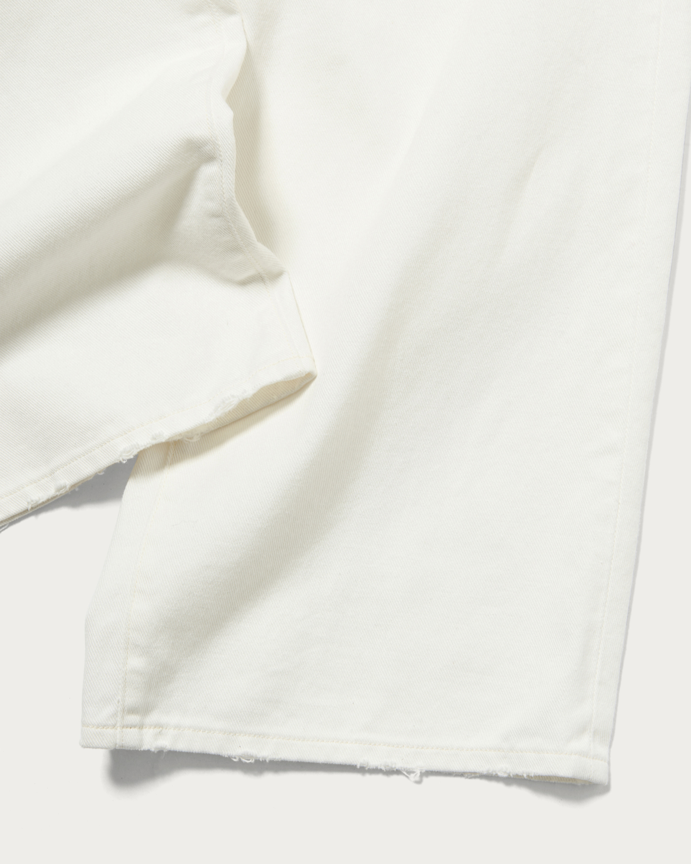 The denim pants with a moderately relaxed wide straight silhouette are designed for a light and comfortable fit that emphasizes relaxation. The line from the waist to the mid-hip is carefully crafted to create a sleek appearance. Subtle distressed detailing at the hem adds an accent. The material is 10.5-ounce, providing a perfect balance of thickness while ensuring a soft and comfortable wearing experience.