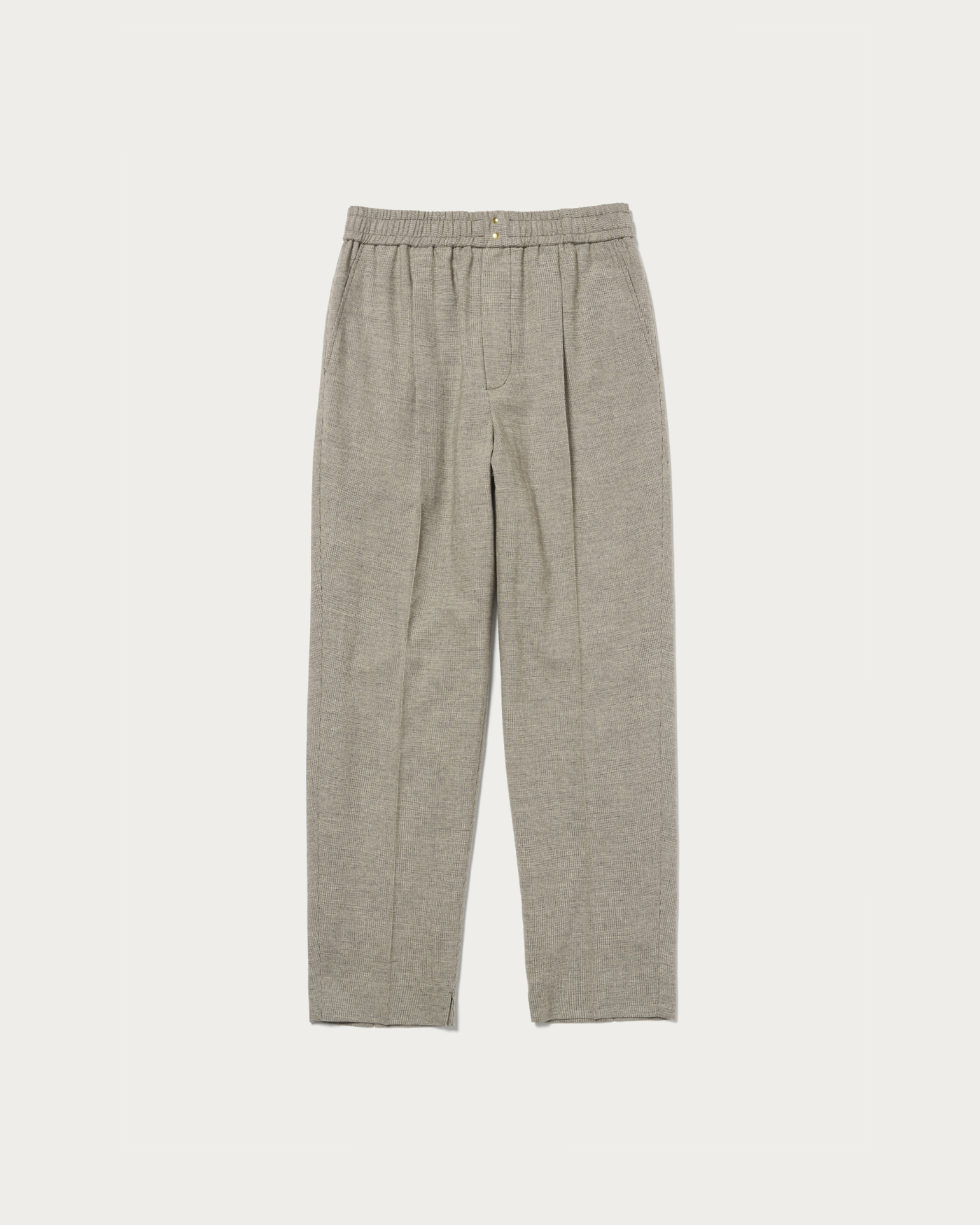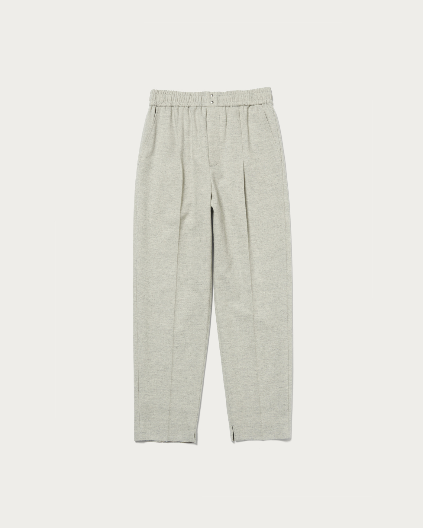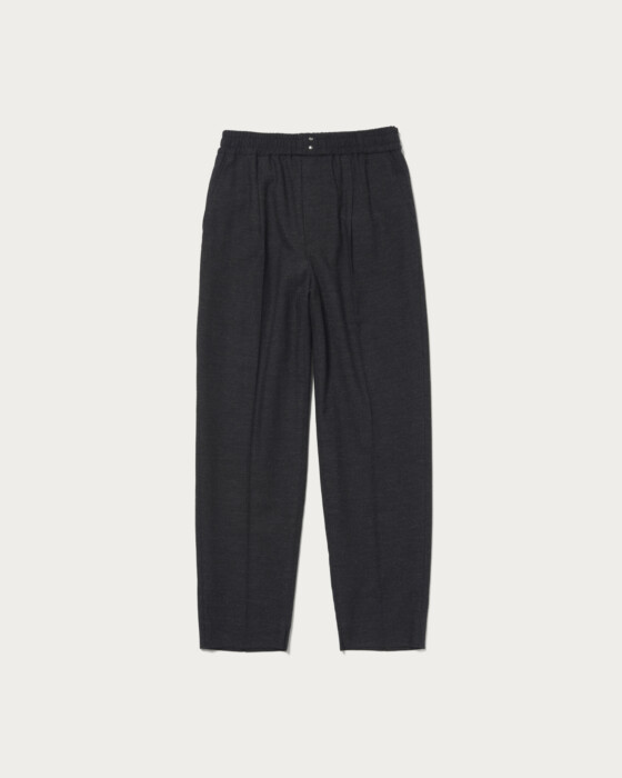 The wide tapered silhouette pants made from lightweight Saxony fabric offer the warmth and elegant silhouette unique to wool. The elastic waistband provides a relaxed feel, while the amount of gathering around the waist is moderately adjusted, allowing for a look that is not overly casual.