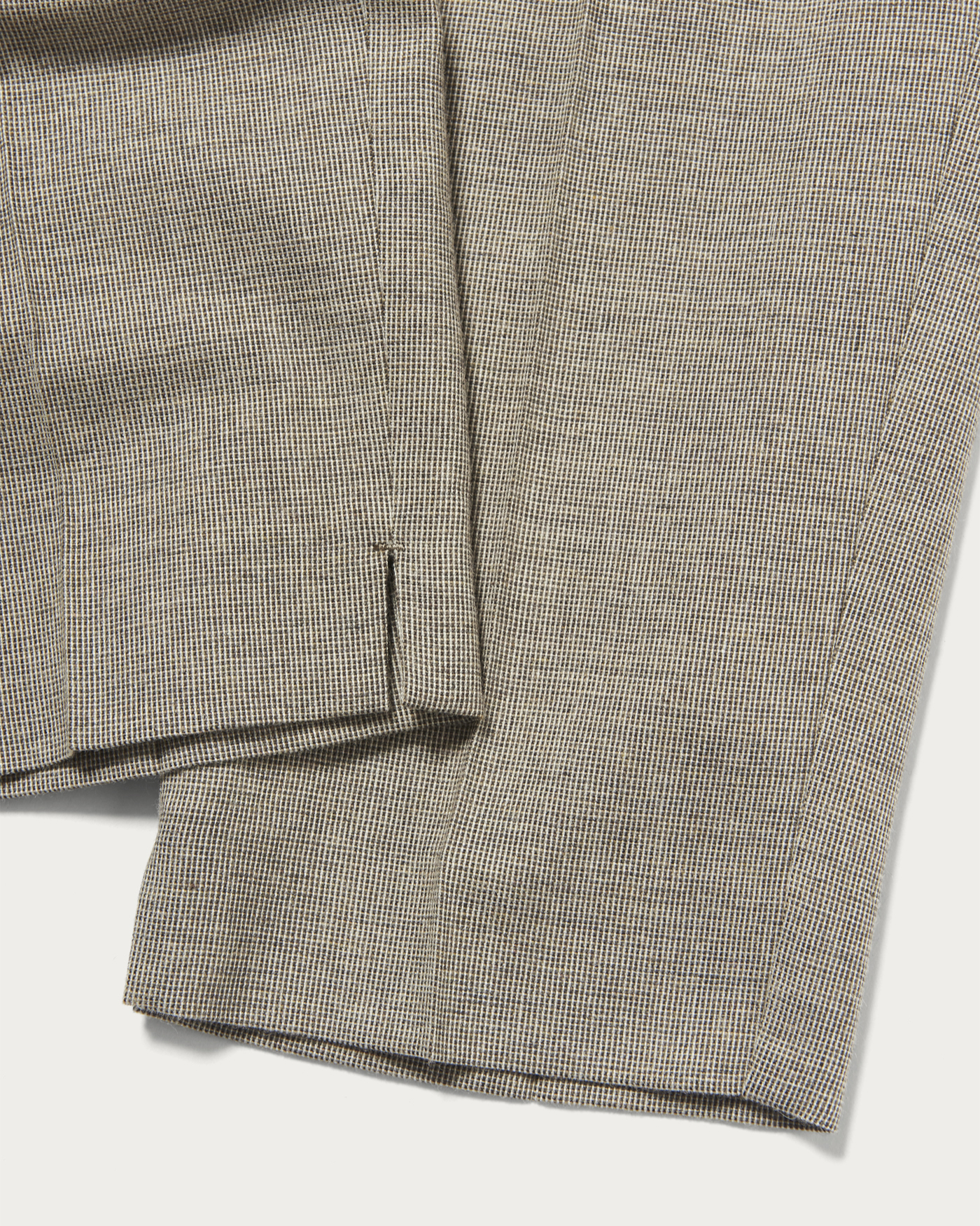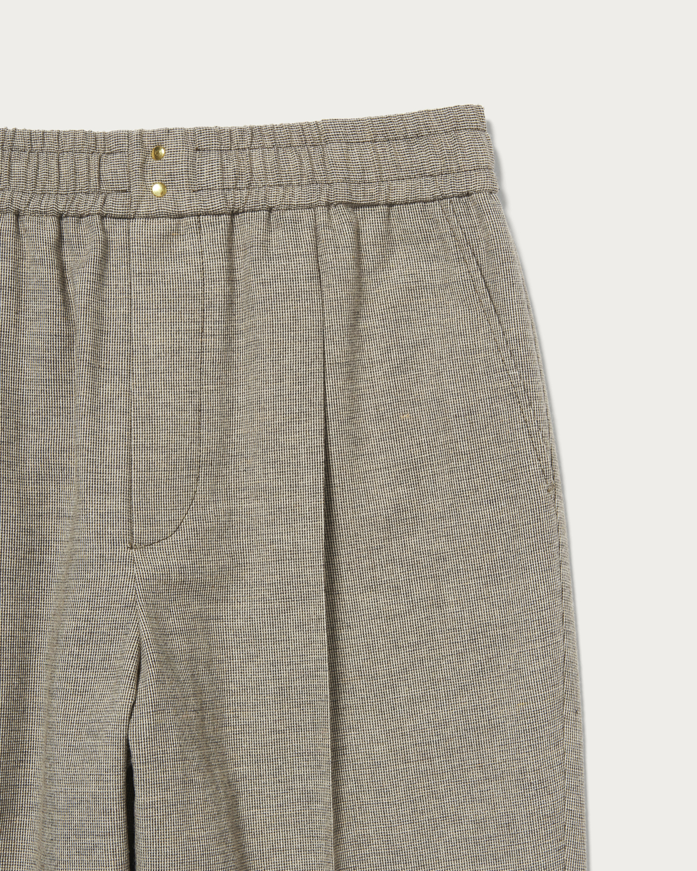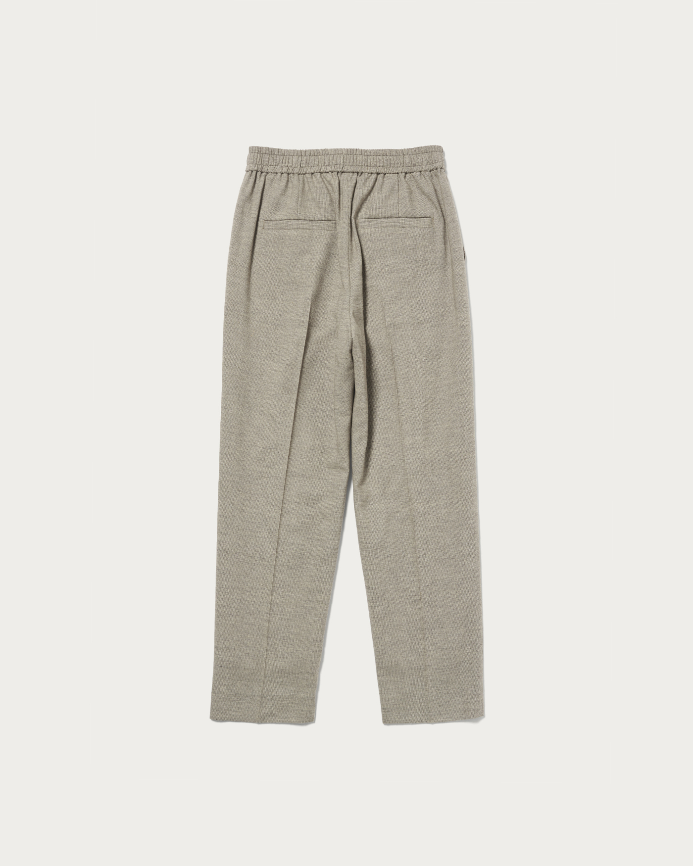The wide tapered silhouette pants made from lightweight Saxony fabric offer the warmth and elegant silhouette unique to wool. The elastic waistband provides a relaxed feel, while the amount of gathering around the waist is moderately adjusted, allowing for a look that is not overly casual.