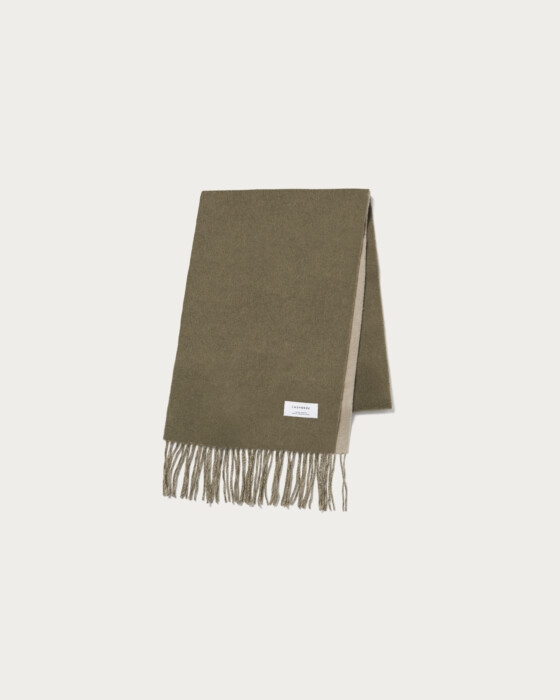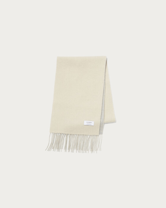 This is a reversible scarf luxuriously made with white cashmere. Both sides feature easy-to-use color combinations, allowing you to enjoy it according to the occasion or your mood. Its thickness and structure provide a striking and elegant way to wear it, despite its scarf size. The unique texture of cashmere, known for being light and soft, feels pleasant against the skin, offering a comfortable wearing experience.