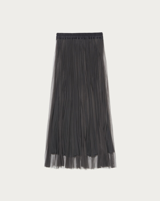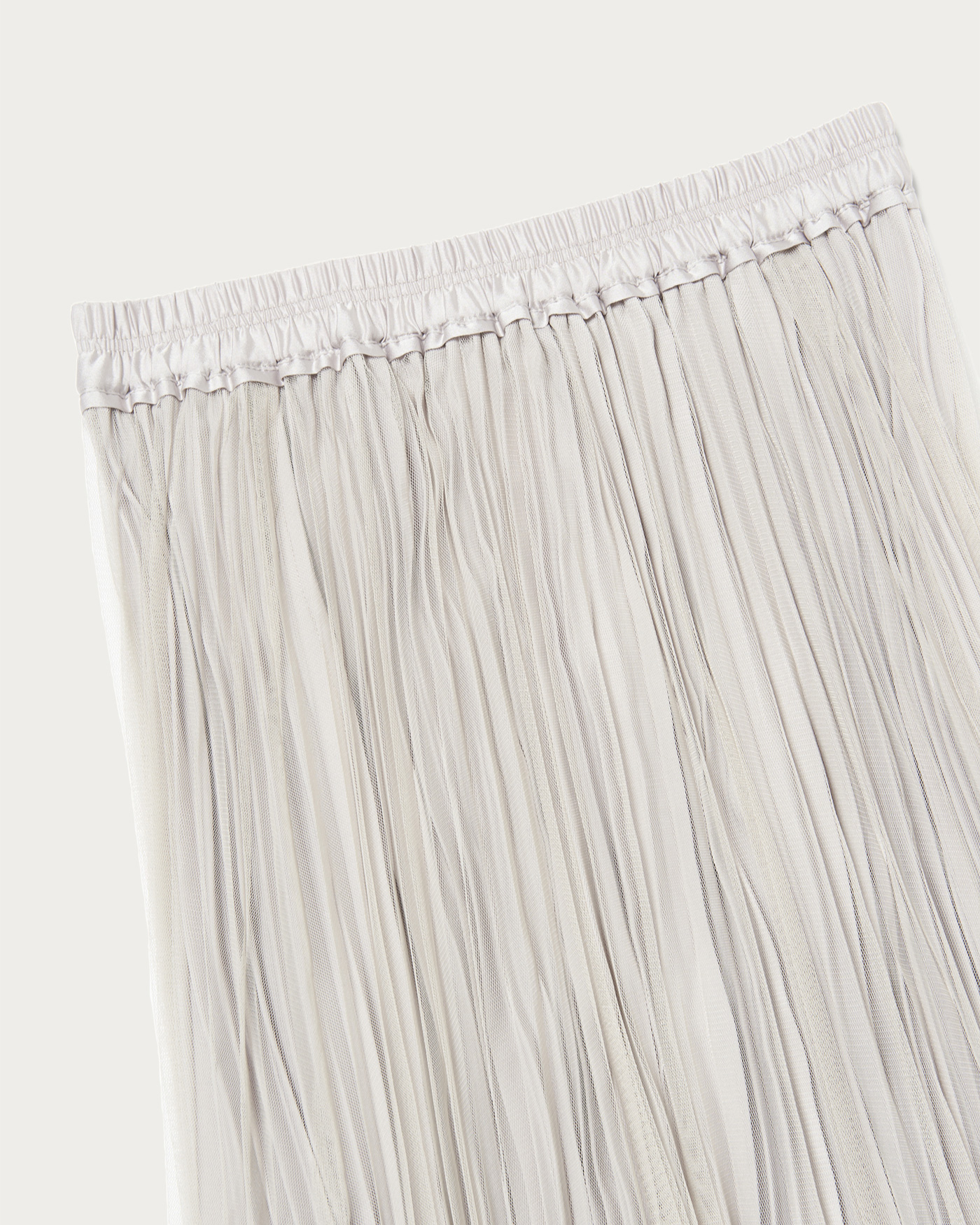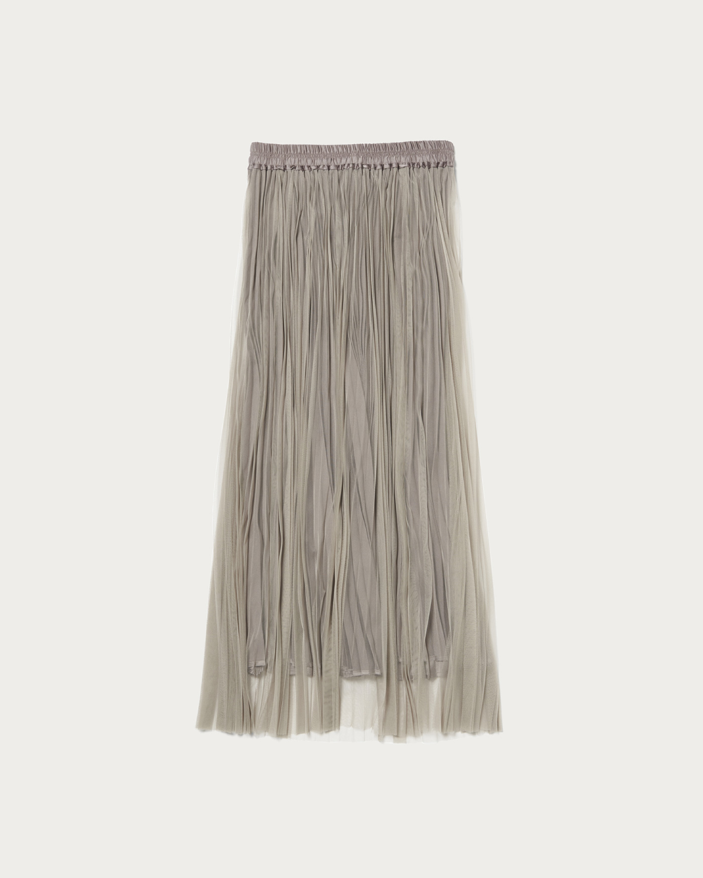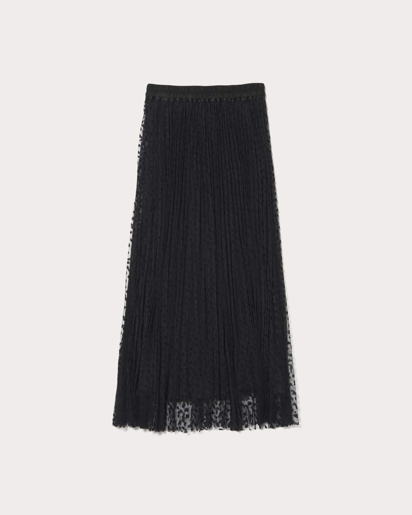 A reversible piece featuring tulle and pleated satin, allowing you to change its look to match your mood or styling. This season's new pattern is characterized by dot prints with a leopard-like nuance, adding a subtle touch of playfulness. It's a design that combines elegance with a sense of trendiness.