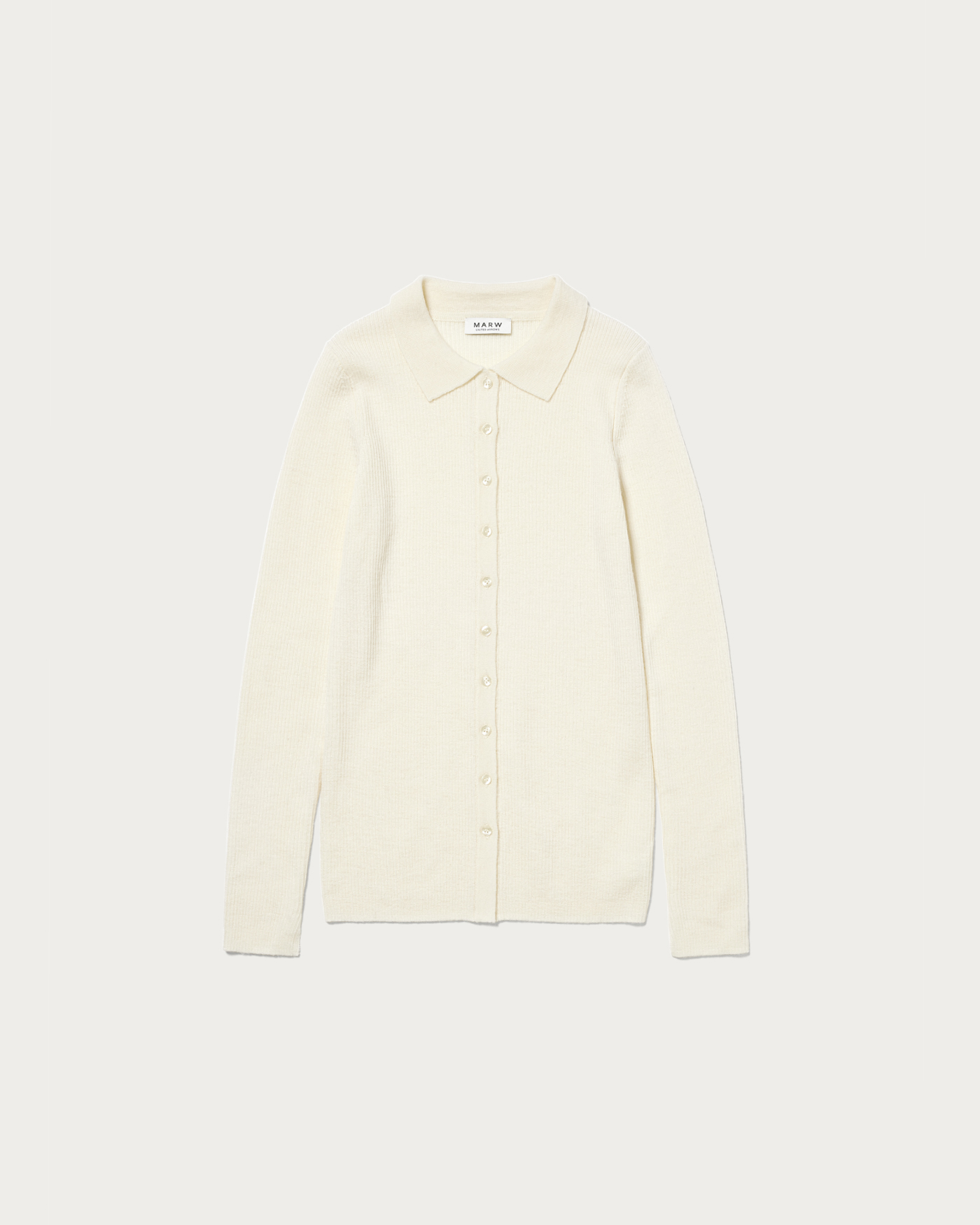 A cardigan with a collar featuring fine ribbing that gives an elegant impression. It has been crafted with a compact fit to create a chic, modern look. You can enjoy styling it to your preference by adjusting the button opening to balance with your bottoms.