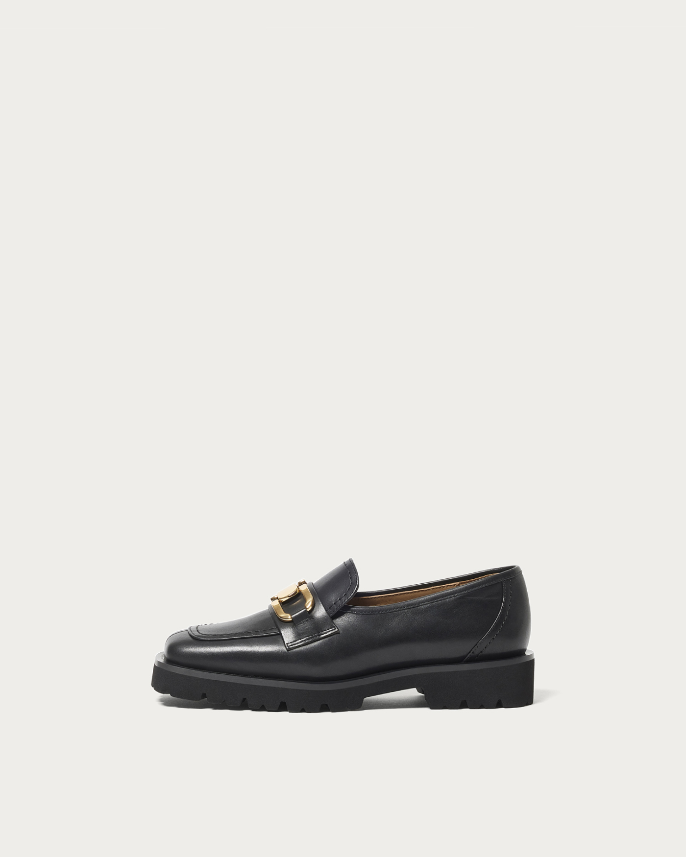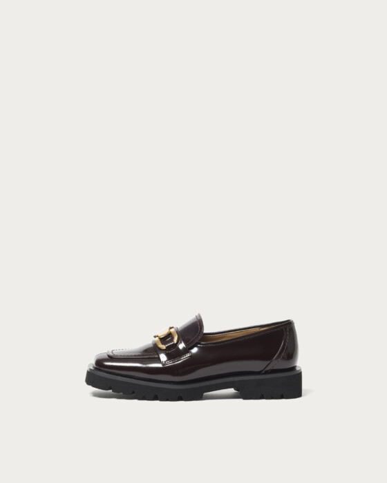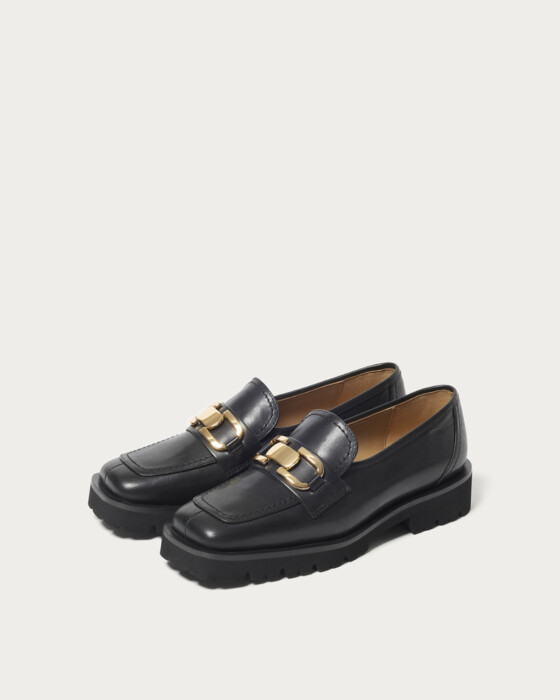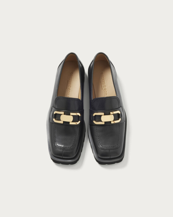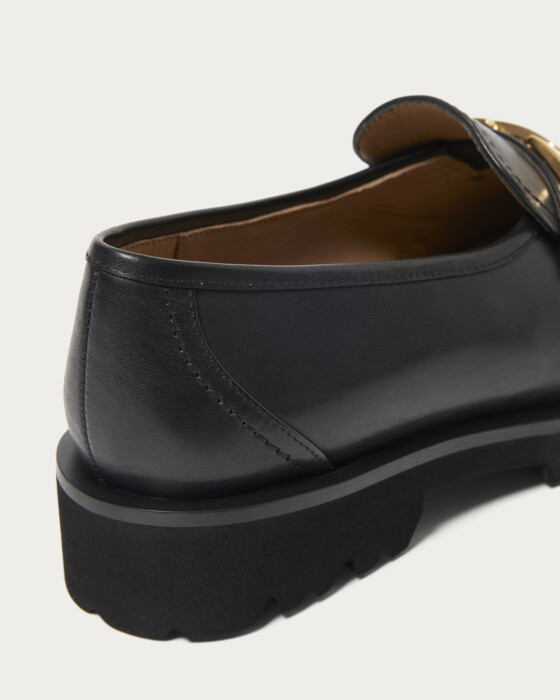 A deep-vamp loafer adorned with a striking bit detail. The thick rubber sponge sole adds just the right amount of volume, perfectly balancing your fall and winter styling. The instep features an inner elastic design for easy on and off. These loafers pair beautifully with a feminine look, such as a skirt with ribbed socks, and also complement a mannish style by peeking the hardware through wide pants.