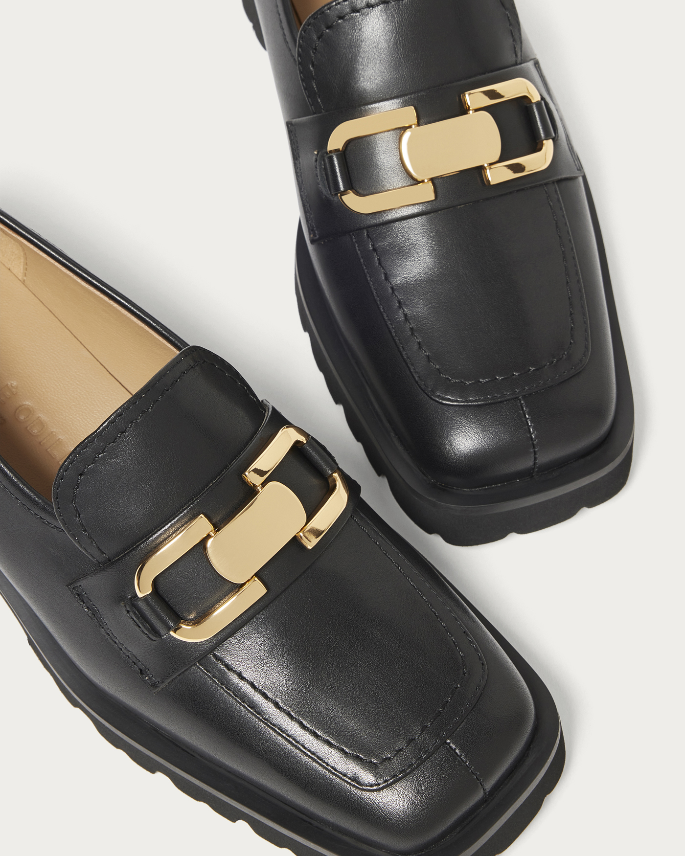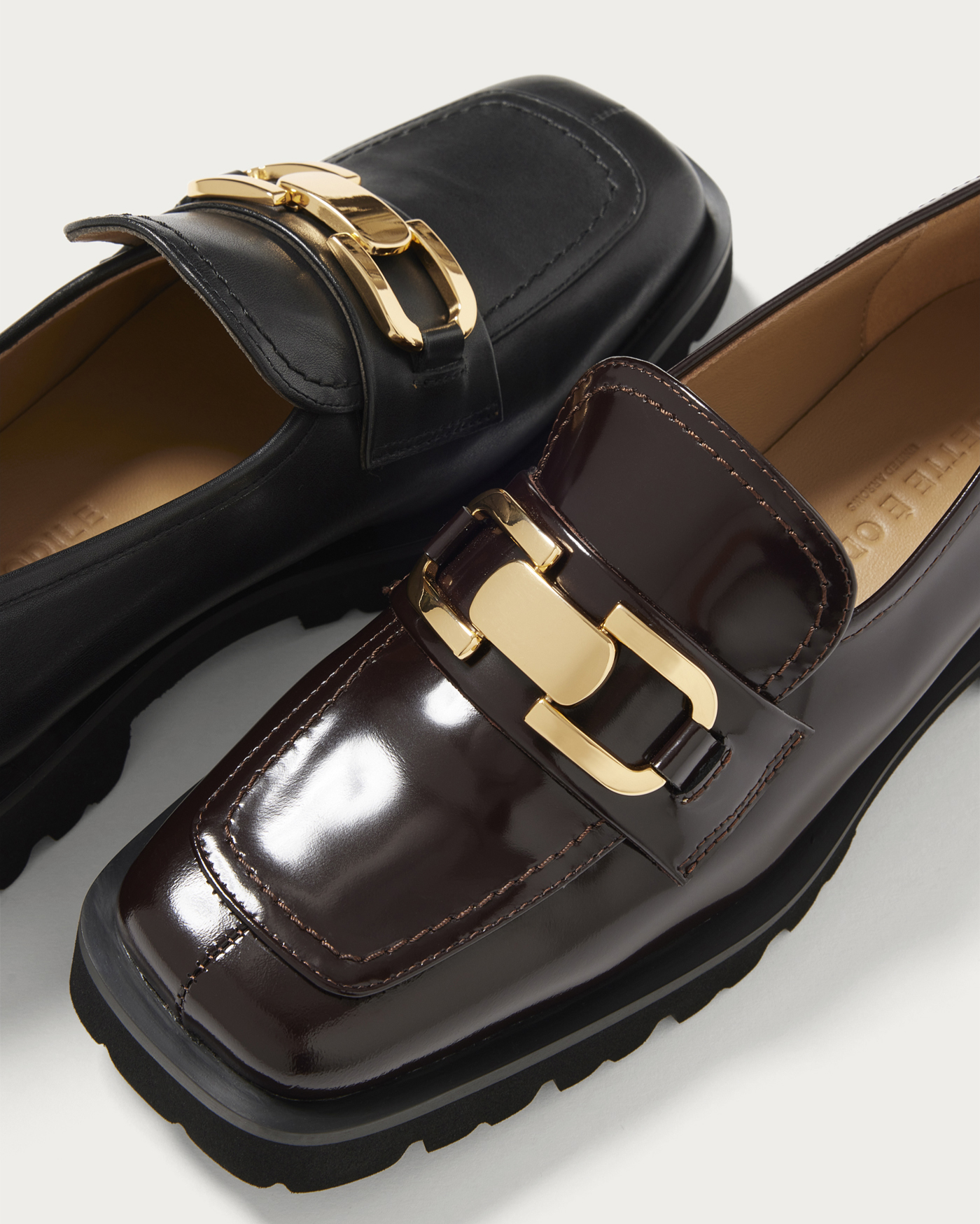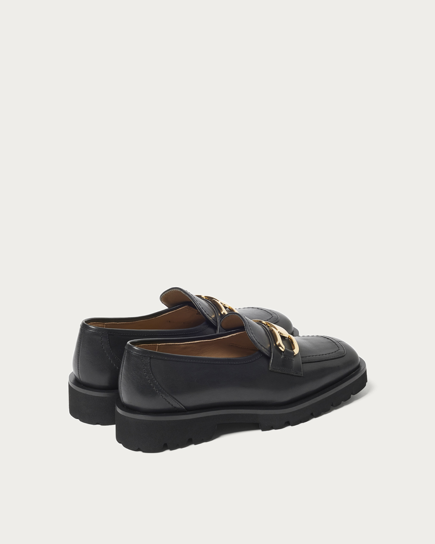 A deep-vamp loafer adorned with a striking bit detail. The thick rubber sponge sole adds just the right amount of volume, perfectly balancing your fall and winter styling. The instep features an inner elastic design for easy on and off. These loafers pair beautifully with a feminine look, such as a skirt with ribbed socks, and also complement a mannish style by peeking the hardware through wide pants.