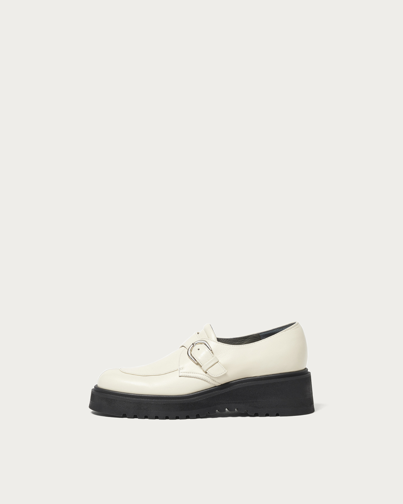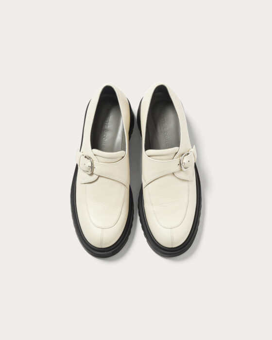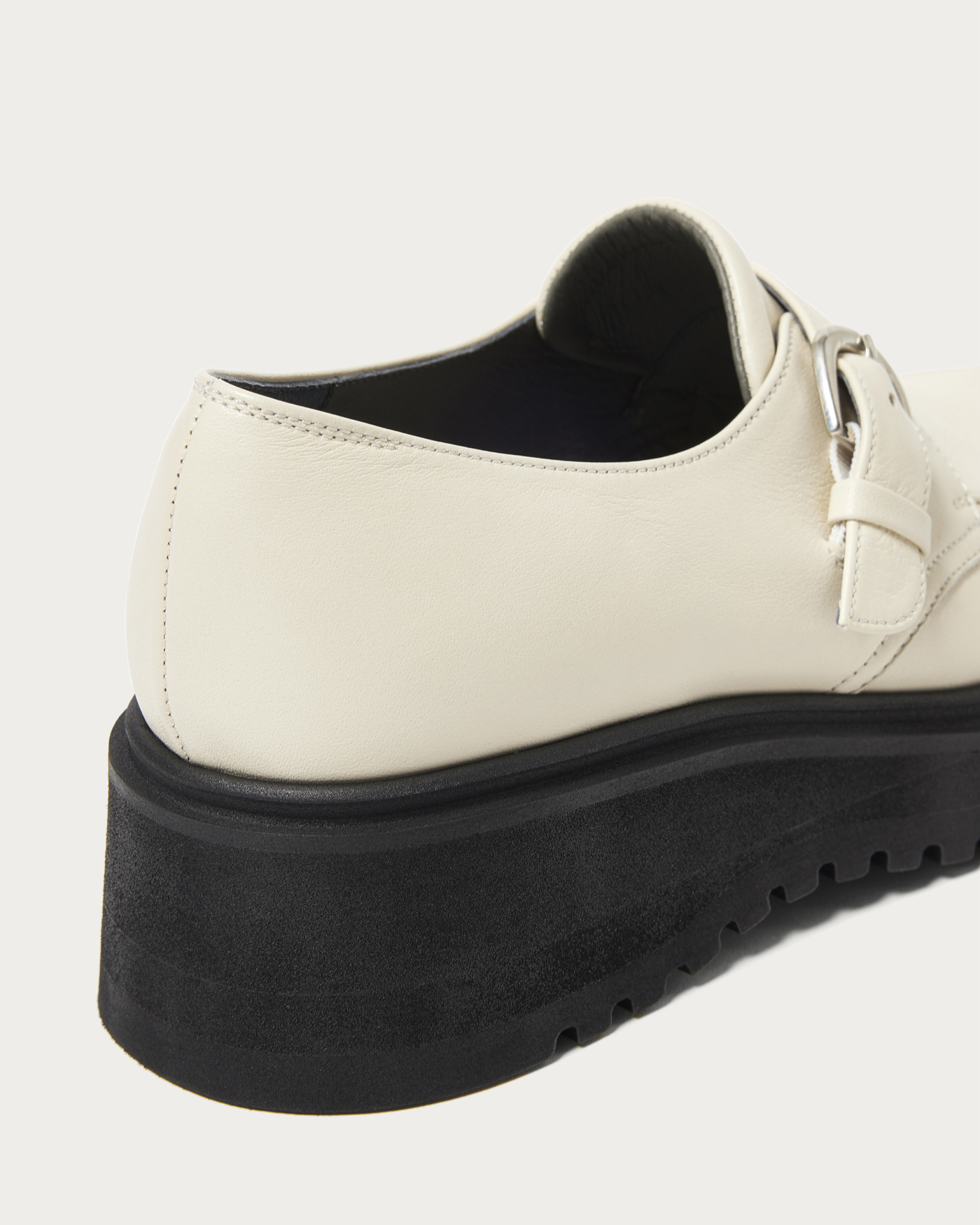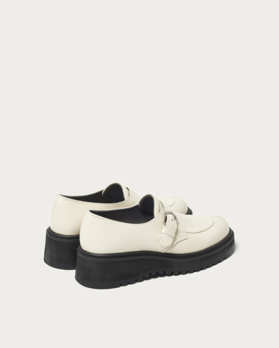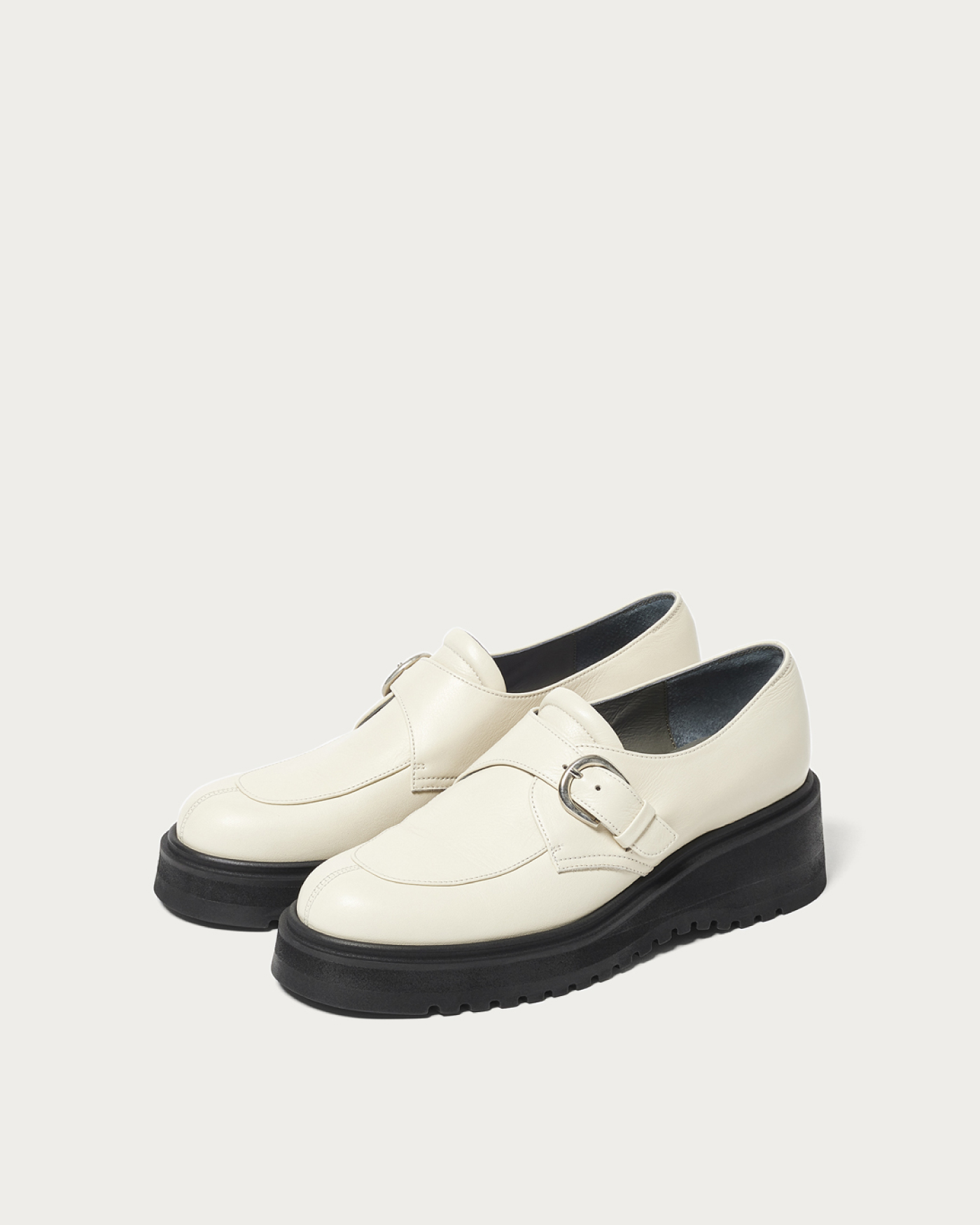 Monk strap shoes with platform-style thick soles that make a statement. The use of sponge on the tongue enhances comfort and fit. The black version features semi-matte glass leather, while the natural version uses soft smooth leather. These shoes aim to elevate your style while maintaining a sophisticated elegance suitable for adults.