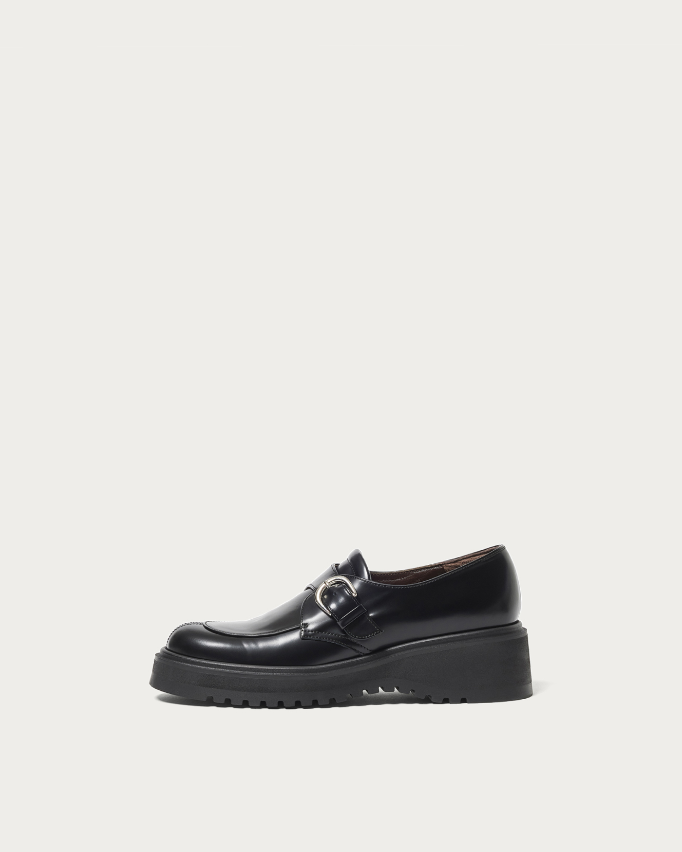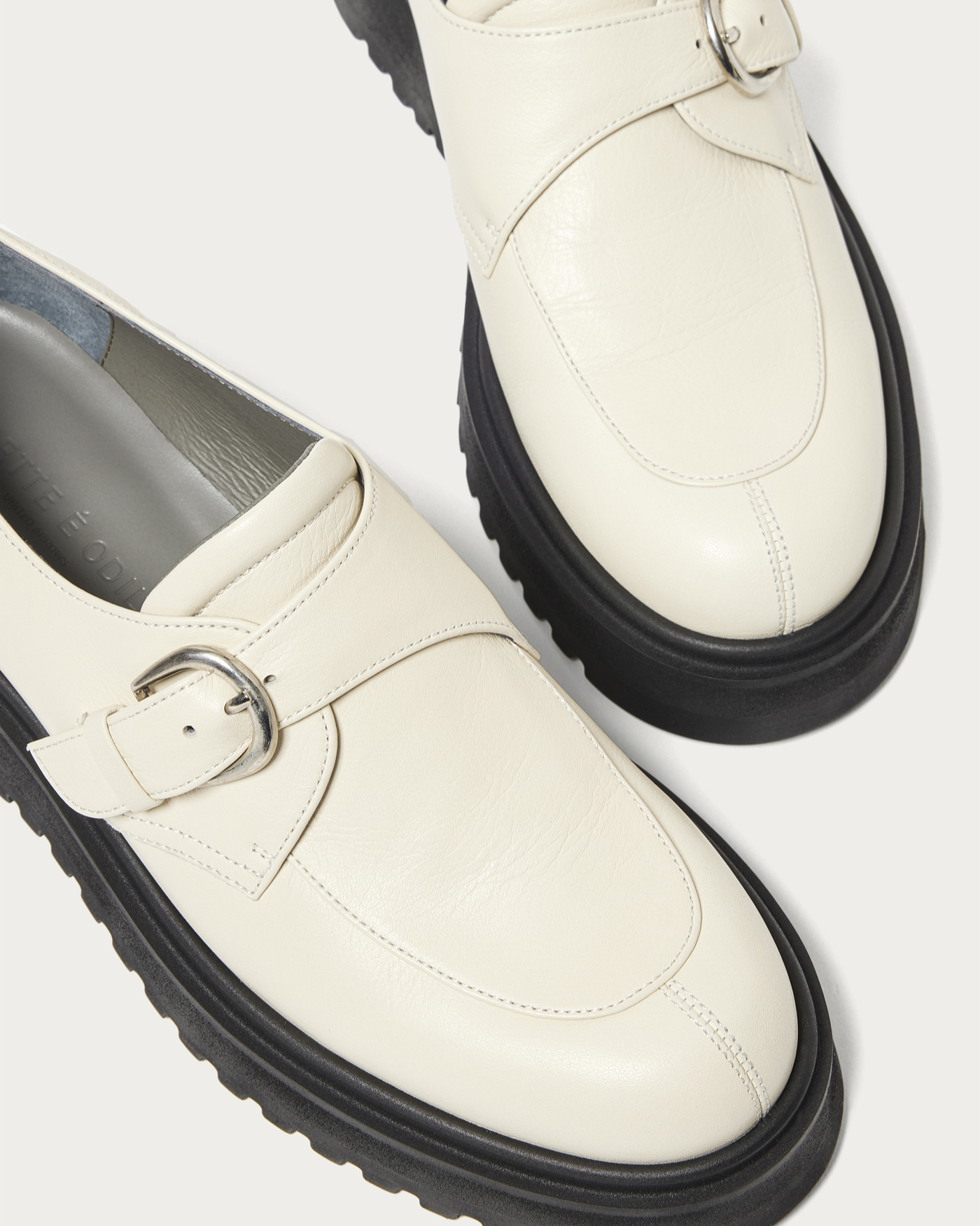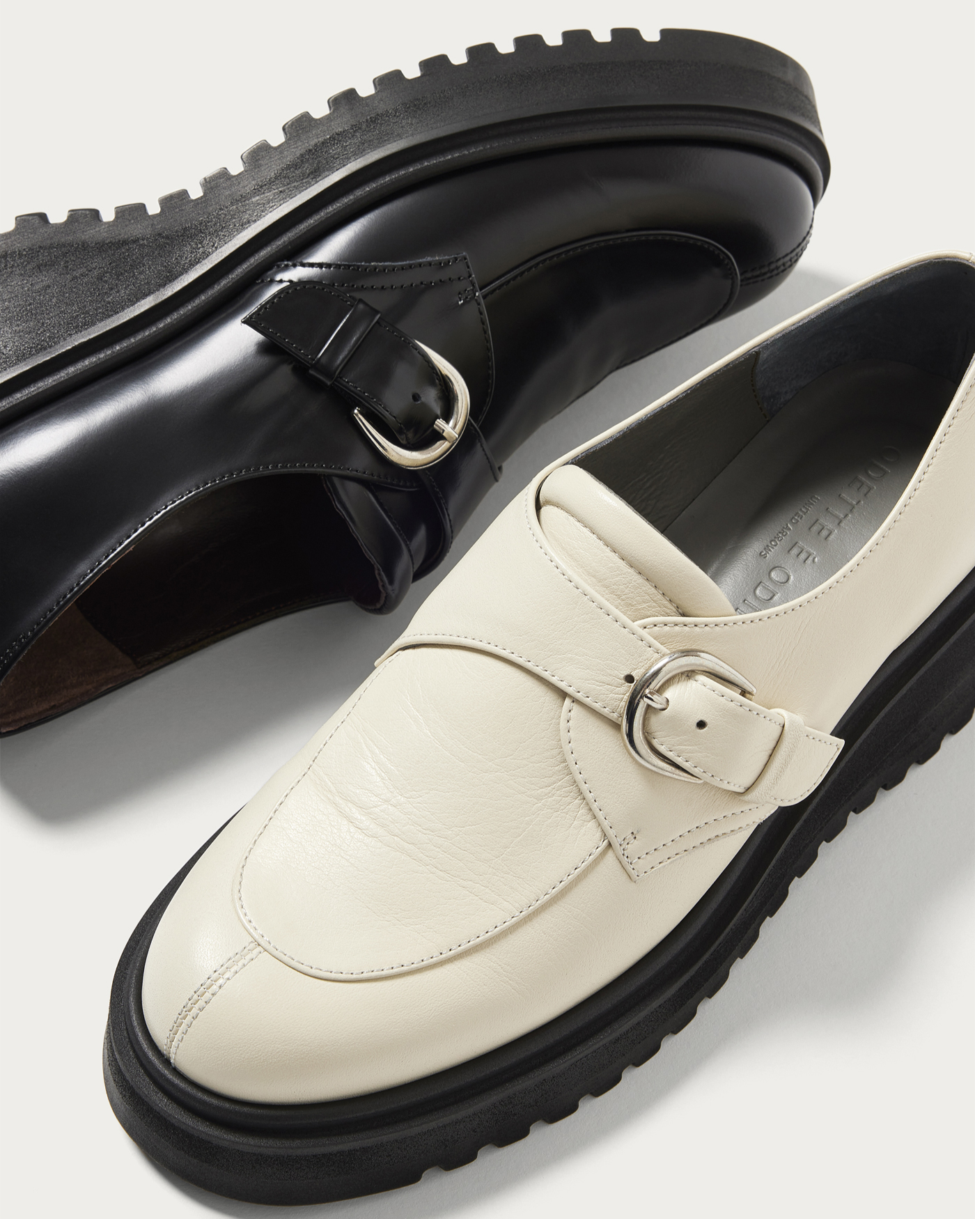 Monk strap shoes with platform-style thick soles that make a statement. The use of sponge on the tongue enhances comfort and fit. The black version features semi-matte glass leather, while the natural version uses soft smooth leather. These shoes aim to elevate your style while maintaining a sophisticated elegance suitable for adults.