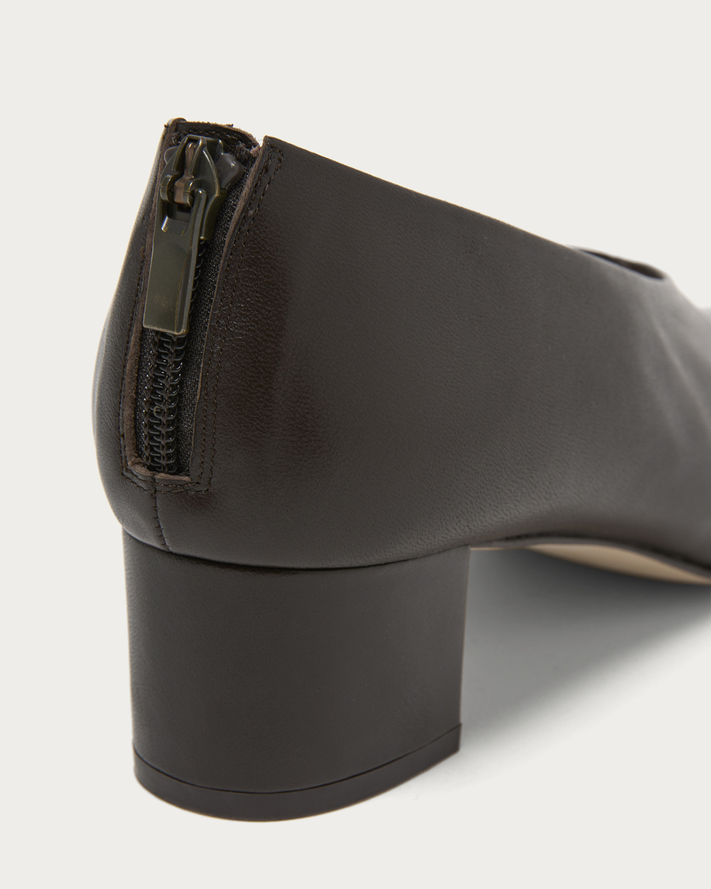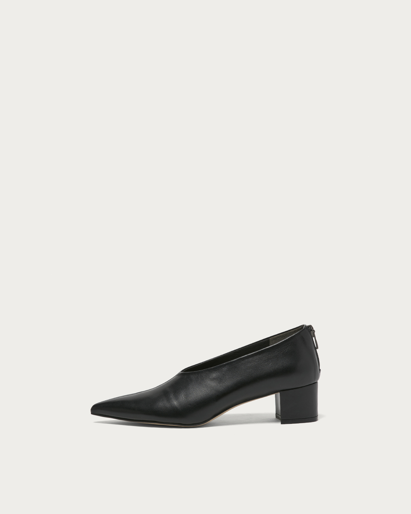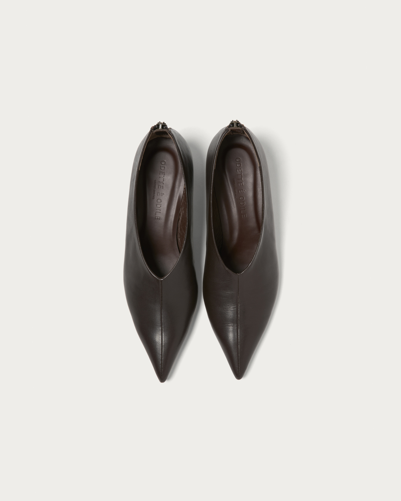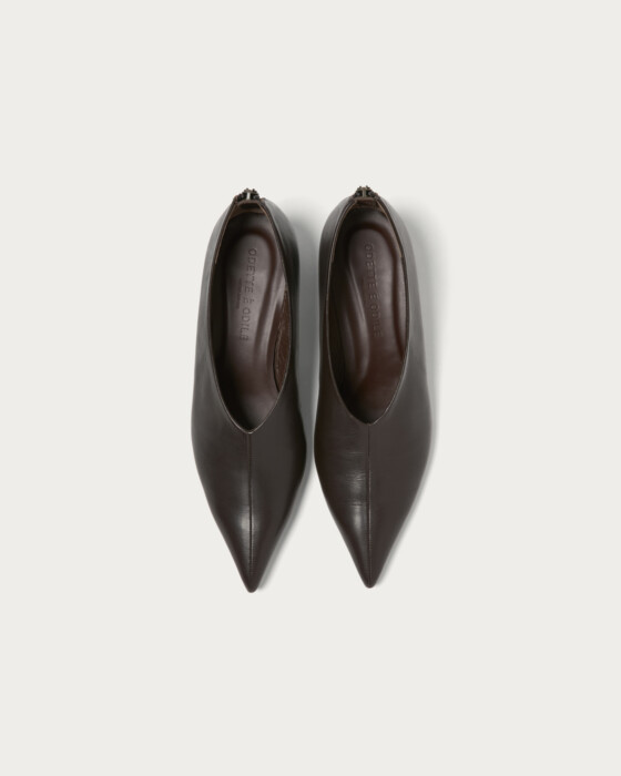 A bootie style with a deep instep that wraps around the foot. The pointed last with an extended nose beautifully accentuates the foot's line, and the back features an easy-to-use zipper for convenient wear. The slider comes with a lock to prevent it from slipping down, adding an extra sense of security. It pairs well with the volume of wide pants, enhancing a chic winter style.