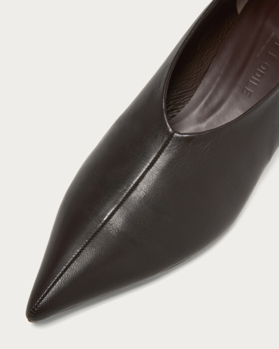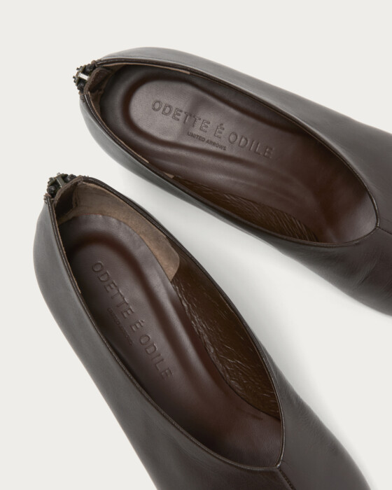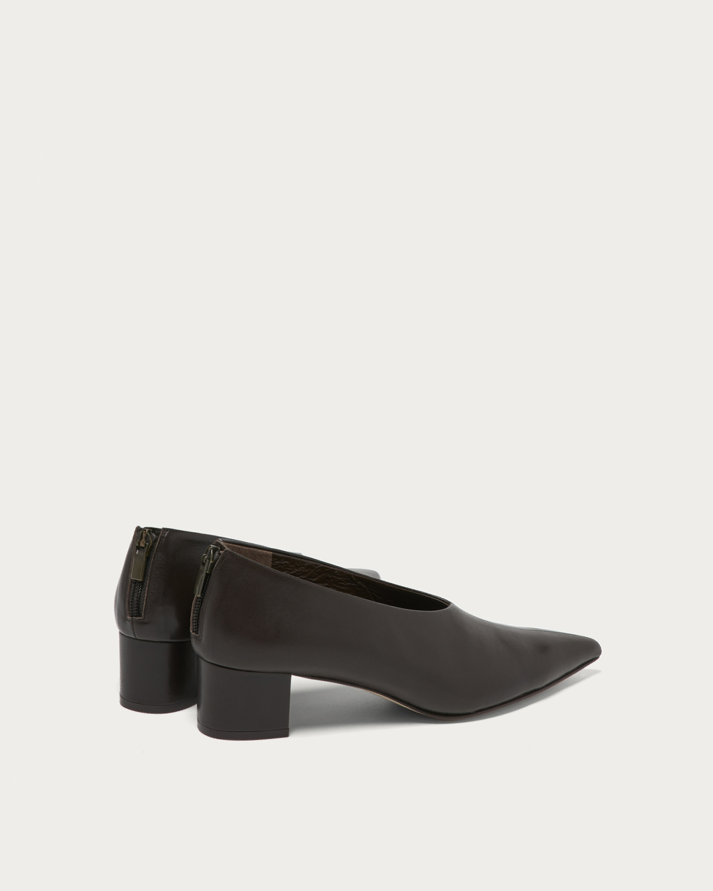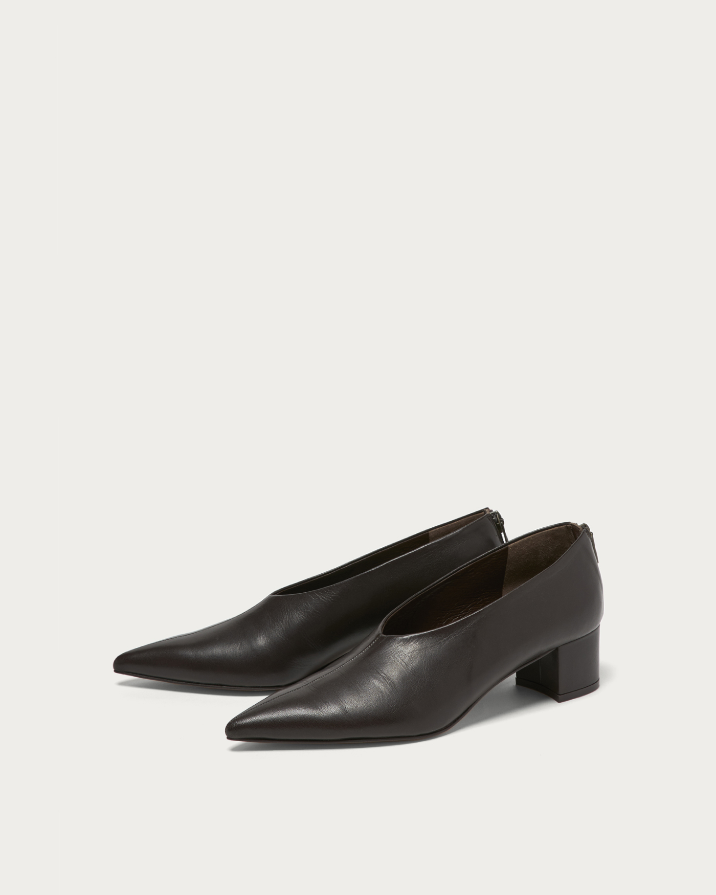 A bootie style with a deep instep that wraps around the foot. The pointed last with an extended nose beautifully accentuates the foot's line, and the back features an easy-to-use zipper for convenient wear. The slider comes with a lock to prevent it from slipping down, adding an extra sense of security. It pairs well with the volume of wide pants, enhancing a chic winter style.