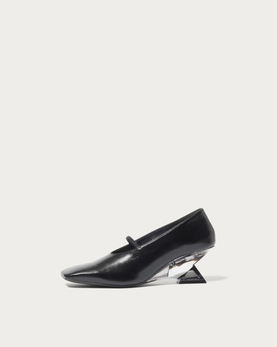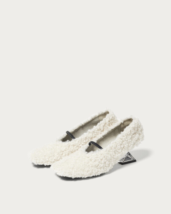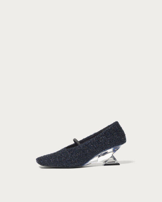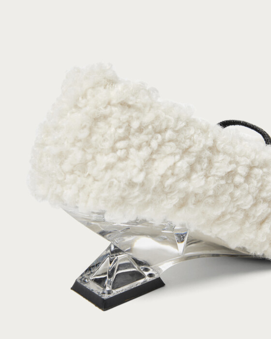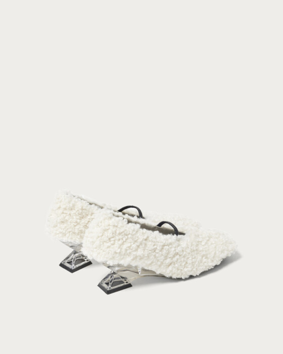Wedge pumps with crystal-like heels add a touch of elegance to your feet. The square toe and shirring belt create a modern impression, with off-white featuring faux fur material and navy offering a shaggy fabric, allowing you to enjoy different textures for each color. Pair them with slacks or a tight skirt to complete your winter fashion style.