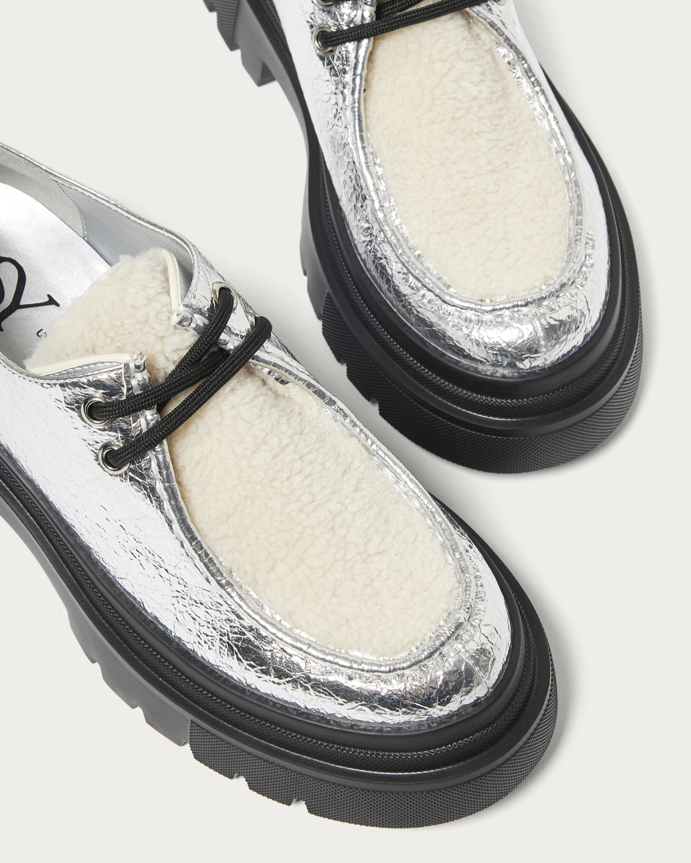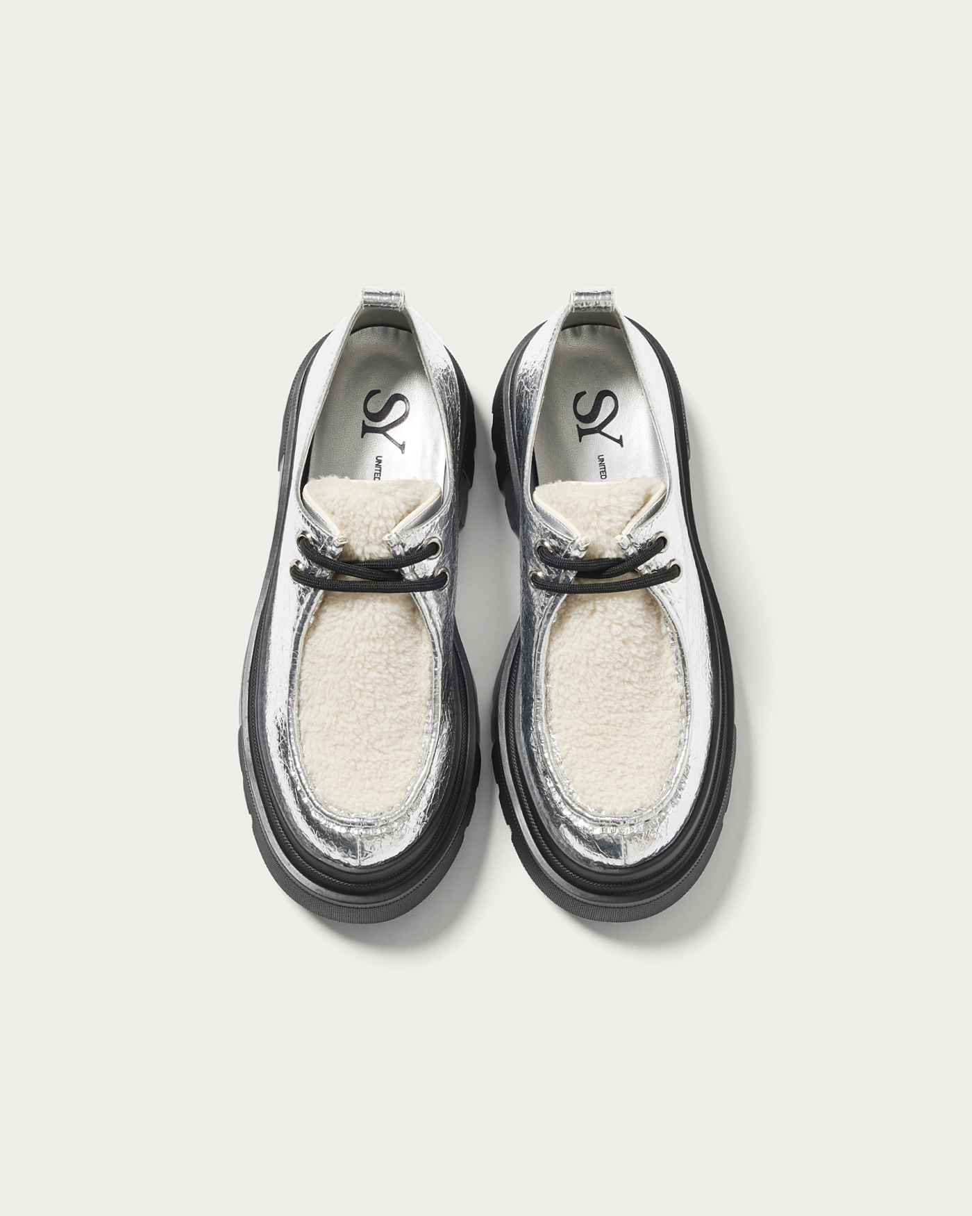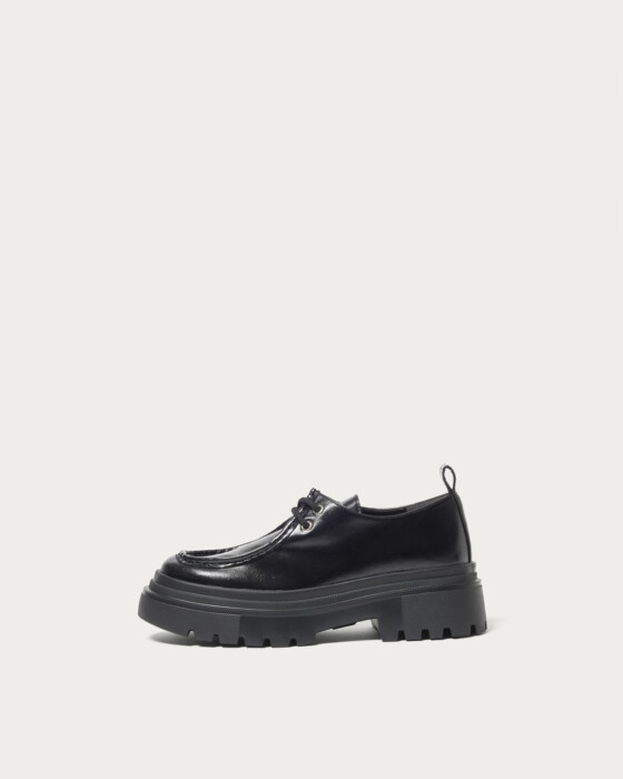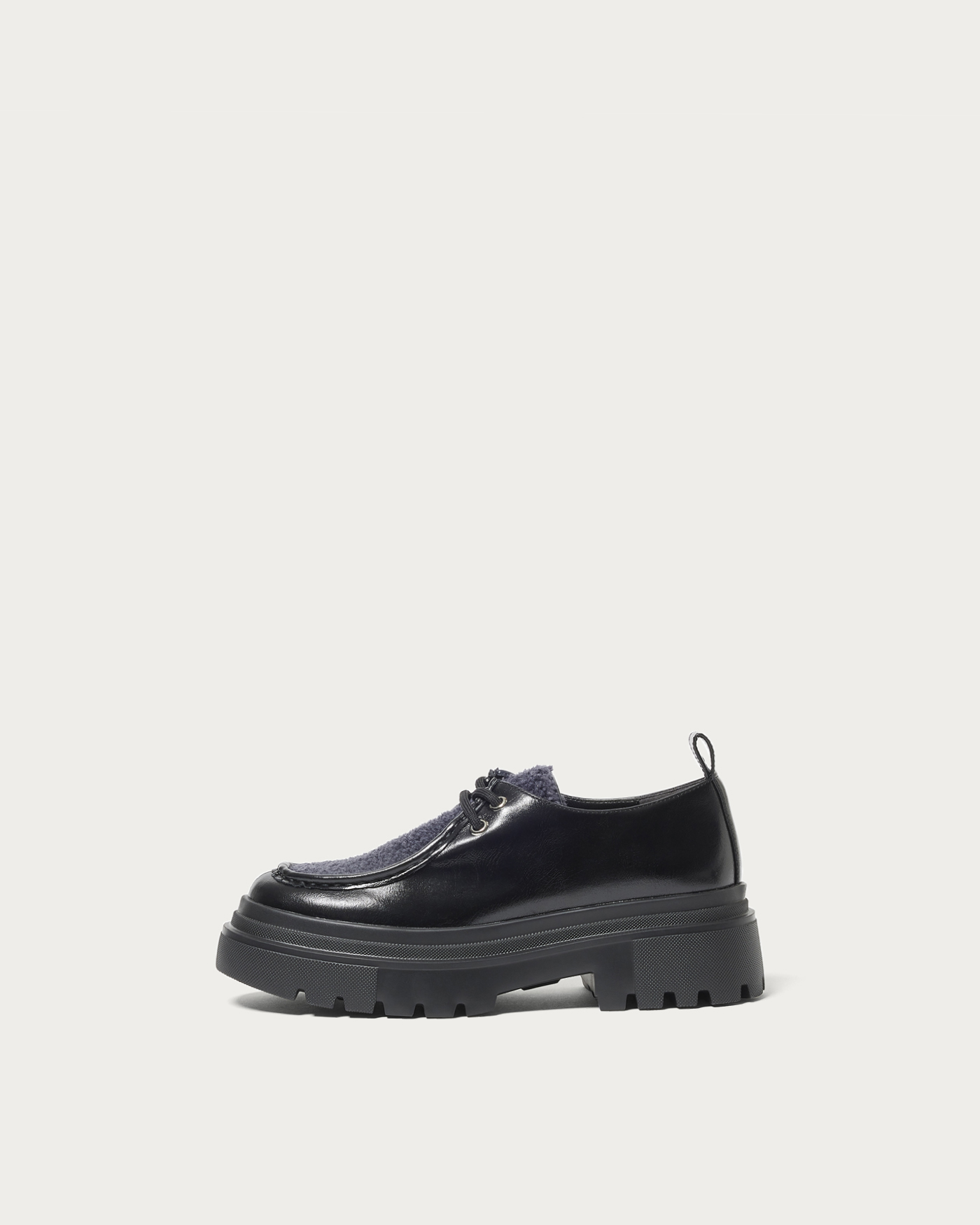 A striking pair of shoes that combines a tank sole with a Tyrolean design. The glossy black and dark brown options serve as timeless staples, while the combination colors with boa add a playful touch. Pair them with a pleated skirt for a traditional vibe. They will enhance your winter outfits with a polished finish.