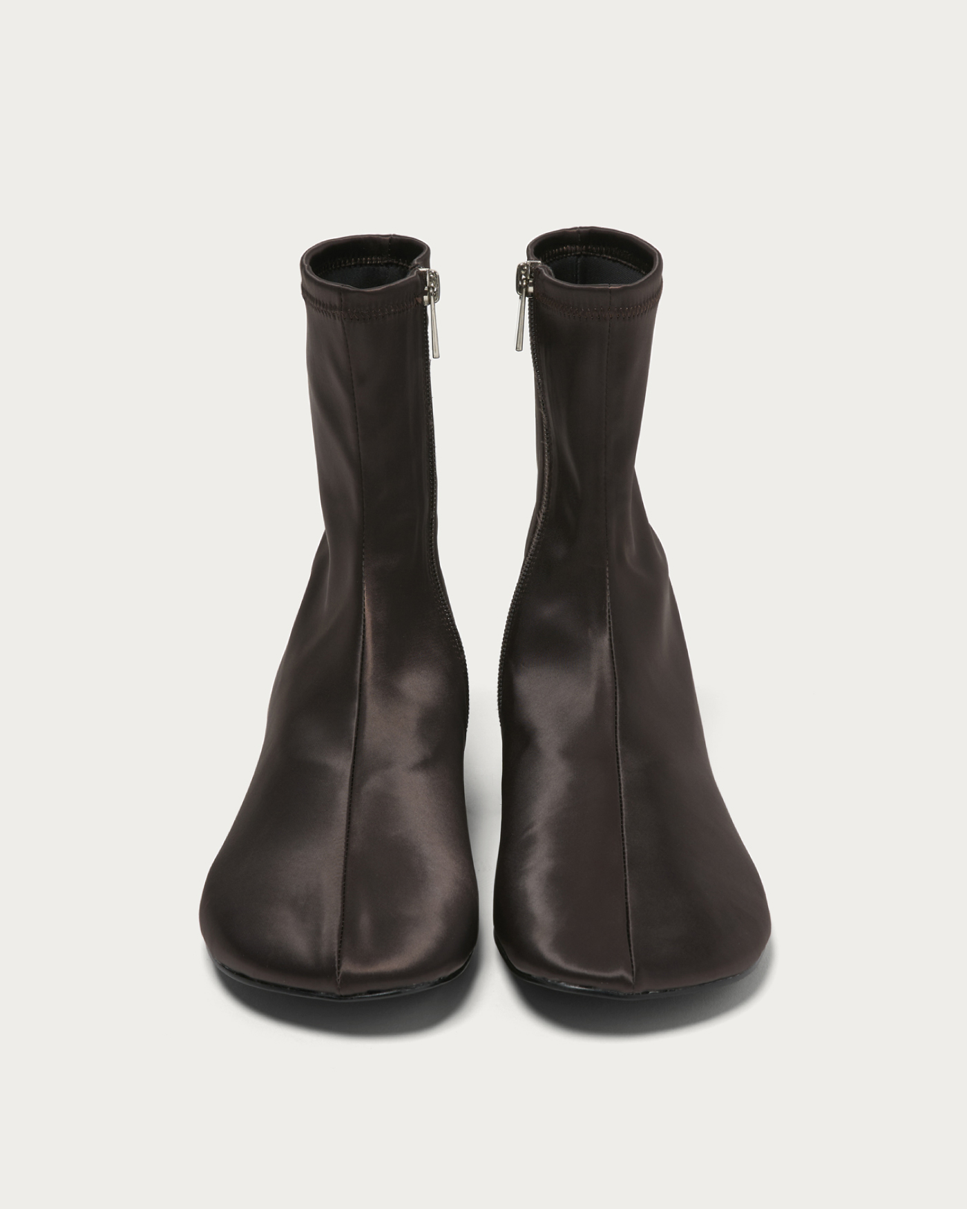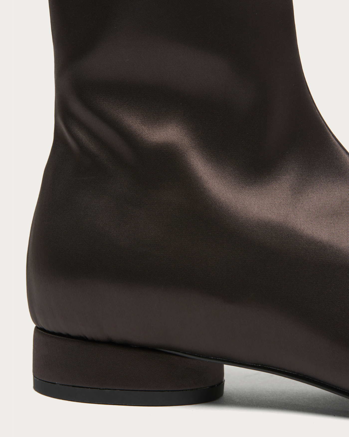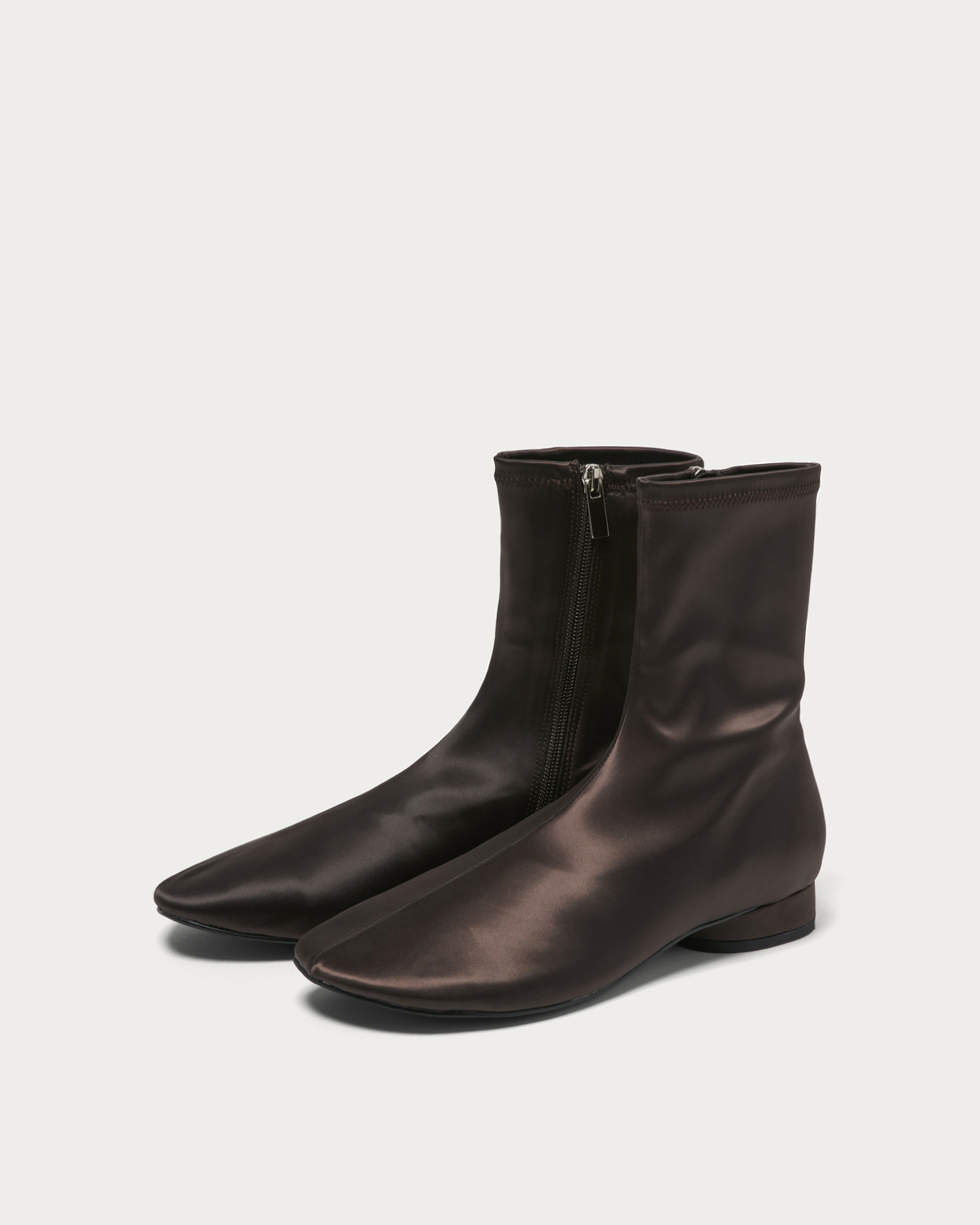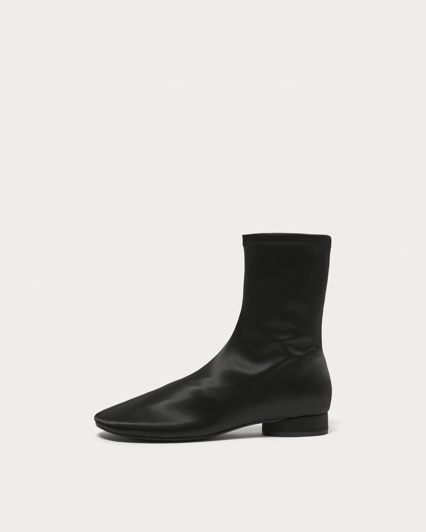 Stretch short boots with a rounded oblique toe that adds a soft touch. The tight silhouette with a cinched ankle and the elegant satin fabric create a chic impression without being too casual. Whether paired with skirts, dresses, or long pants, the beautiful design stands out, offering a fresh look to your footwear collection.