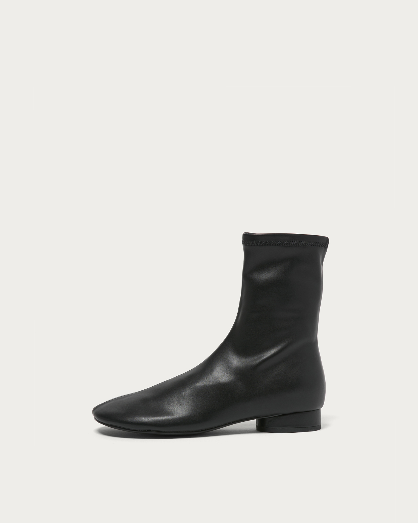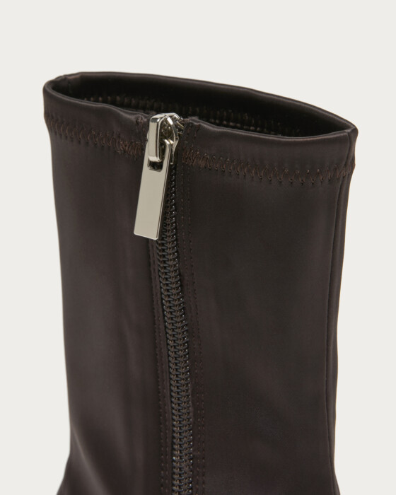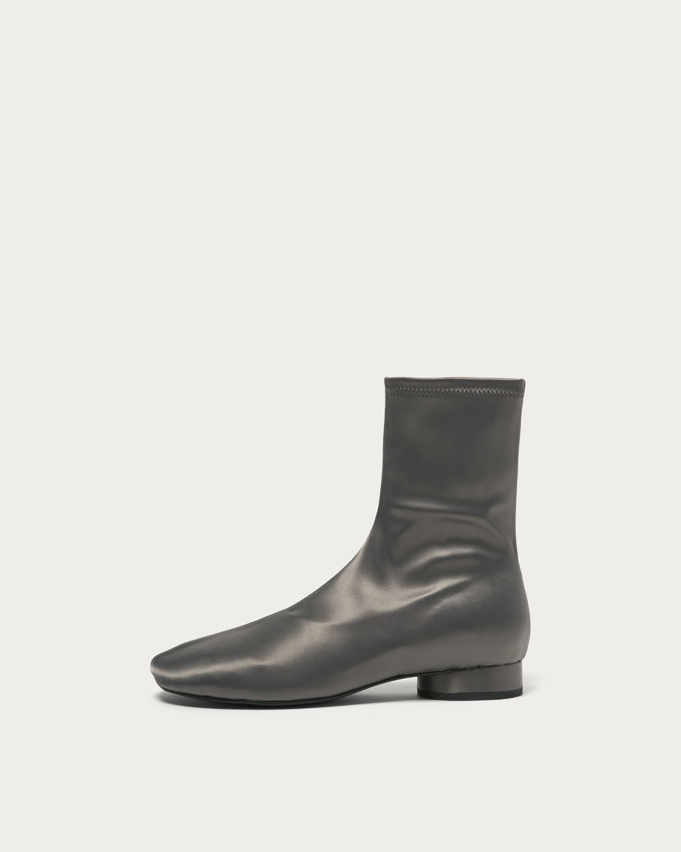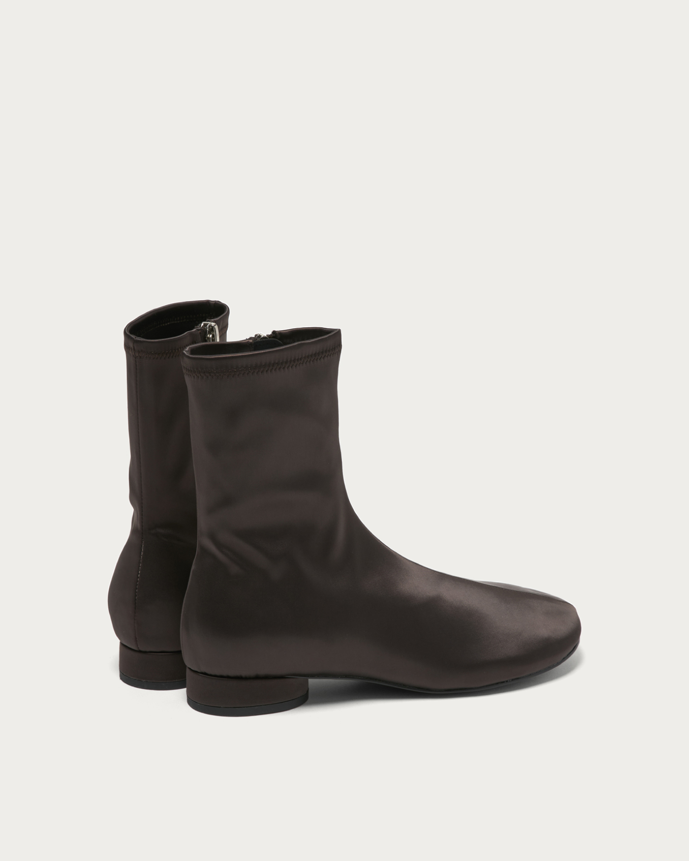 Stretch short boots with a rounded oblique toe that adds a soft touch. The tight silhouette with a cinched ankle and the elegant satin fabric create a chic impression without being too casual. Whether paired with skirts, dresses, or long pants, the beautiful design stands out, offering a fresh look to your footwear collection.
