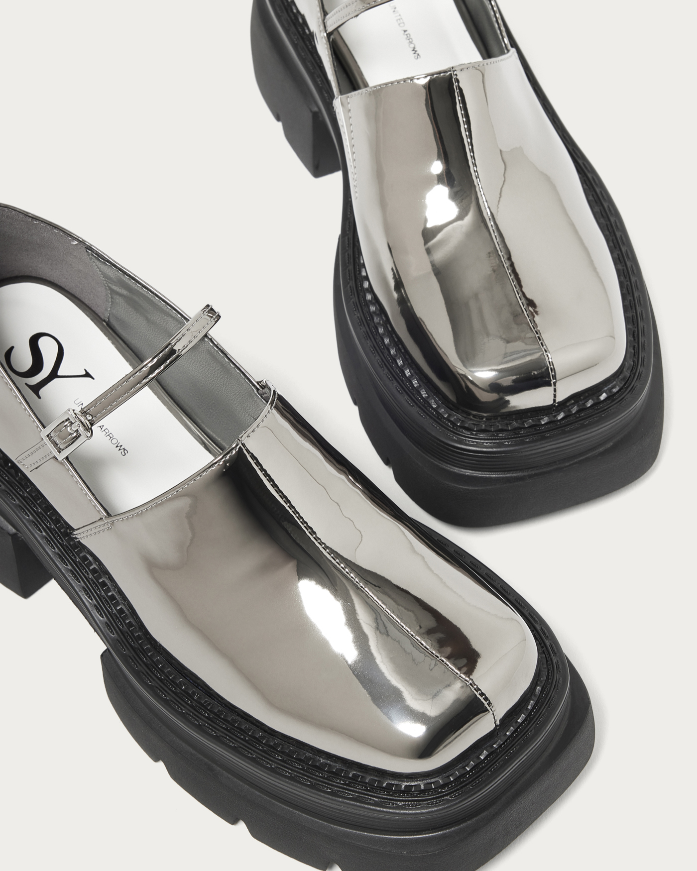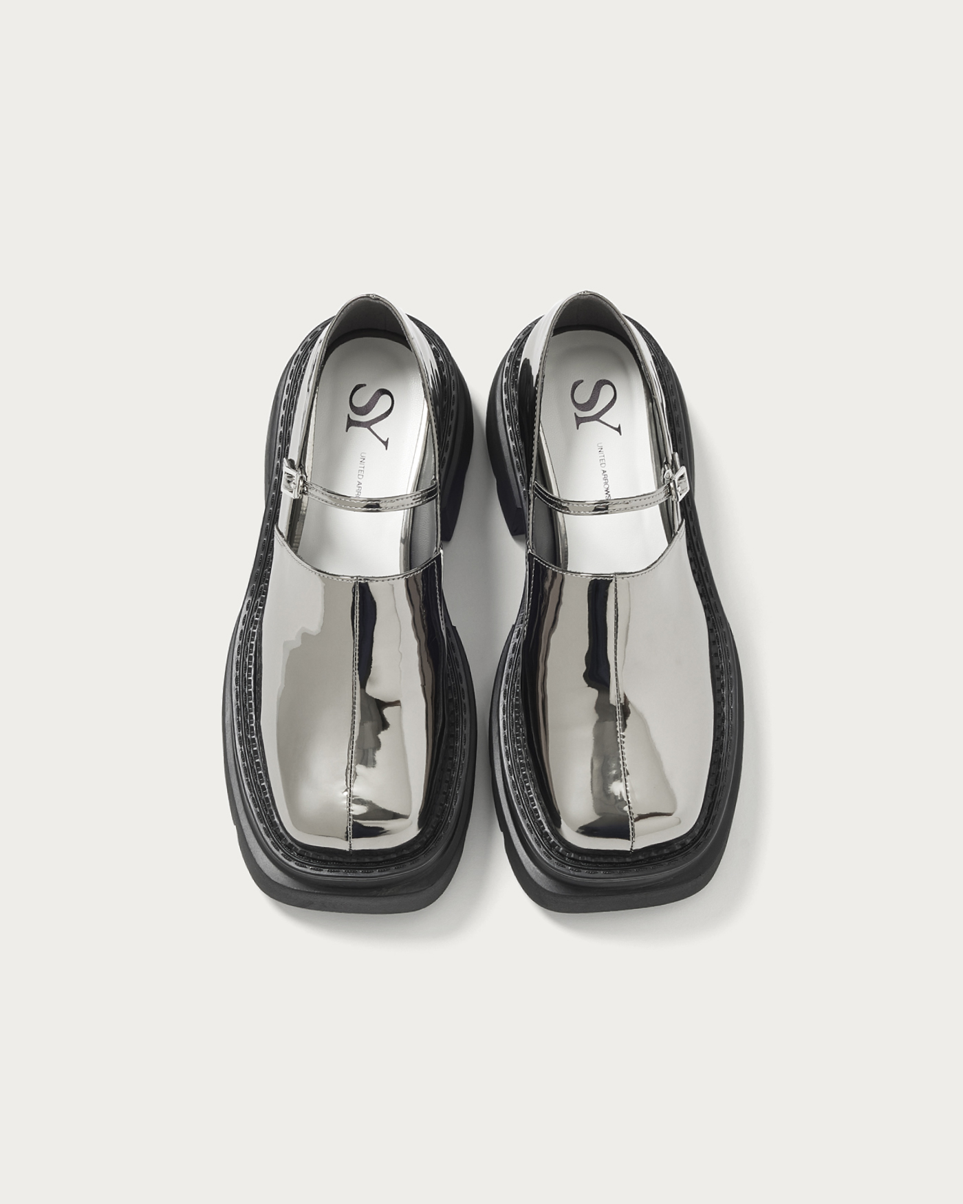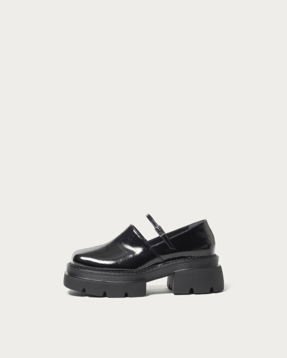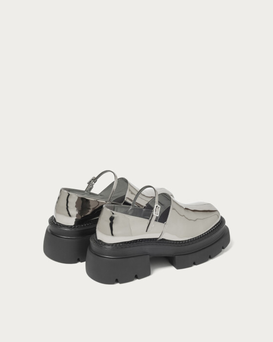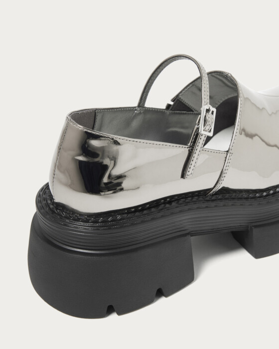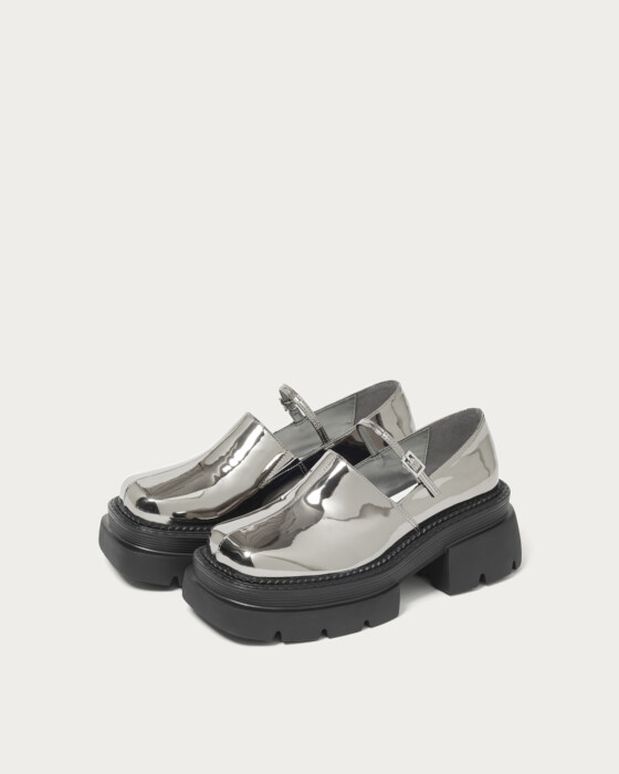 A modern twist on the classic Mary Jane, featuring a deep upper adorned with delicate straps for a chic and stylish impression. This design updates the feminine image with an edgy flair, adding a touch of sophistication to your footwear. Available in black with a shrink enamel finish and silver with a mirror metallic finish, the contrasting materials add to its allure. Pair them with socks to enjoy a trendy and fashionable look.