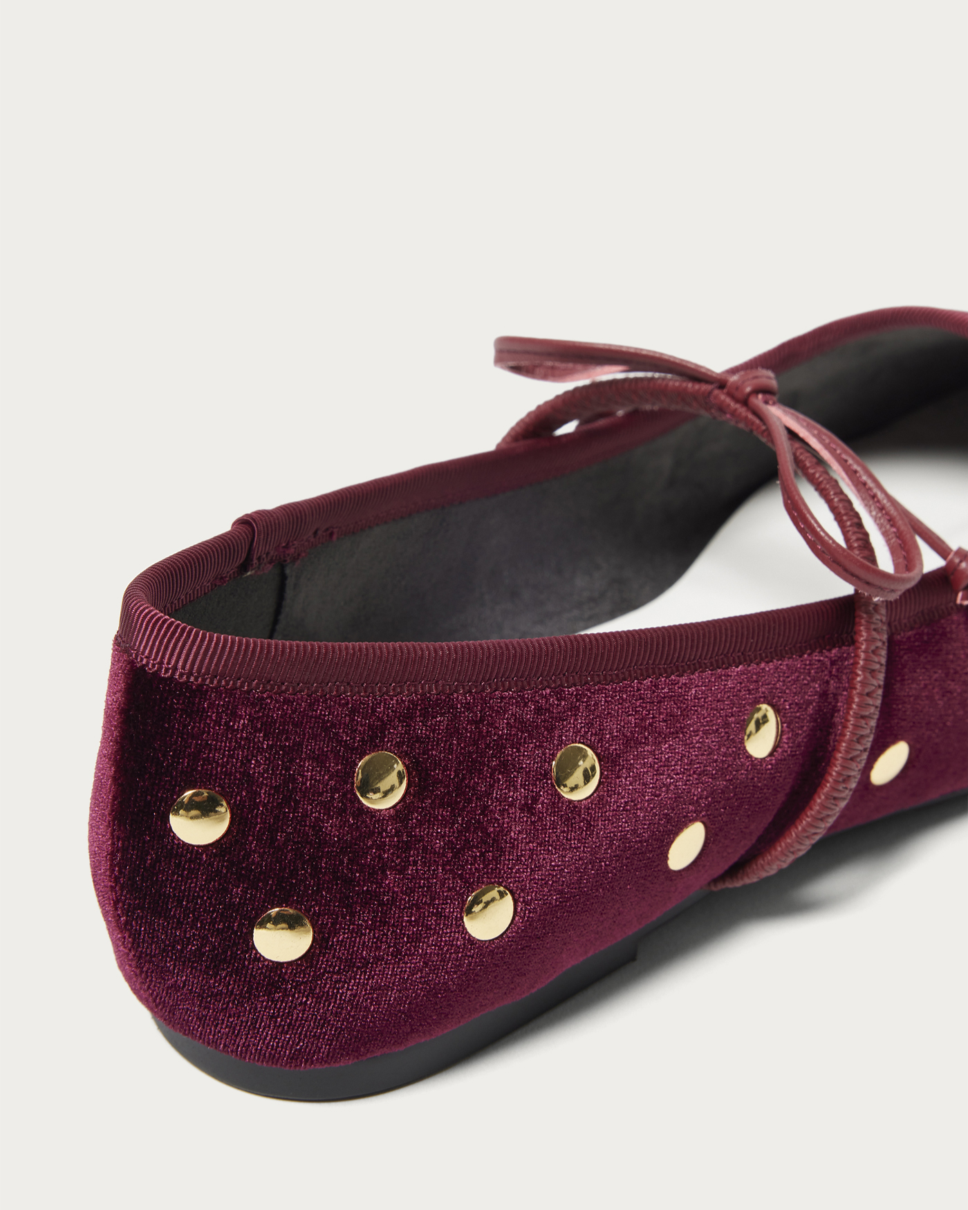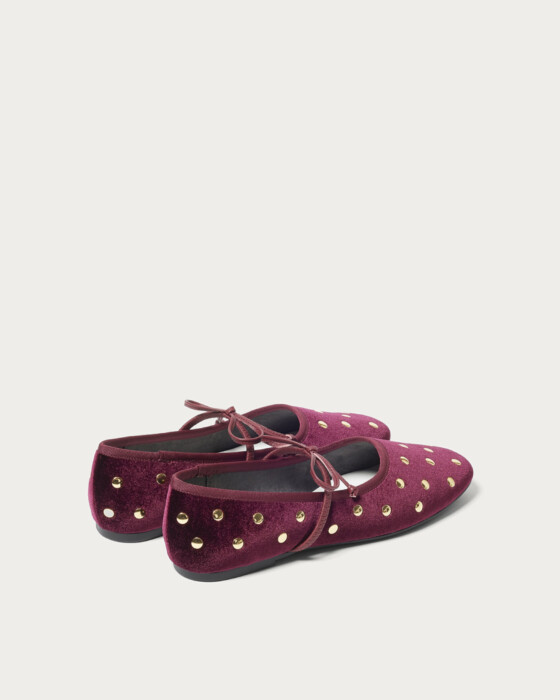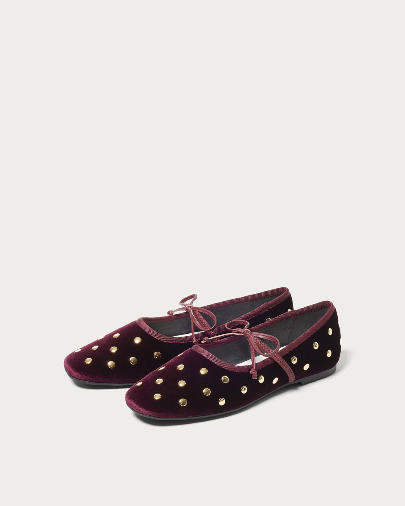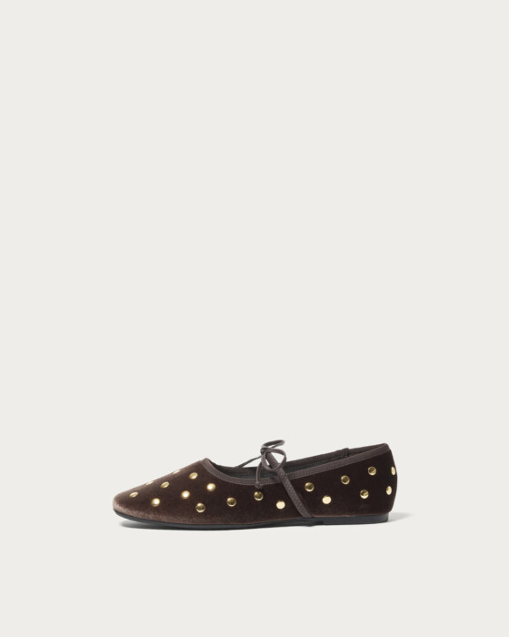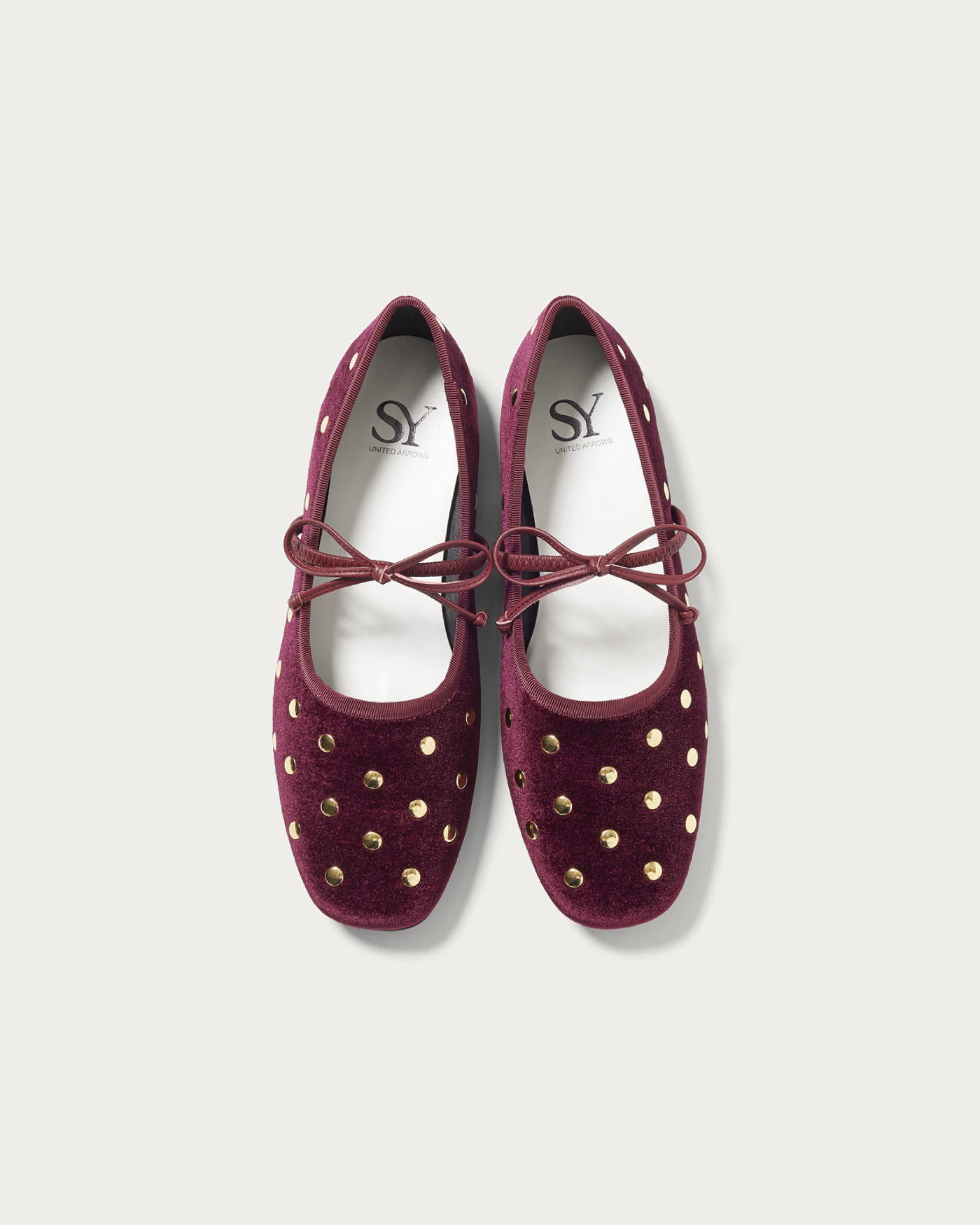 Trendy velvet fabric and studs scattered across the entire upper give these popular ballet shoes a glamorous presence. The shirring elastic design allows for easy slip-on and removal, offering comfortable wear as well. The black version features silver studs, while the brown and wine versions have gold studs, allowing you to choose according to your mood.