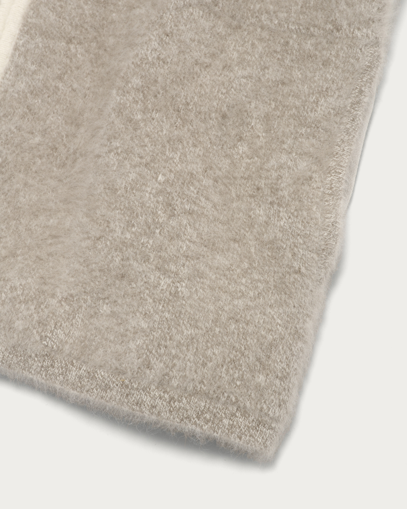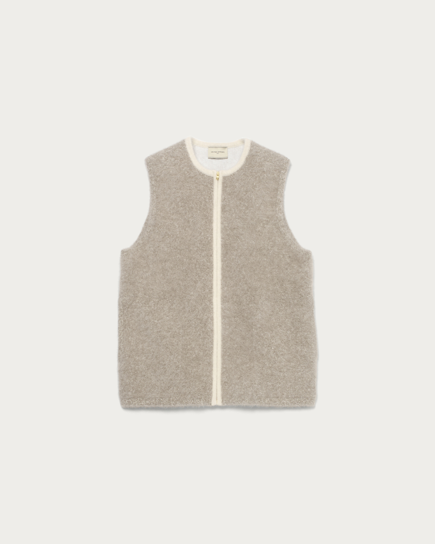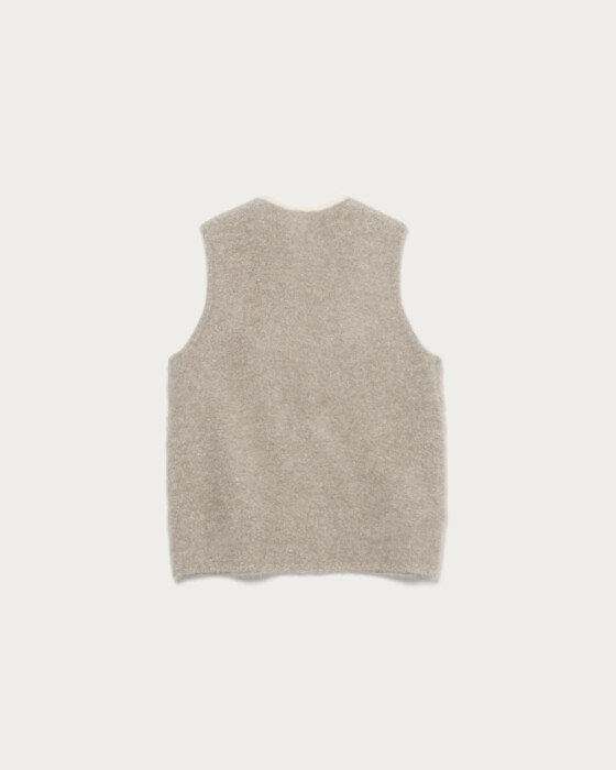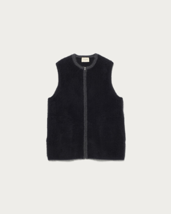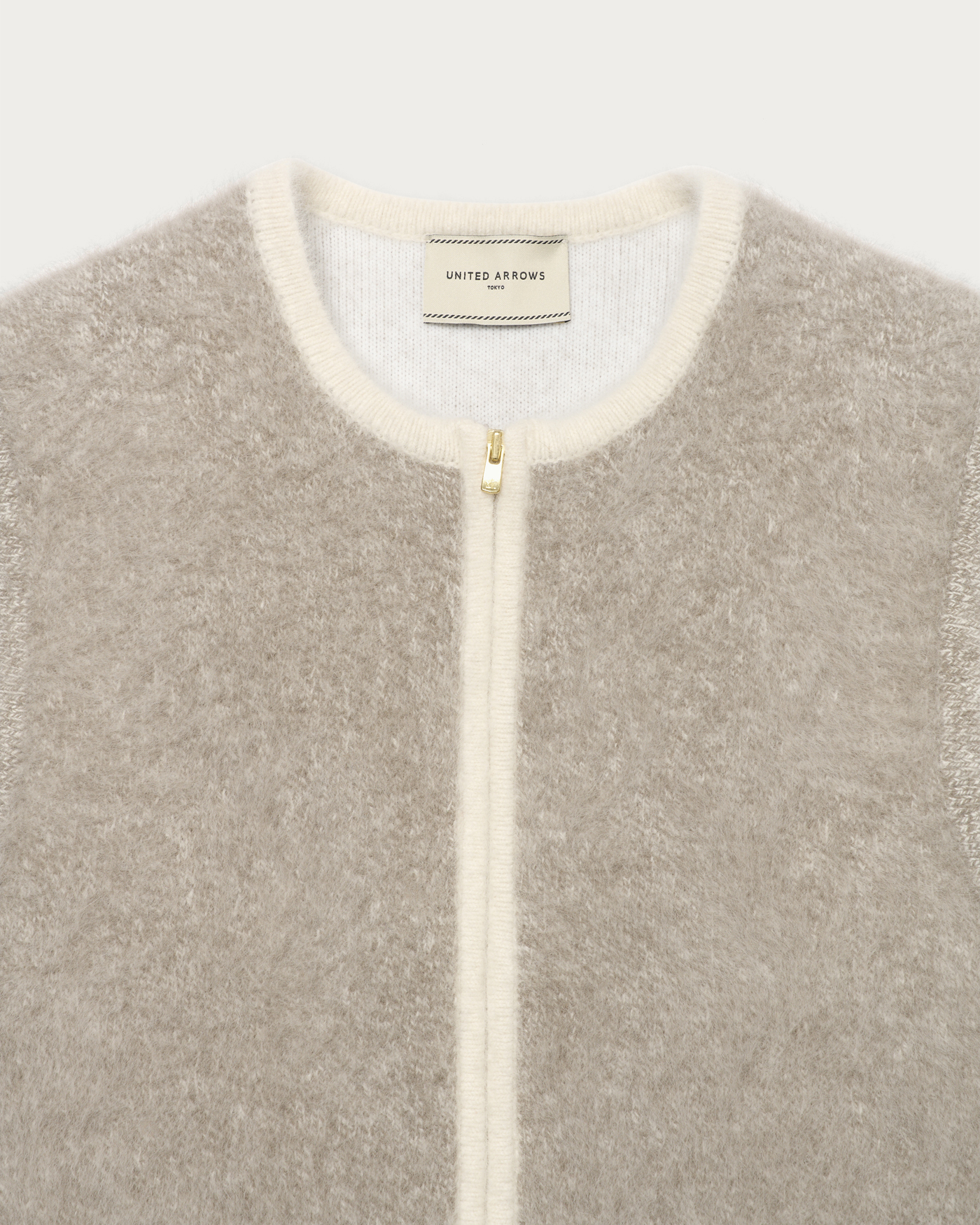 The Fox Cashmere Series knit vest, which has been highly praised every season. The luxurious texture with its lustrous and glossy finish is its most notable feature. The contrasting trim from the collar to the placket adds an accent to the simplicity. It features slash pockets on the sides, giving it a sleek appearance. The clean zipper opening and leather-like trim on the front center and pocket openings add an accent. With a perfect balance of relaxed elegance, this piece is a refined addition to your daily wardrobe.