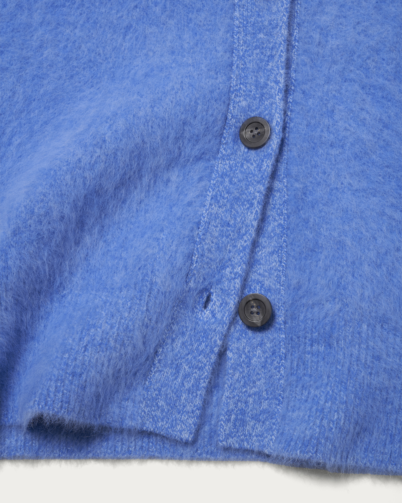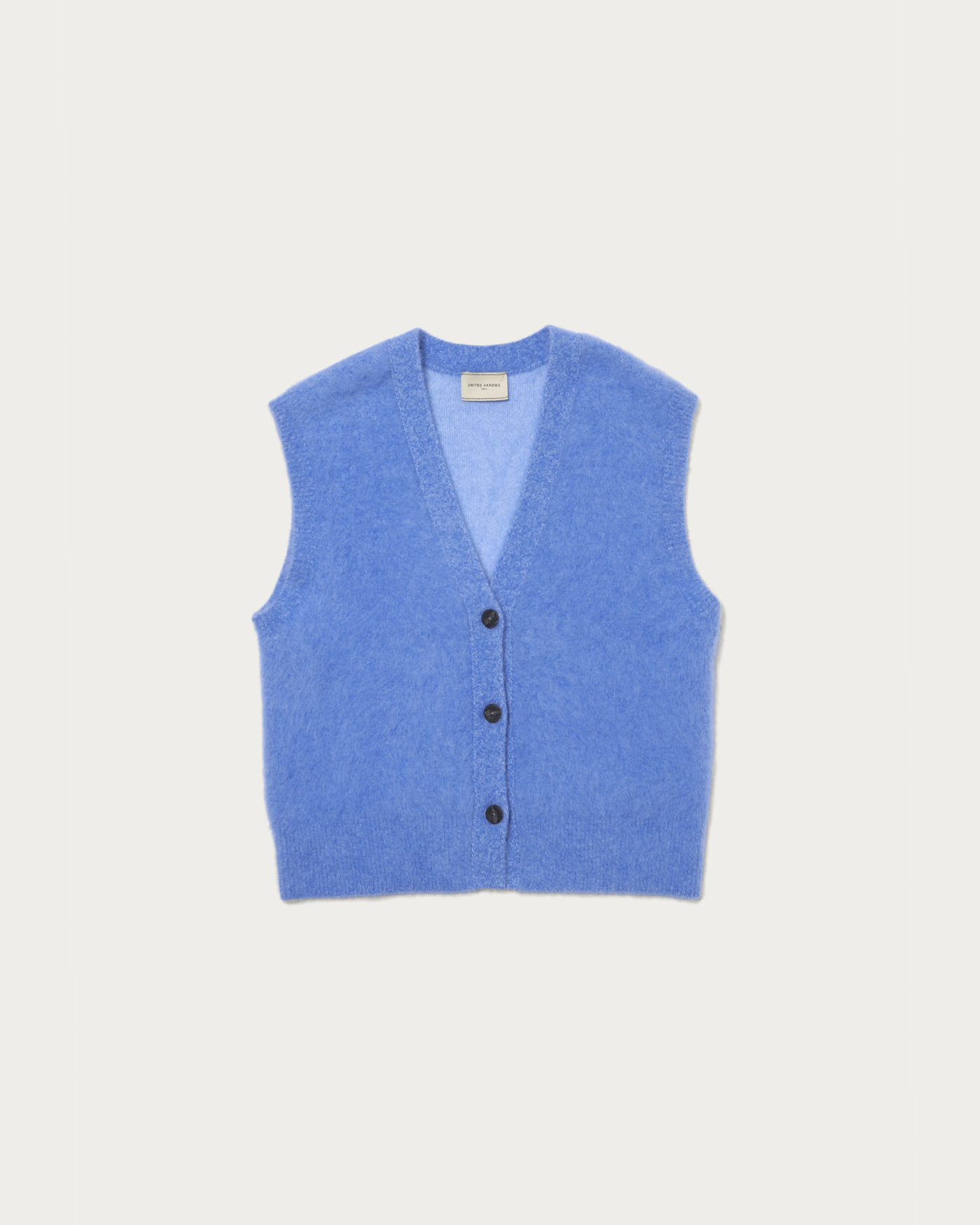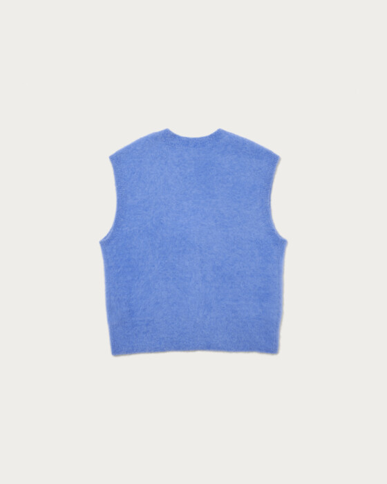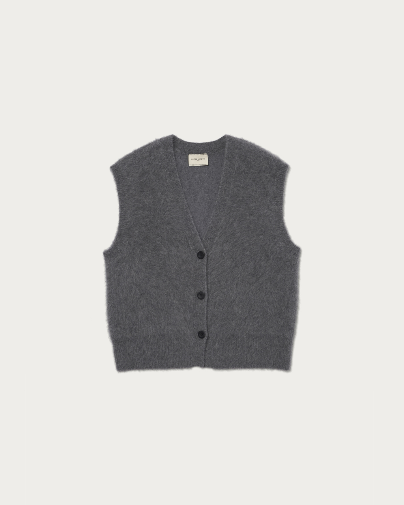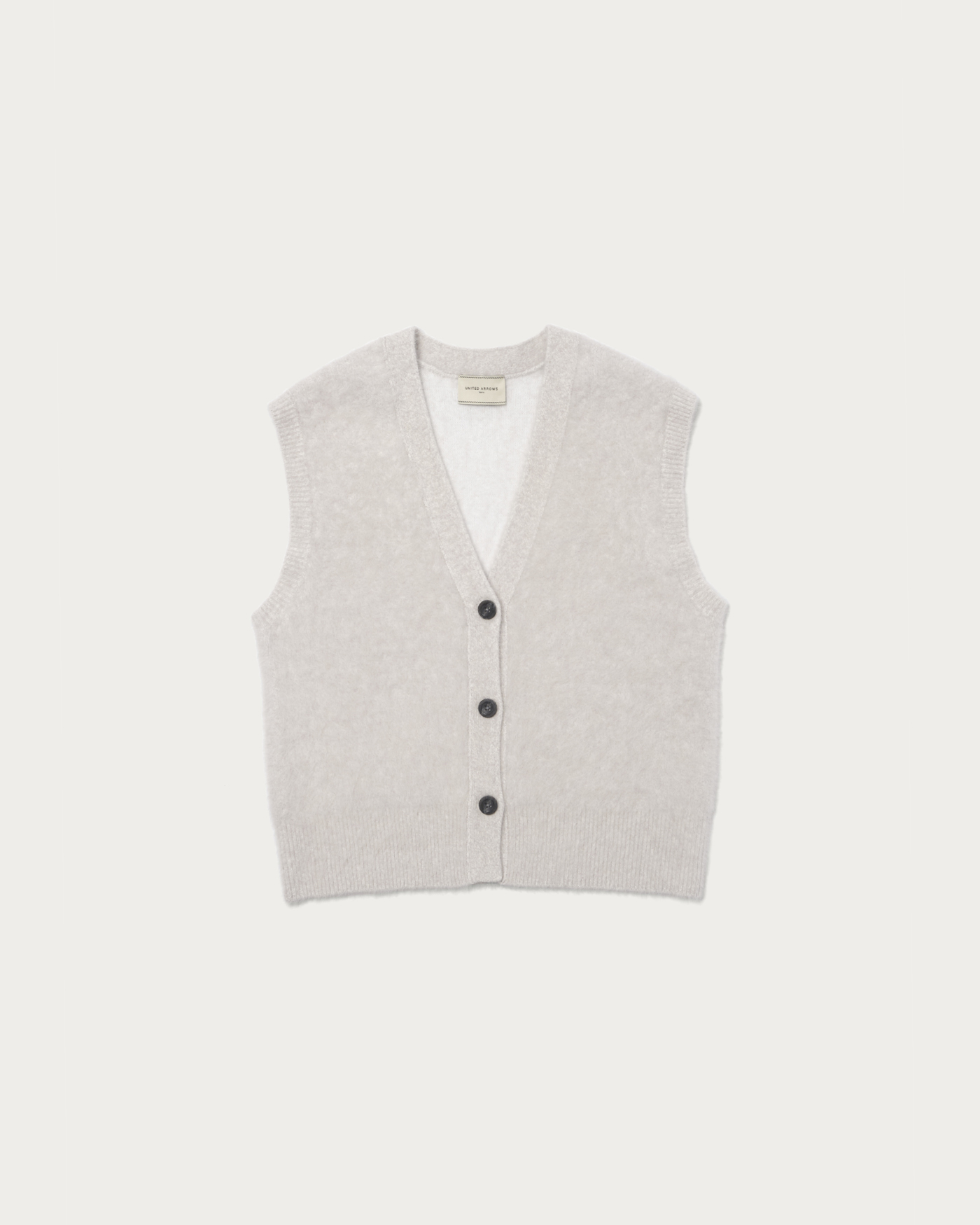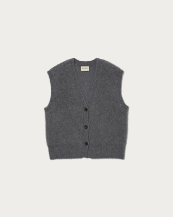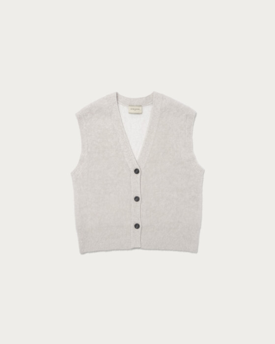 The Fox Cashmere series, which has been highly praised every season, features a knit vest with a design that drapes nicely over the shoulders. The luxurious texture, with its sheen and gloss, is its most notable characteristic. The vest subtly covers the upper arms with its moderately long French sleeves, and the large buttons add an accent. It is a piece that doesn't cling too tightly to the body's lines, allowing you to create a relaxed and effortless style.