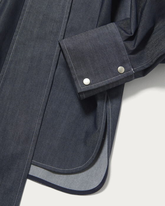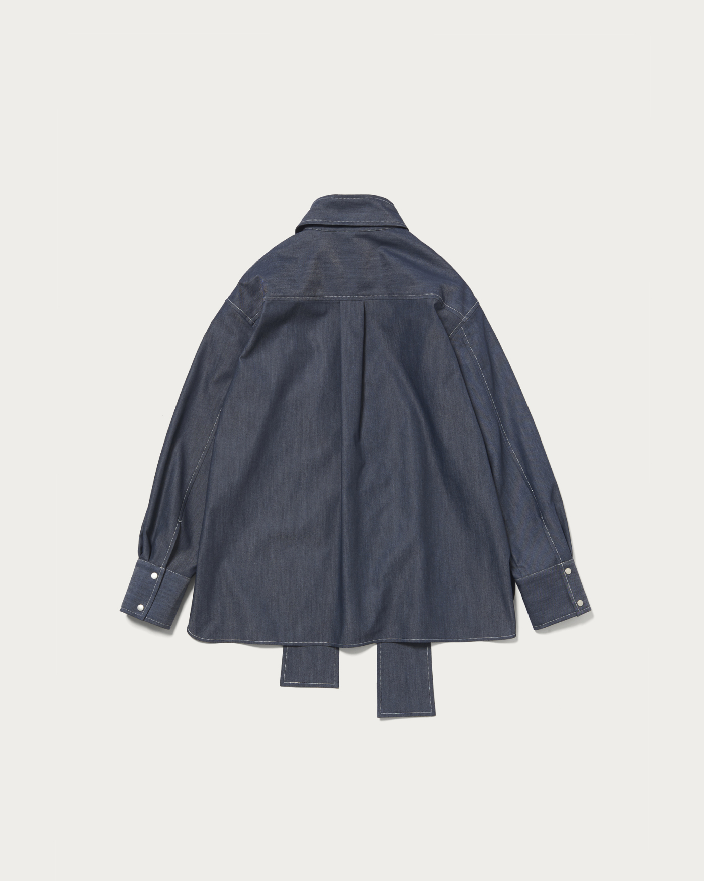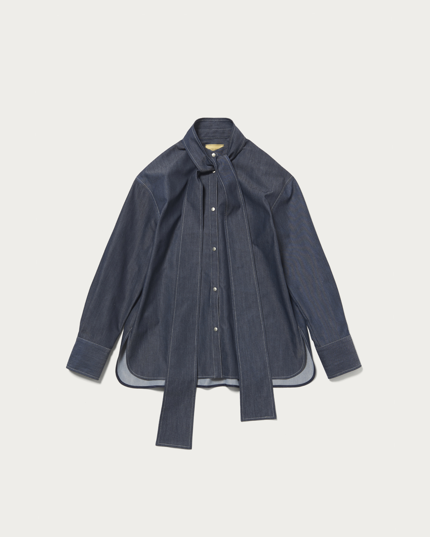 A versatile blouse with a detachable bow tie that allows for a variety of styling options. The bow tie can be removed, and the denim-like color and thick thread stitching are key features. Made from polyester, it offers a denim-like appearance without being overly casual, making it suitable for more polished styles as well. It can be worn on its own or layered with knits and vests for added style.