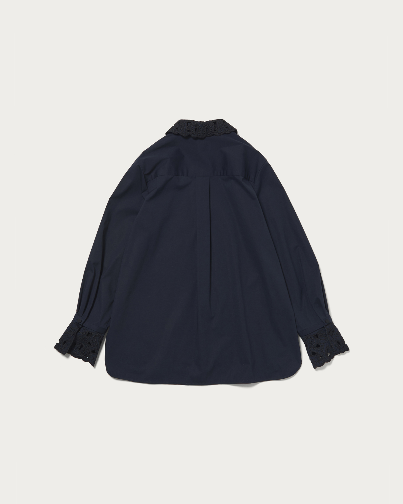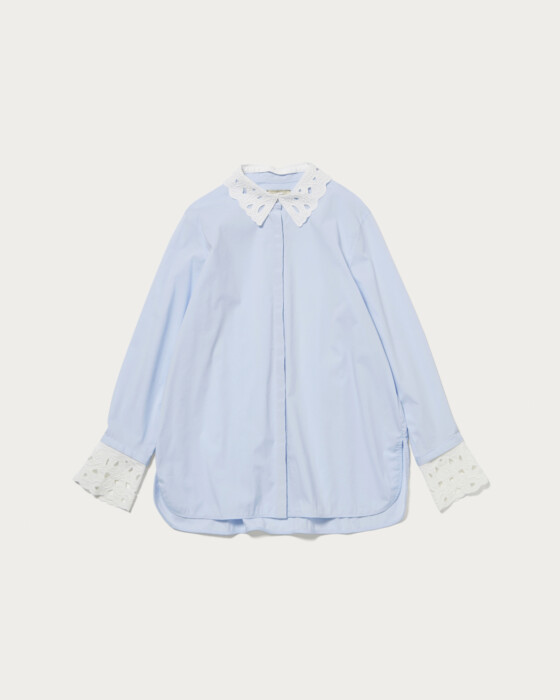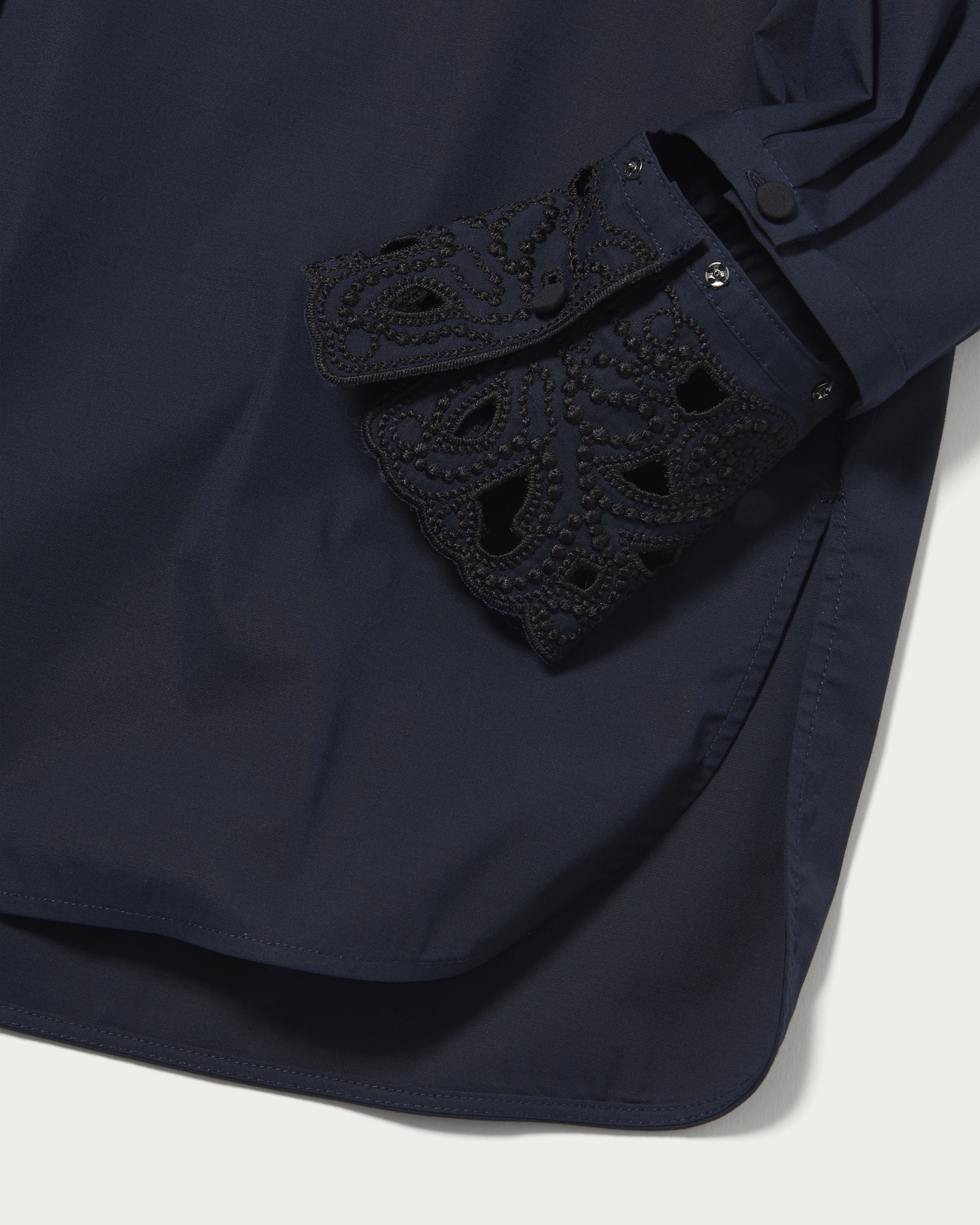 A 3D Embroidered Shirt Blouse with a 2-Way Design for Versatile Styling. This shirt blouse features eyelet embroidery with a three-dimensional collar and cuffs, making it suitable for both on and off-duty wear. A delightful feature is the detachable collar, which transforms the blouse into a band collar style when removed, and the cuffs can be detached to create 9/10 length sleeves. Enjoy the simplicity and feminine embroidery all in one blouse.