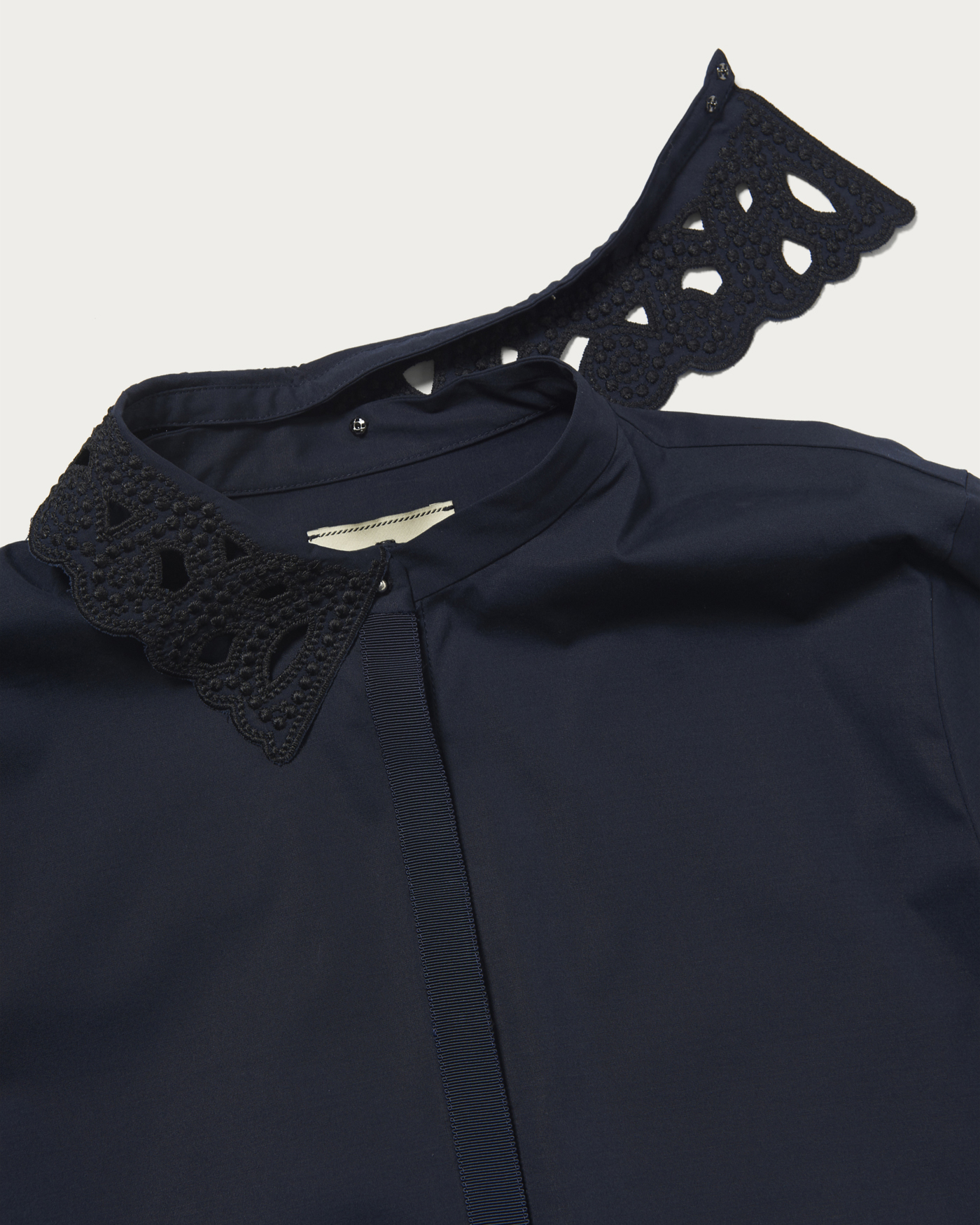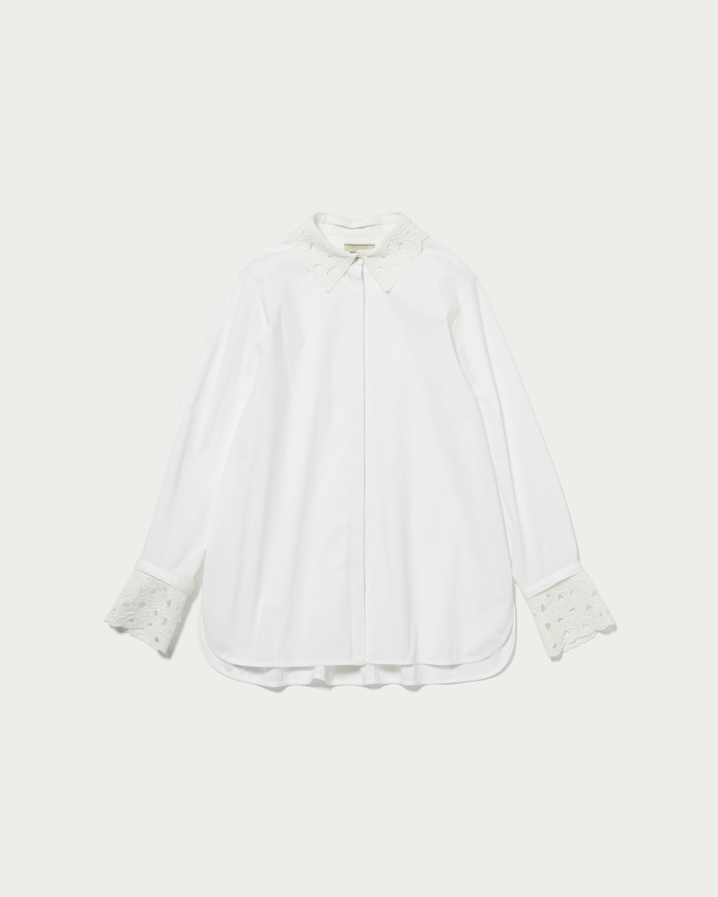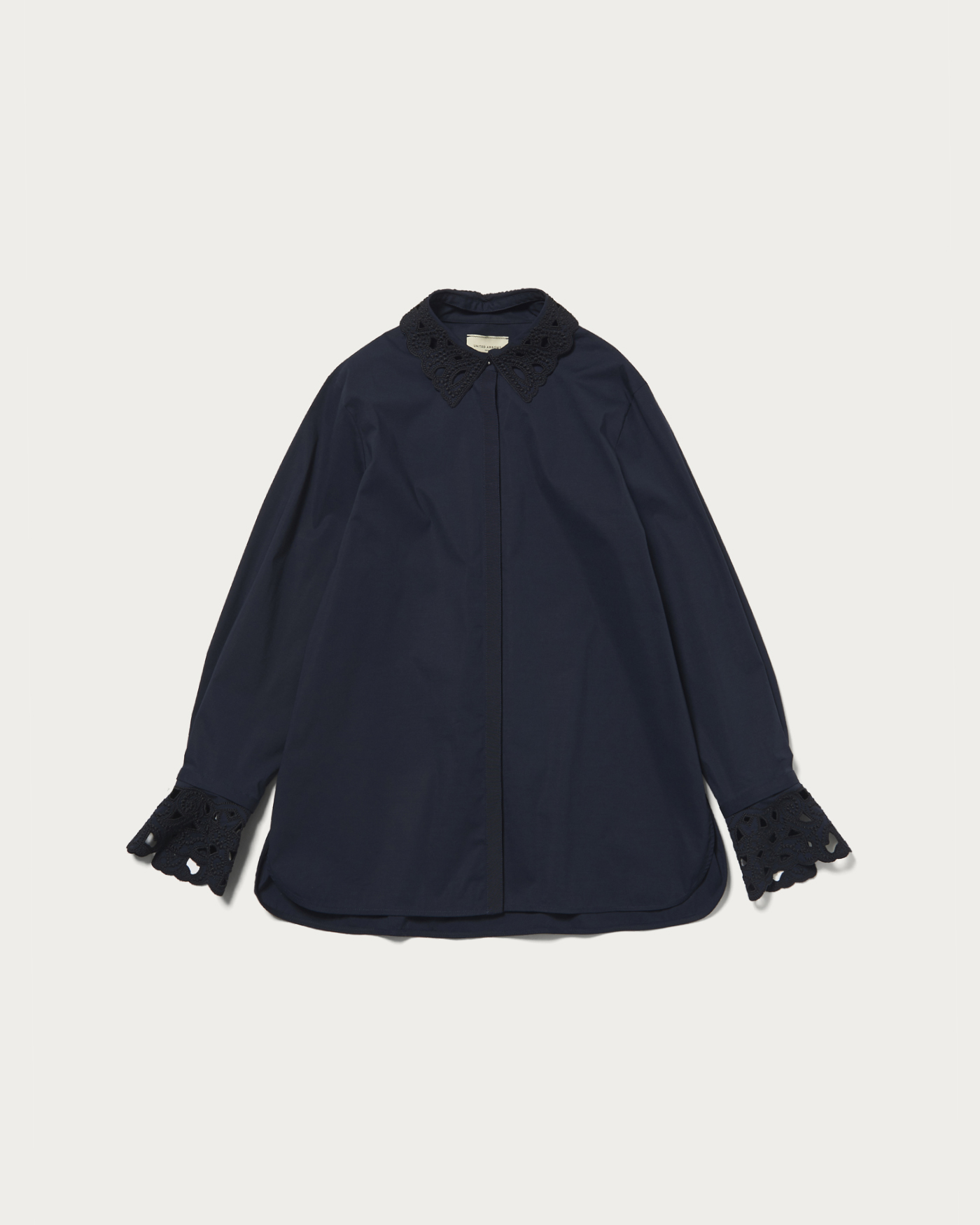 A 3D Embroidered Shirt Blouse with a 2-Way Design for Versatile Styling. This shirt blouse features eyelet embroidery with a three-dimensional collar and cuffs, making it suitable for both on and off-duty wear. A delightful feature is the detachable collar, which transforms the blouse into a band collar style when removed, and the cuffs can be detached to create 9/10 length sleeves. Enjoy the simplicity and feminine embroidery all in one blouse.