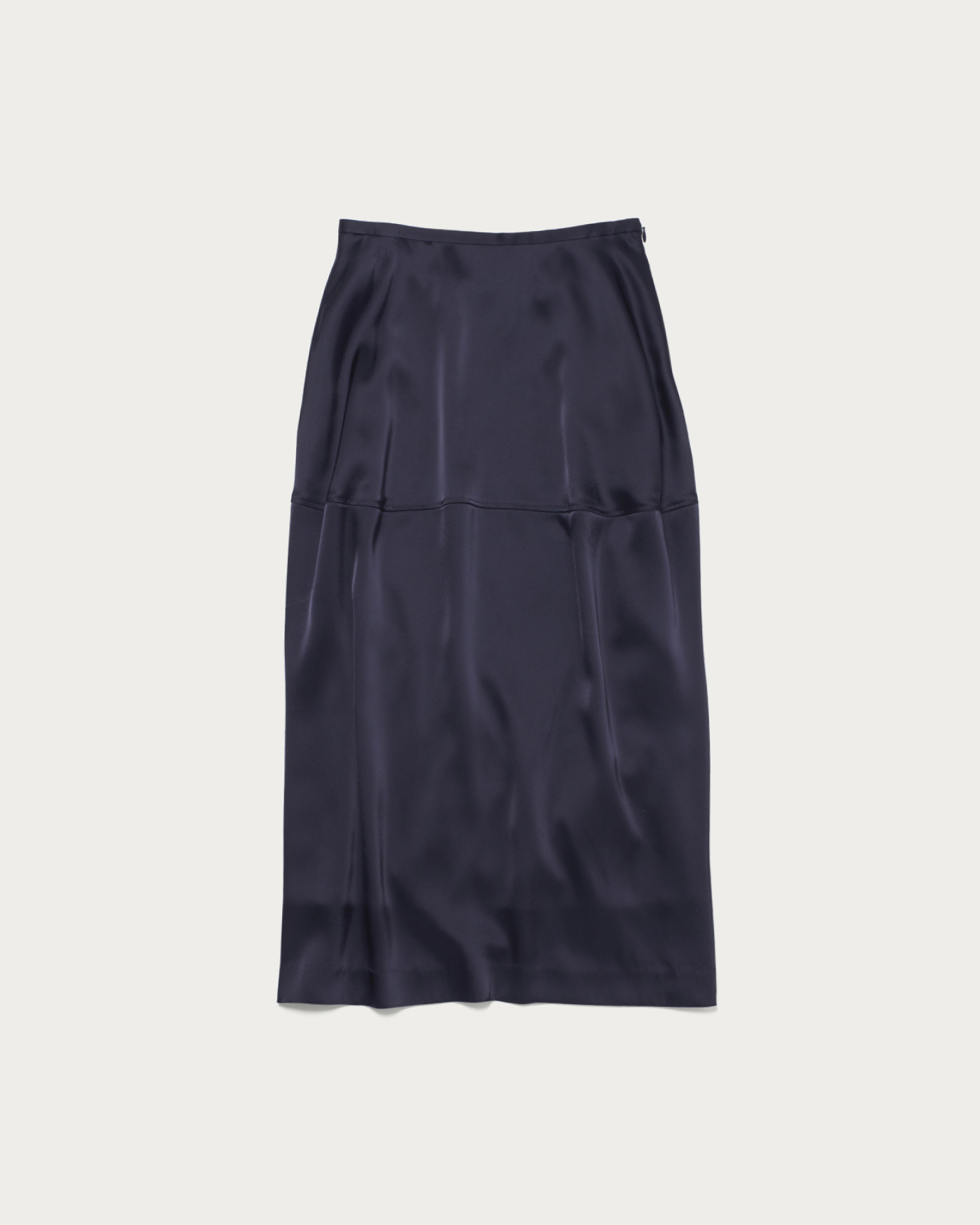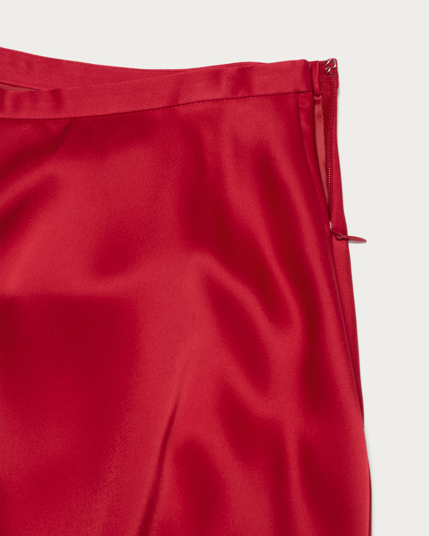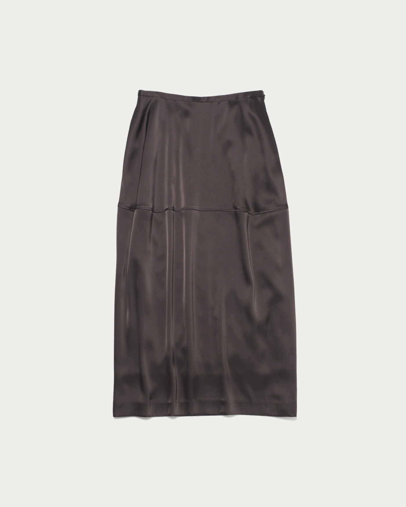 A satin skirt with a glossy material that adds an accent to your outfit. The paneling creates a slightly cocoon silhouette, making it a trendy piece. It features pockets and a lining, allowing you to wear it without worry, which is a delightful point. Pair it with textured knits or thick tops for a recommended coordination that combines materials with different textures.