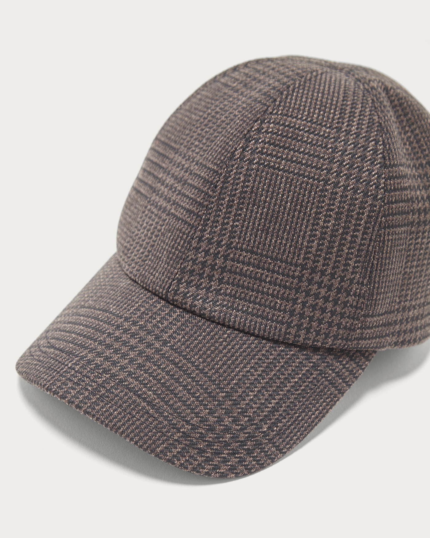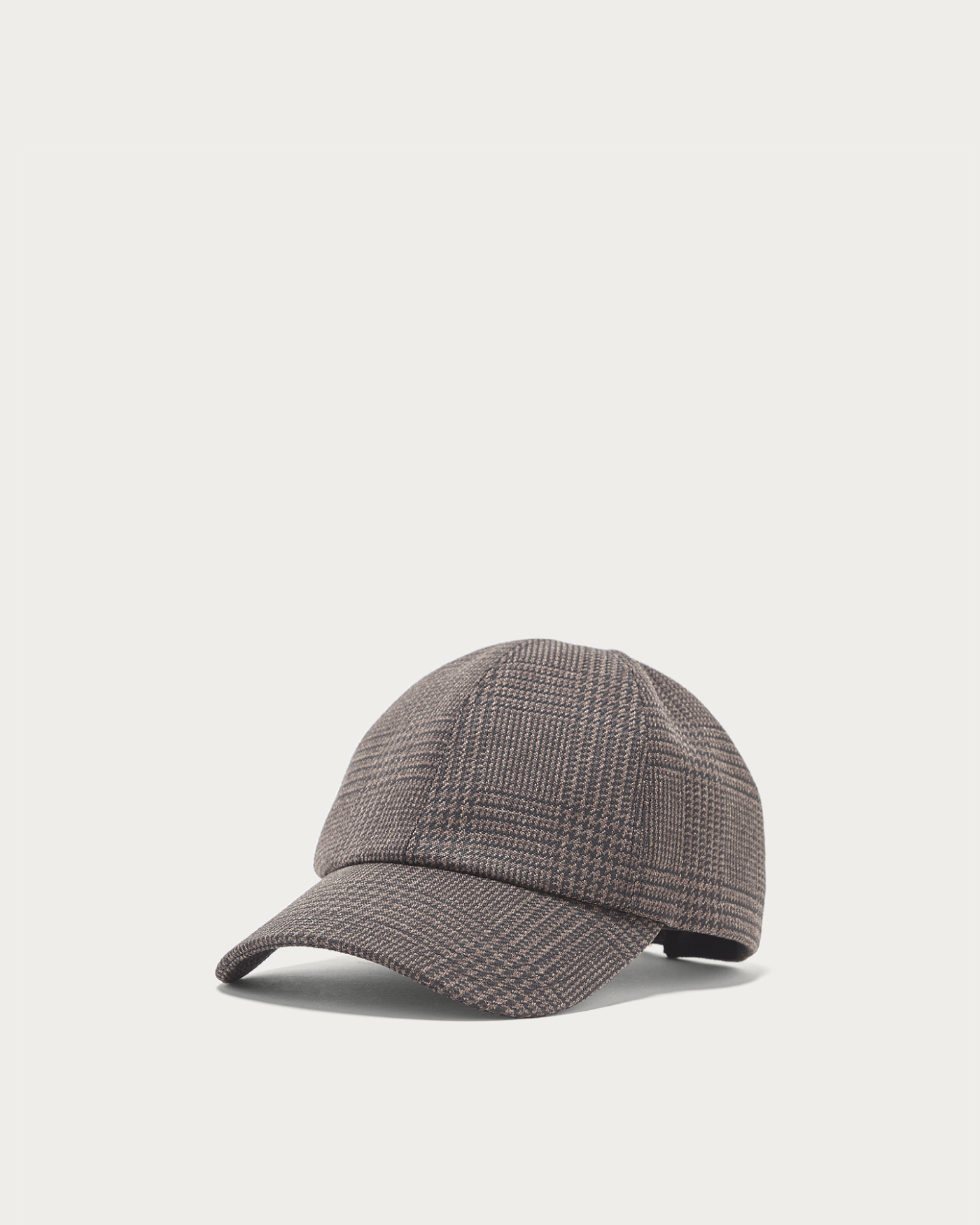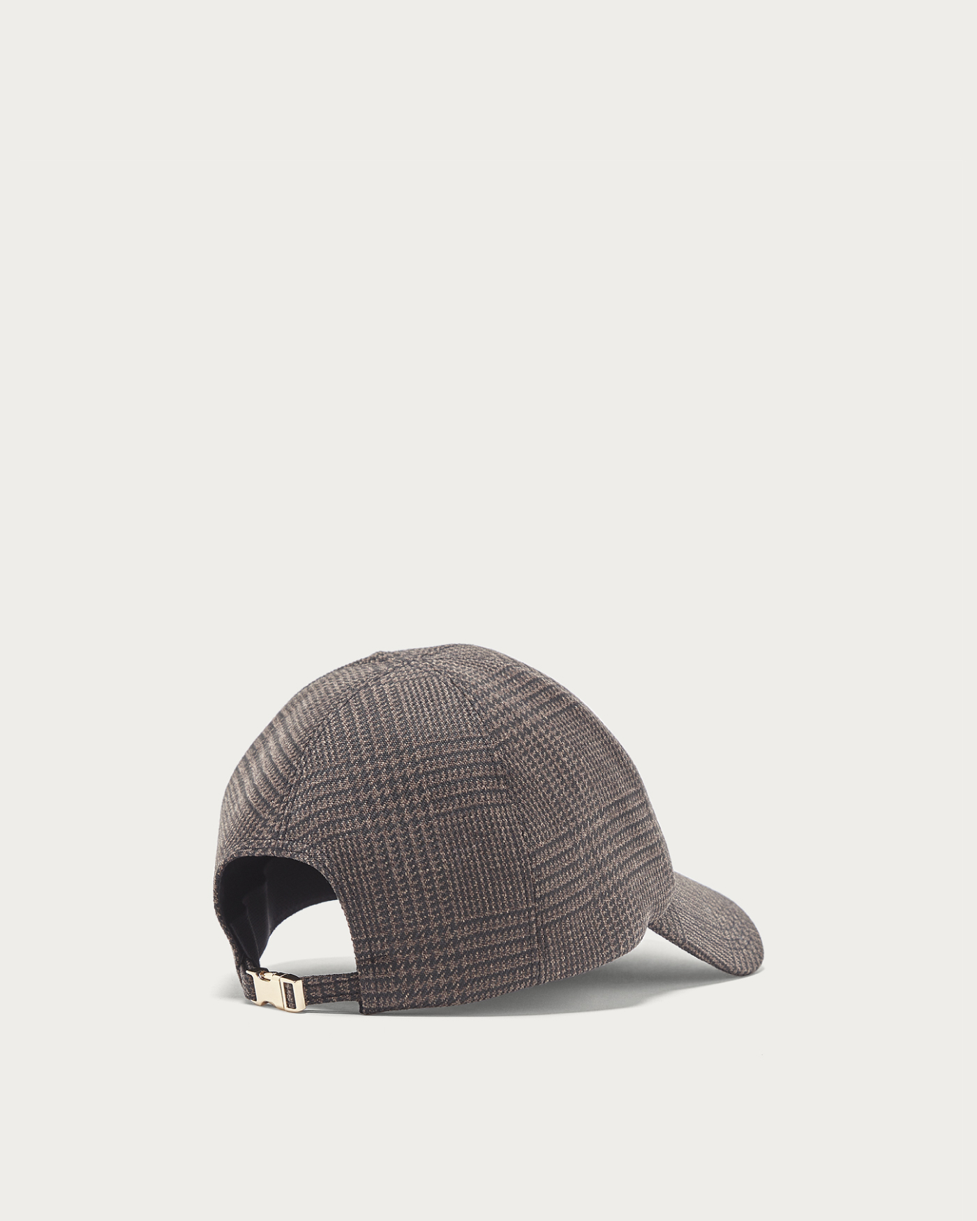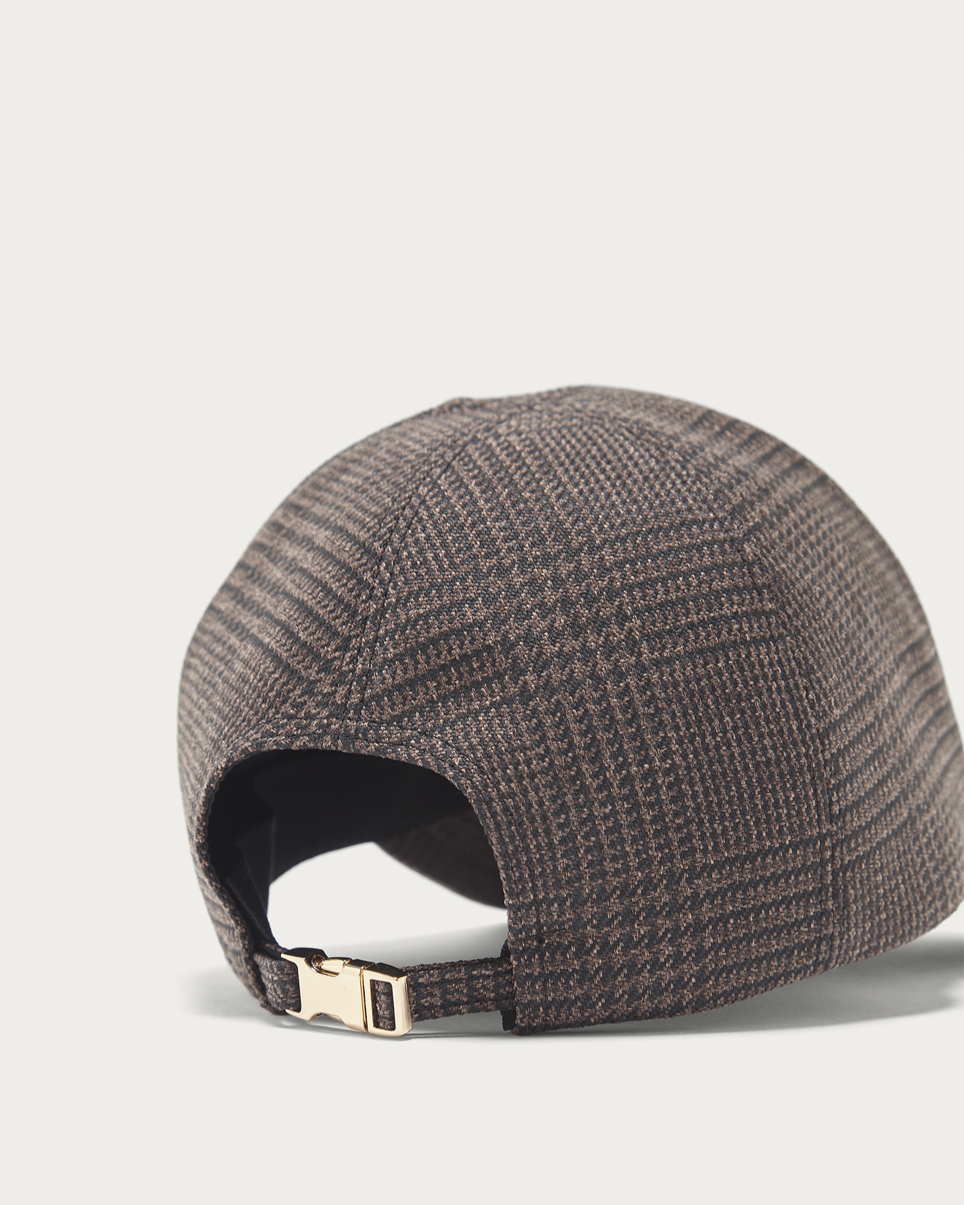 A cap with a simple form that showcases a beautiful check pattern. The understated and calm charm of the glen check adds an accent to your outfit. It features a slightly deeper fit, and the gold buckle on the adjuster belt subtly highlights the back style. The entire cap is treated with UV protection.