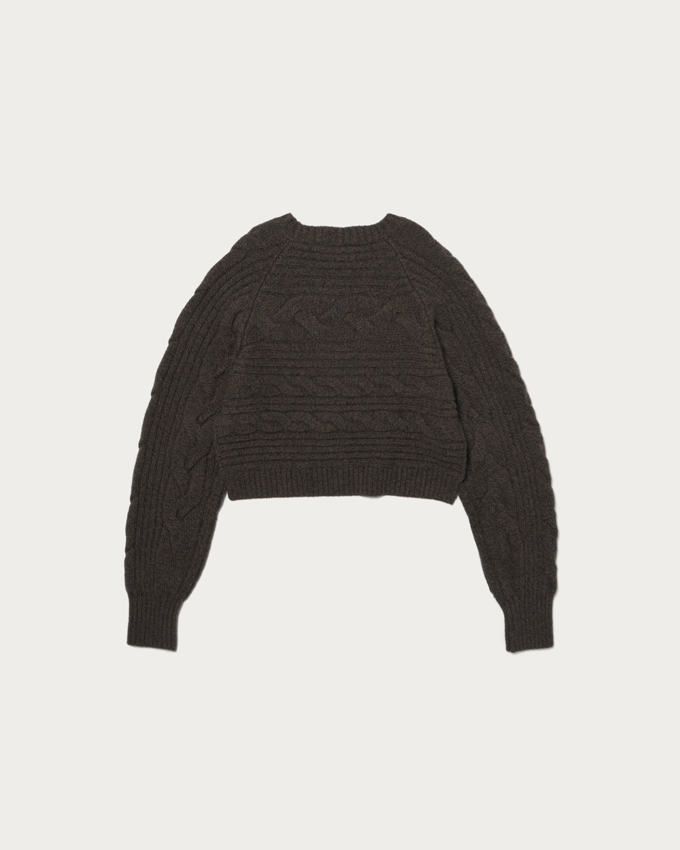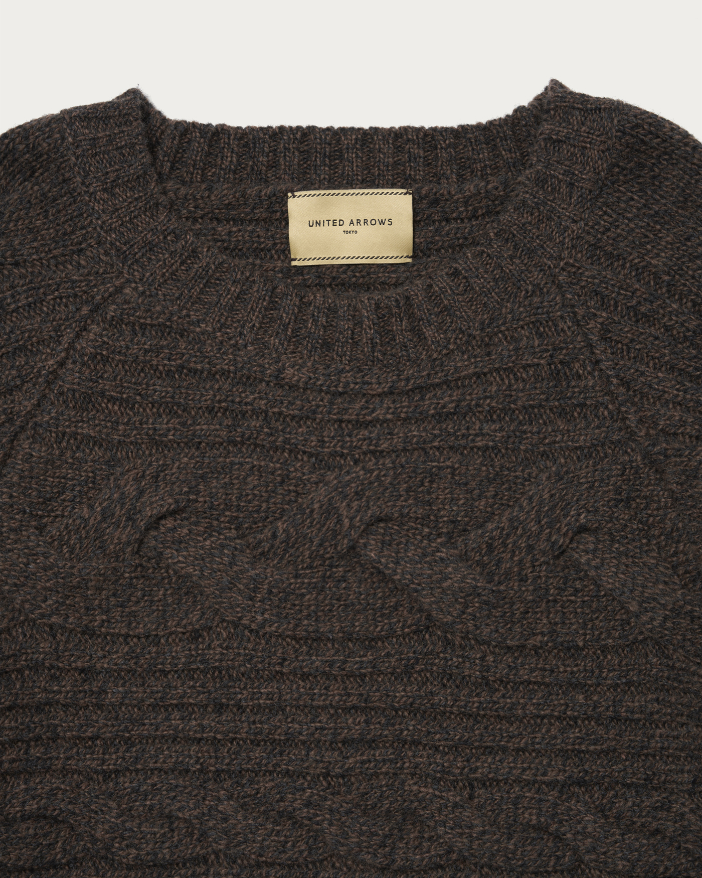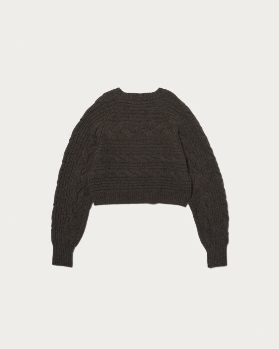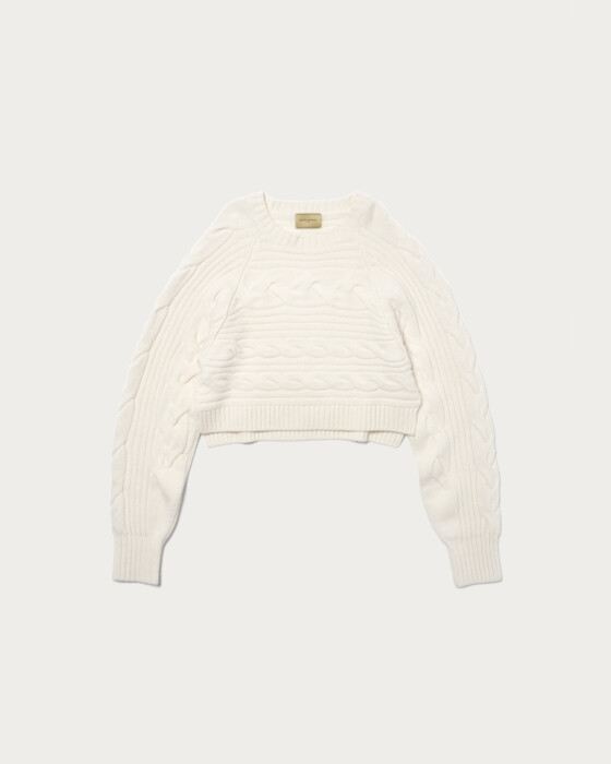 A short-length knit that uses cable knitting on the body horizontally, creating a pattern that appears to connect from the sleeves. The sleeves are longer, allowing for a scarf-like shoulder drape arrangement. Made from classic Italian merino wool, it offers warmth and a gentle touch. This knit is perfect for enjoying layered styles as an accent to your winter outfits.