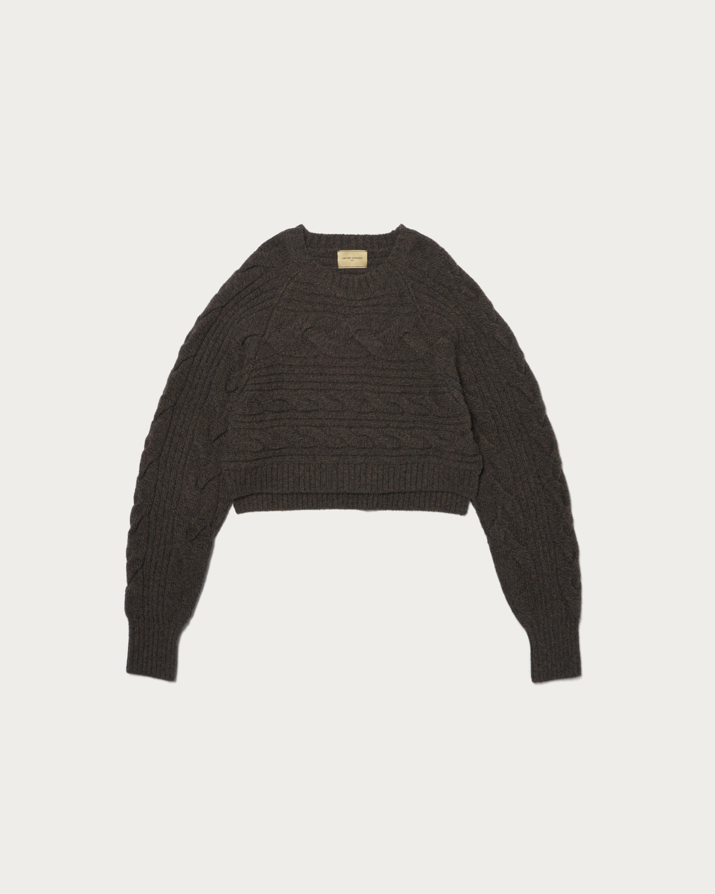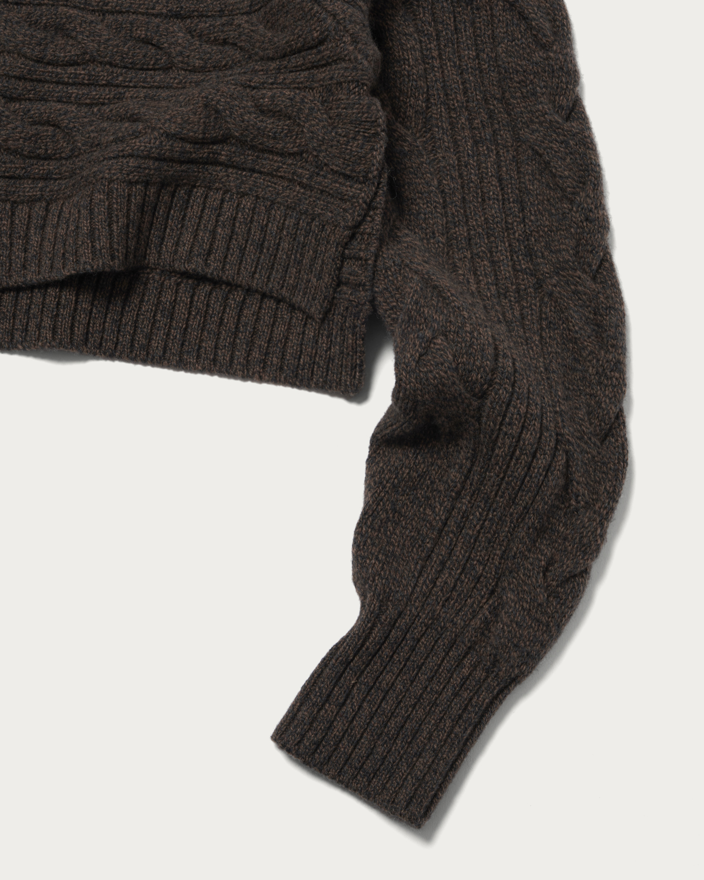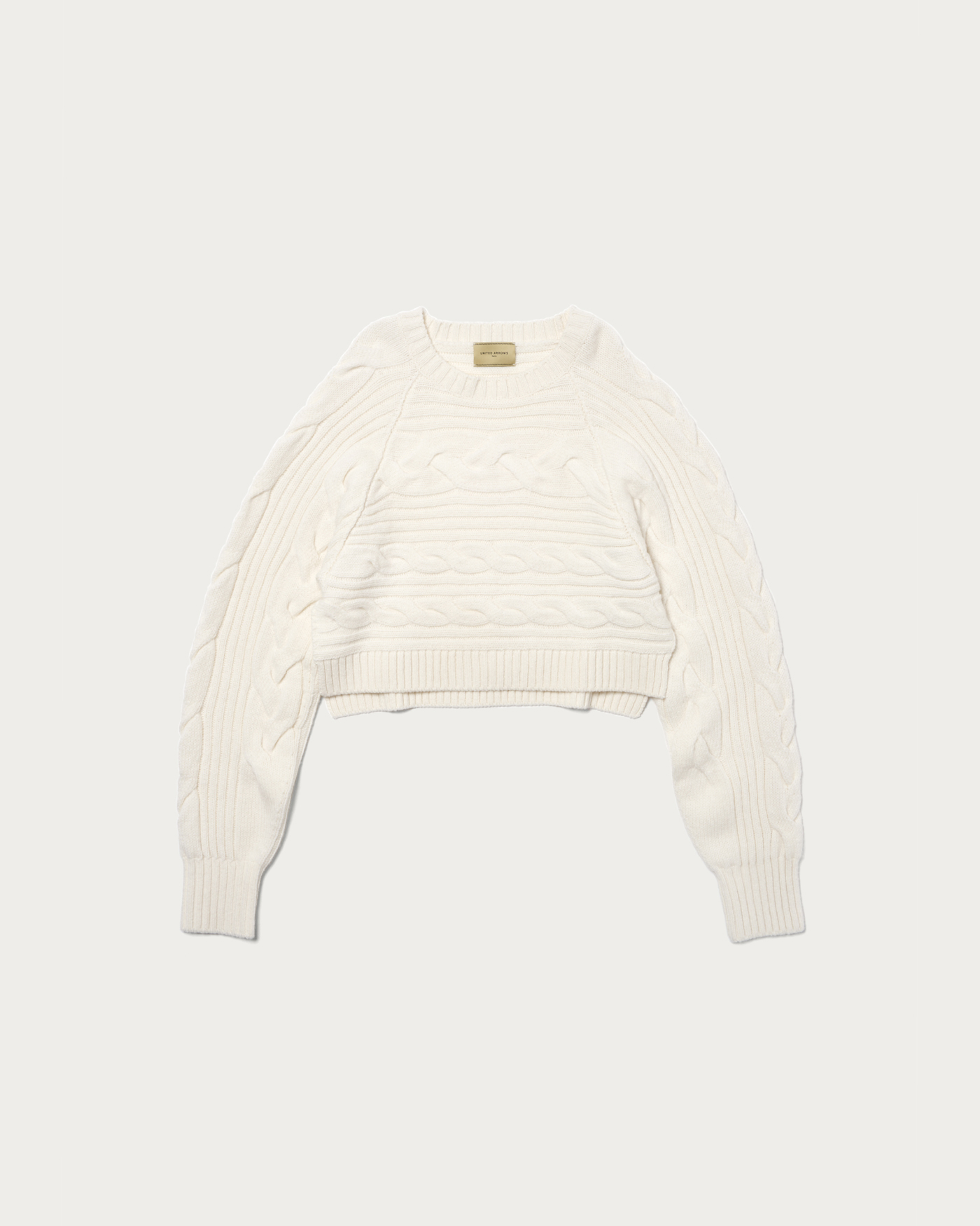 A short-length knit that uses cable knitting on the body horizontally, creating a pattern that appears to connect from the sleeves. The sleeves are longer, allowing for a scarf-like shoulder drape arrangement. Made from classic Italian merino wool, it offers warmth and a gentle touch. This knit is perfect for enjoying layered styles as an accent to your winter outfits.