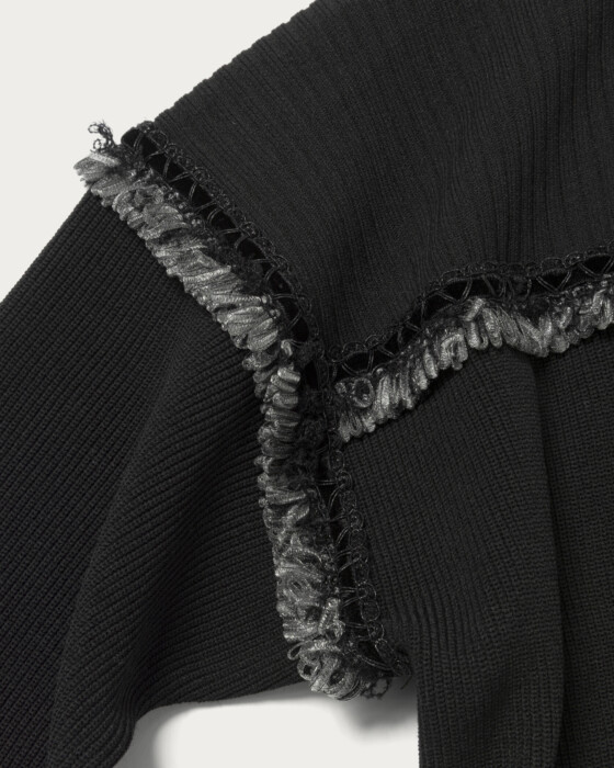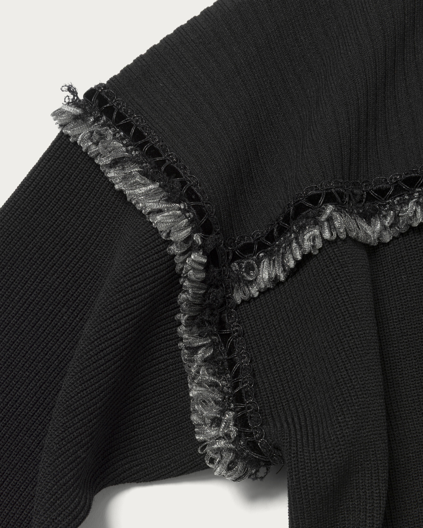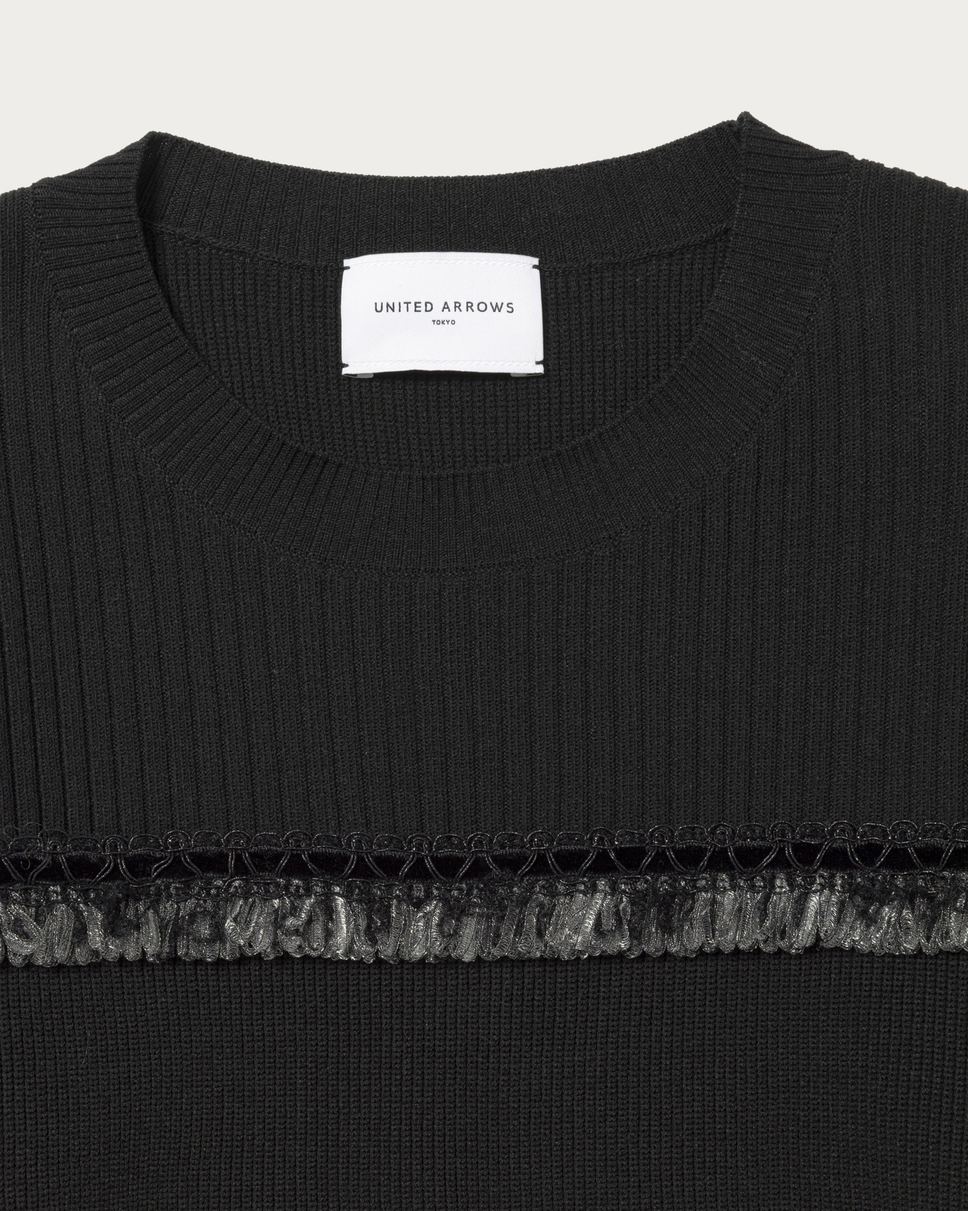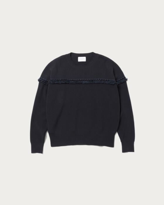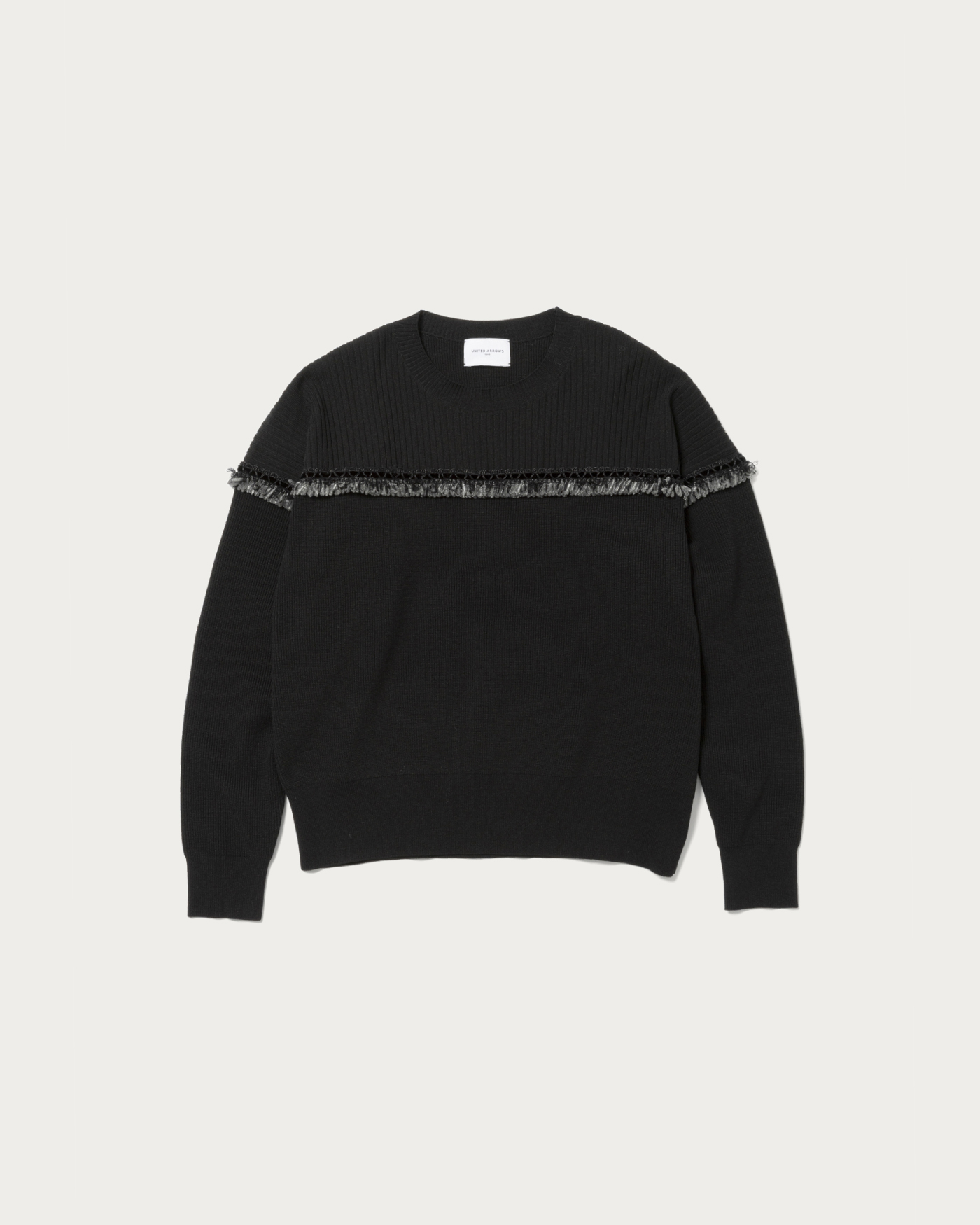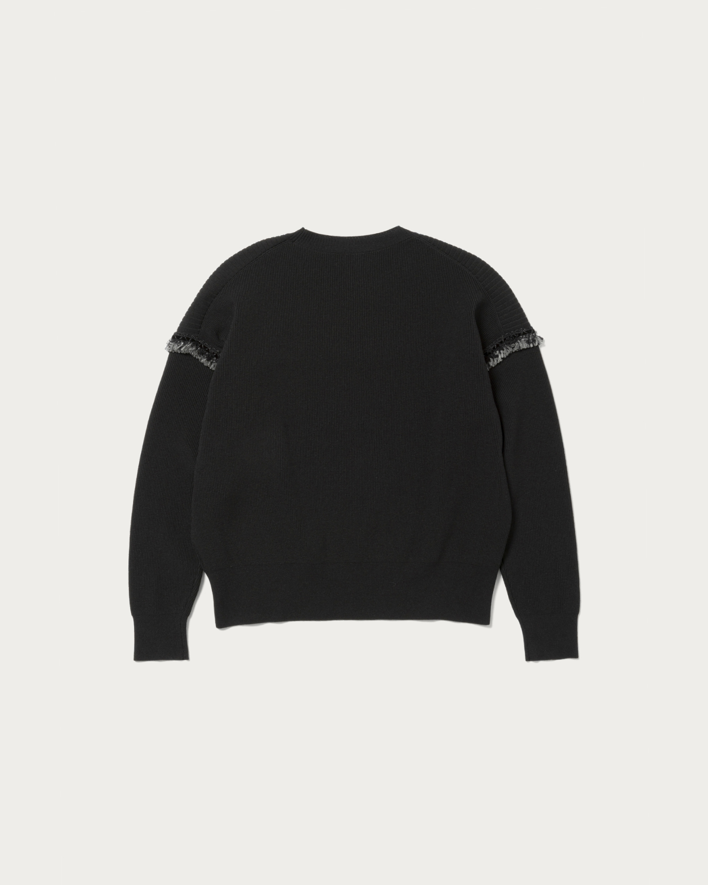 A crew neck knit with eye-catching fringe-like braids that make a statement. Made from a composite material that combines the lightness of polyester with the luster of rayon and silk, this piece features varied knitting patterns on the upper and lower parts of the body for added contrast. It's a versatile item that can be styled elegantly or casually, depending on the choice of bottoms.