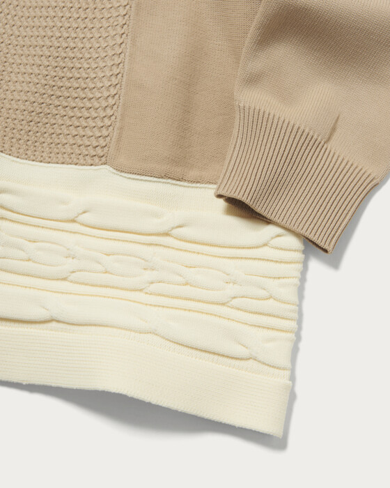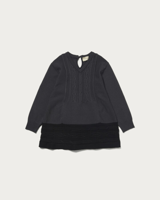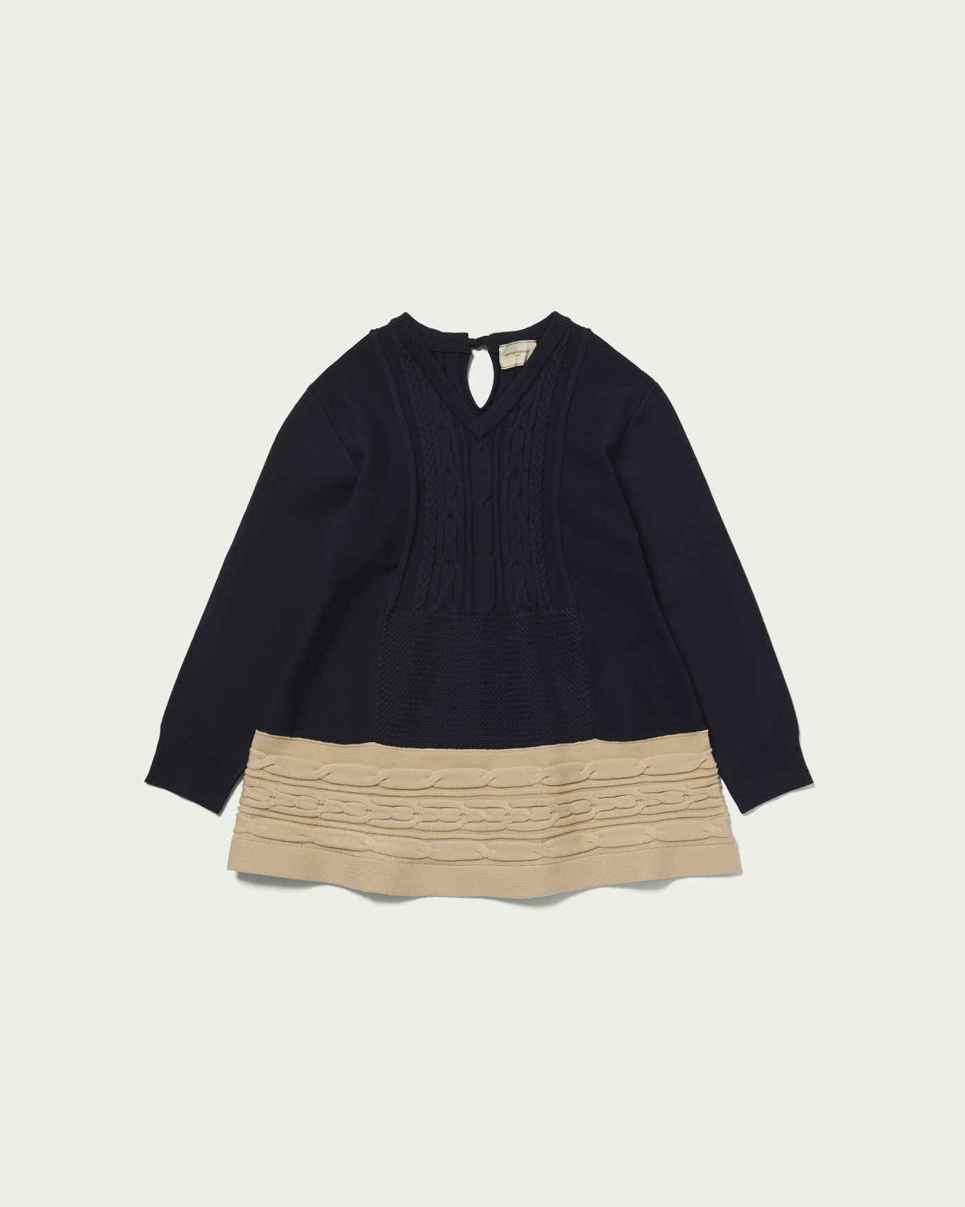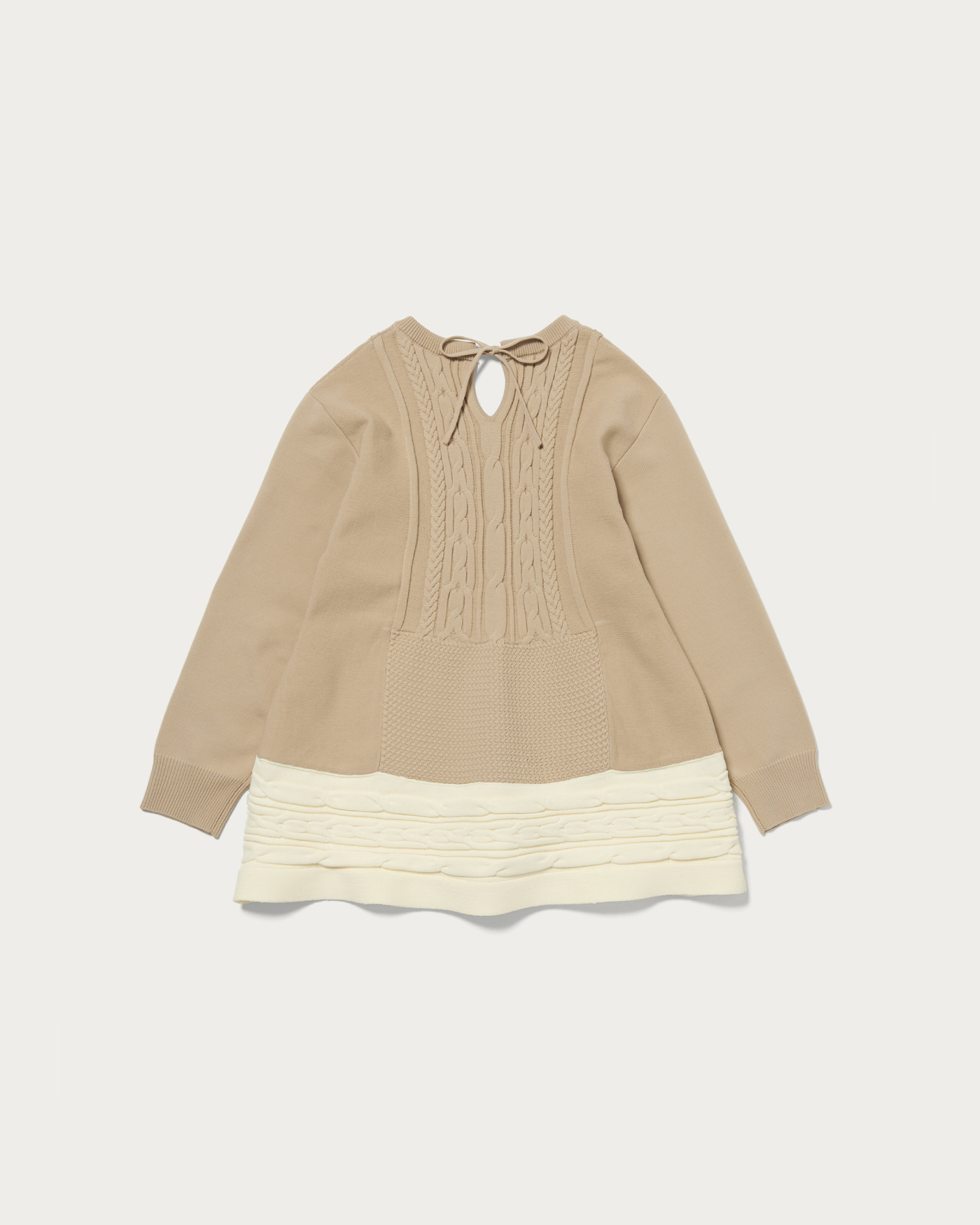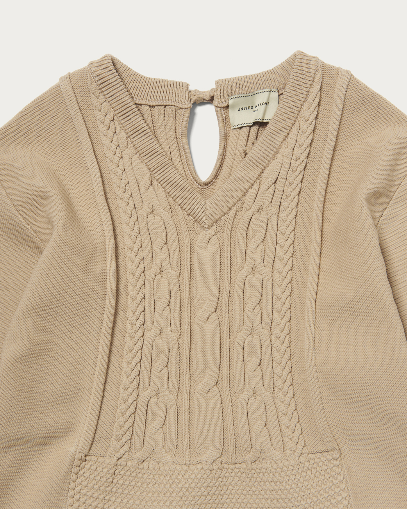 The cable-patterned knit with a peplum silhouette, which was well-received last year, has been updated and is back. While maintaining its structured silhouette, we've changed the knit pattern and neckline to a V-neck. It boasts a stylish design, yet remains lightweight and seasonless, with a comfortable texture that pairs well with a variety of bottoms.