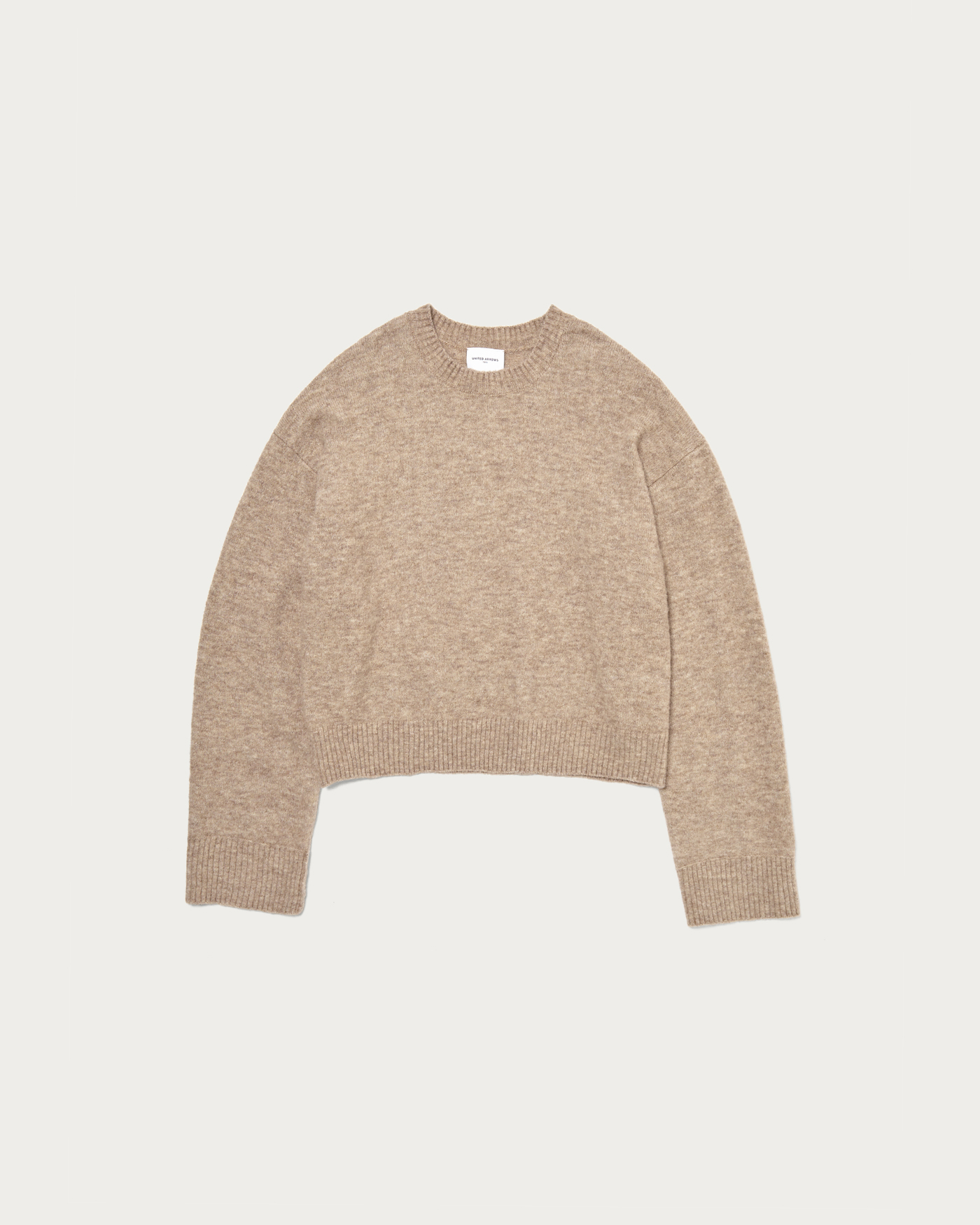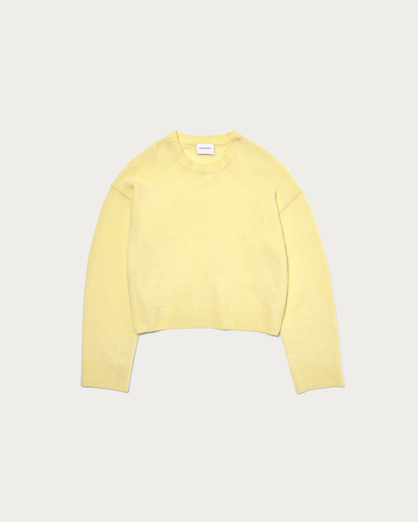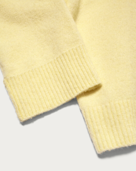 This crew neck knit features a relaxed silhouette and longer sleeves. The rolled-up design at the sleeve ends adds a touch of nuance and accent to what might otherwise be a basic crew neck knit. With a slightly shorter length, it maintains a balanced look without appearing too heavy. Its warm, soft, and lightweight texture makes it an easy addition to your winter wardrobe.