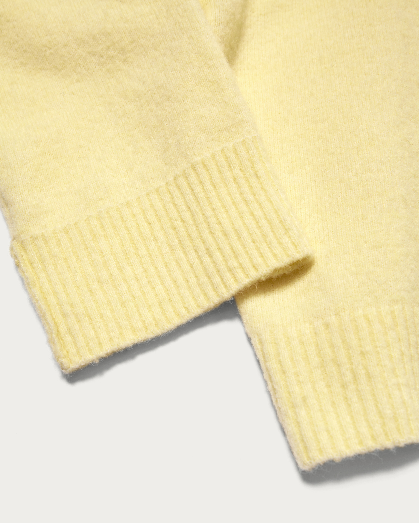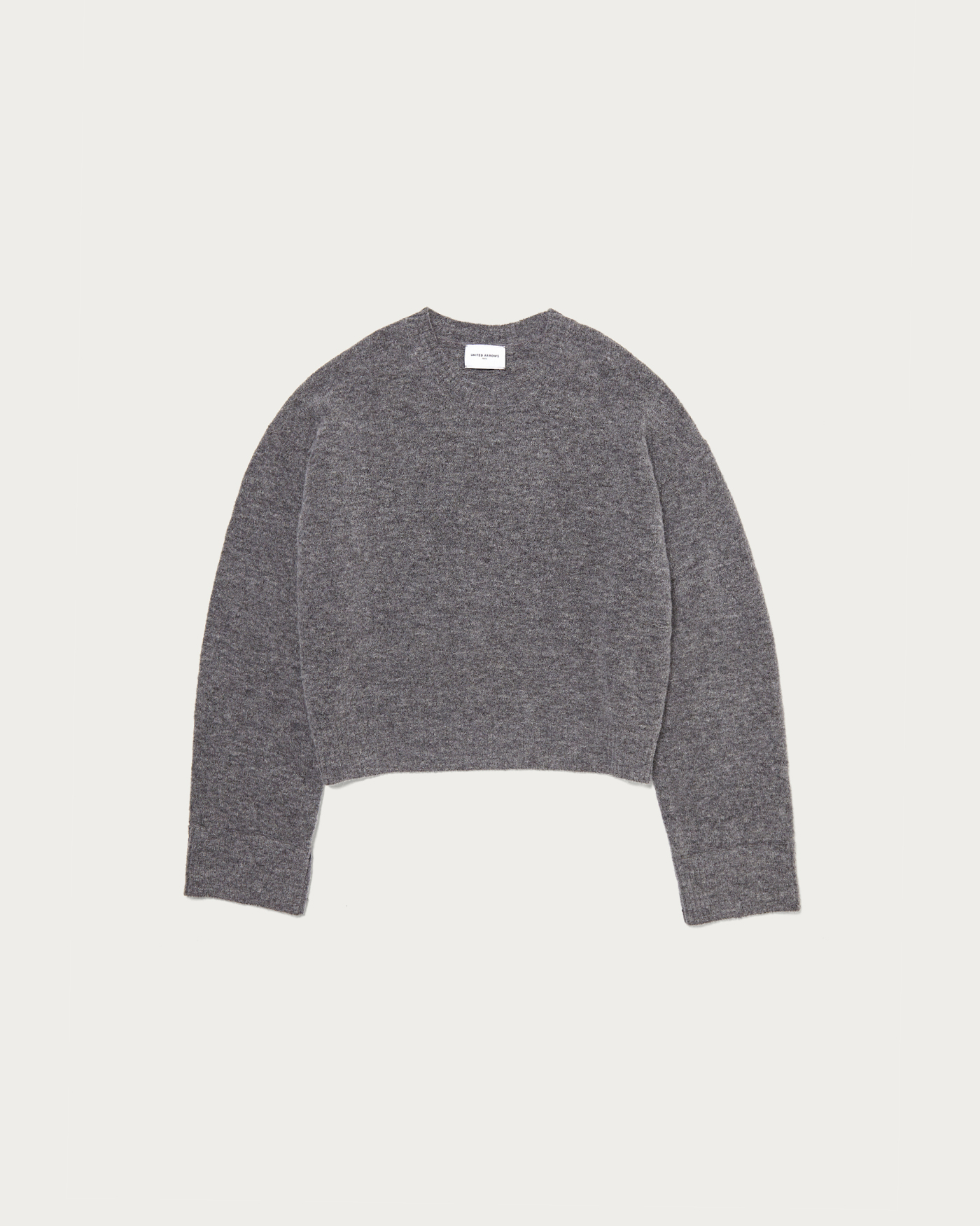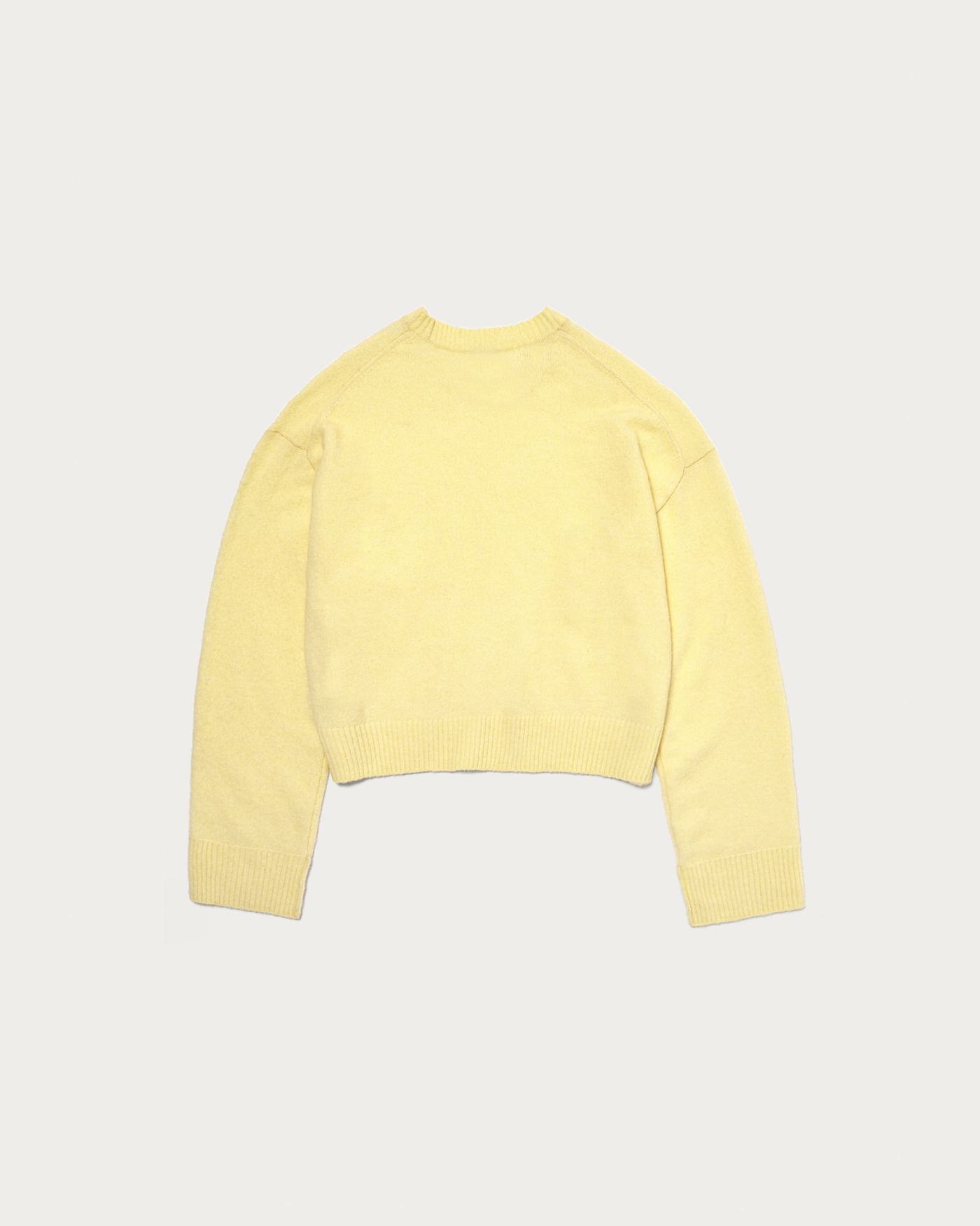 This crew neck knit features a relaxed silhouette and longer sleeves. The rolled-up design at the sleeve ends adds a touch of nuance and accent to what might otherwise be a basic crew neck knit. With a slightly shorter length, it maintains a balanced look without appearing too heavy. Its warm, soft, and lightweight texture makes it an easy addition to your winter wardrobe.