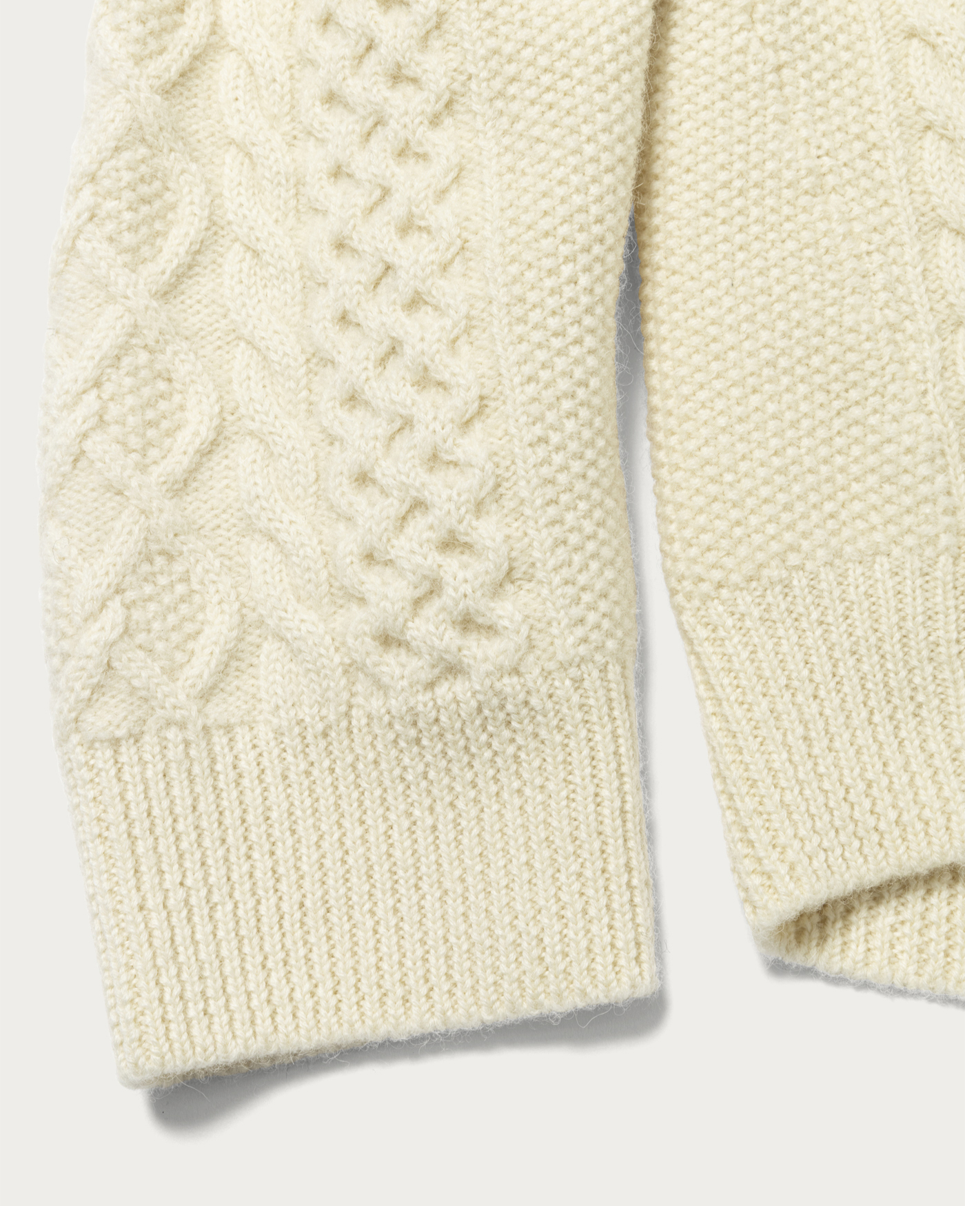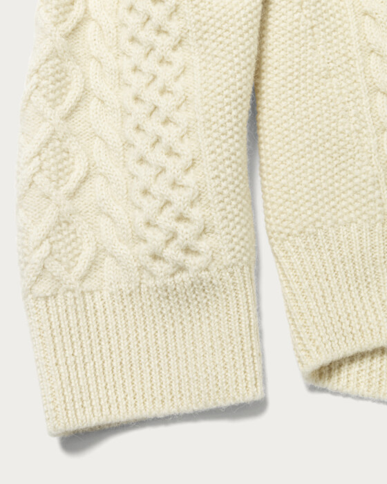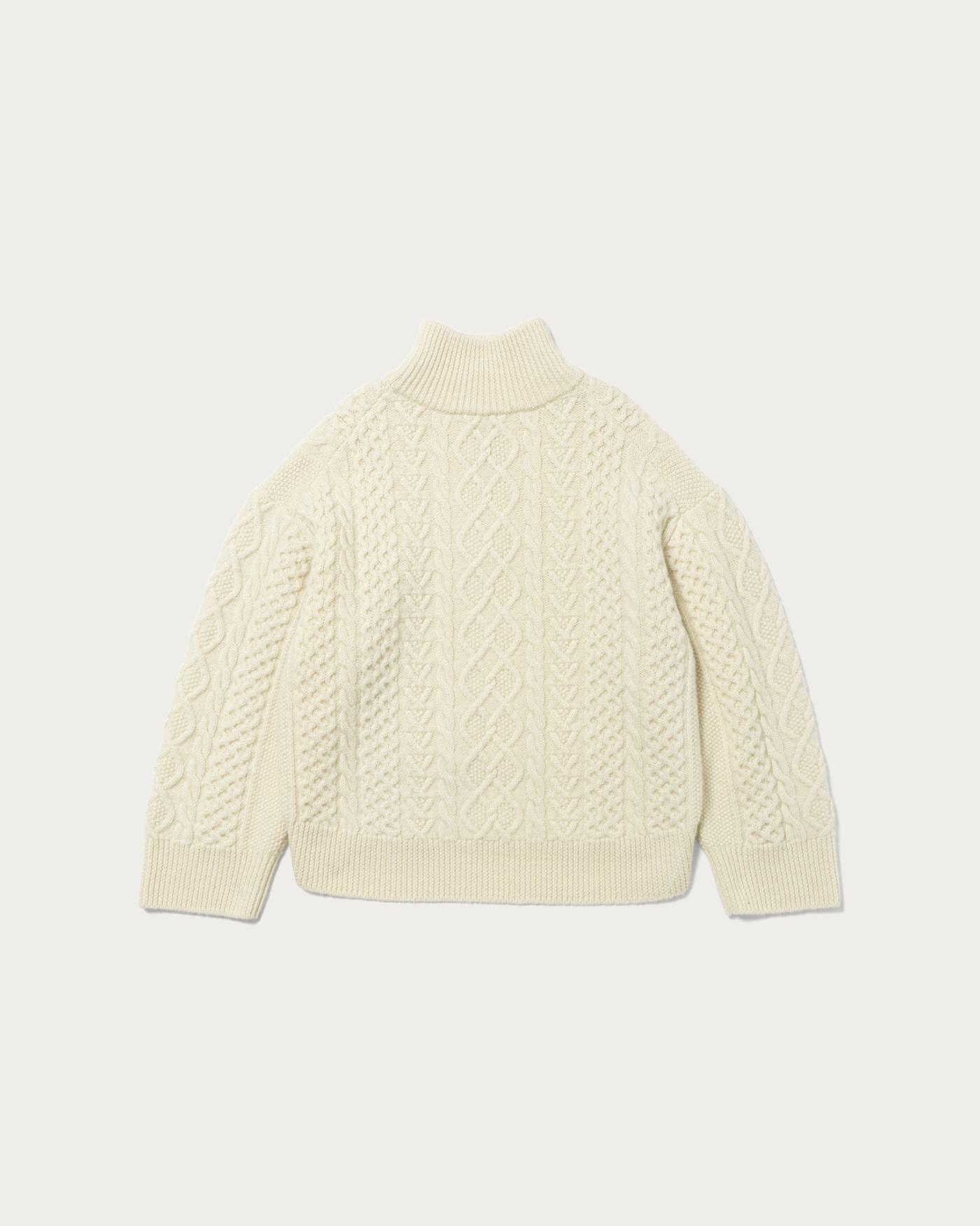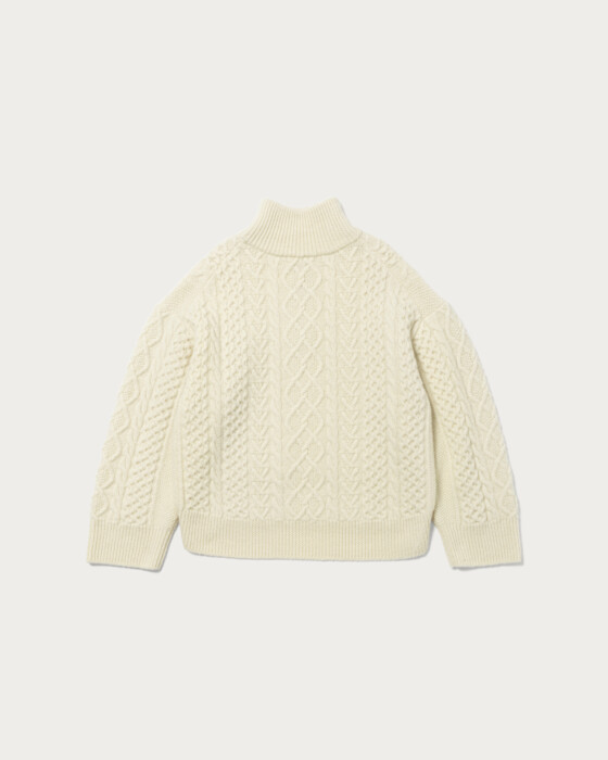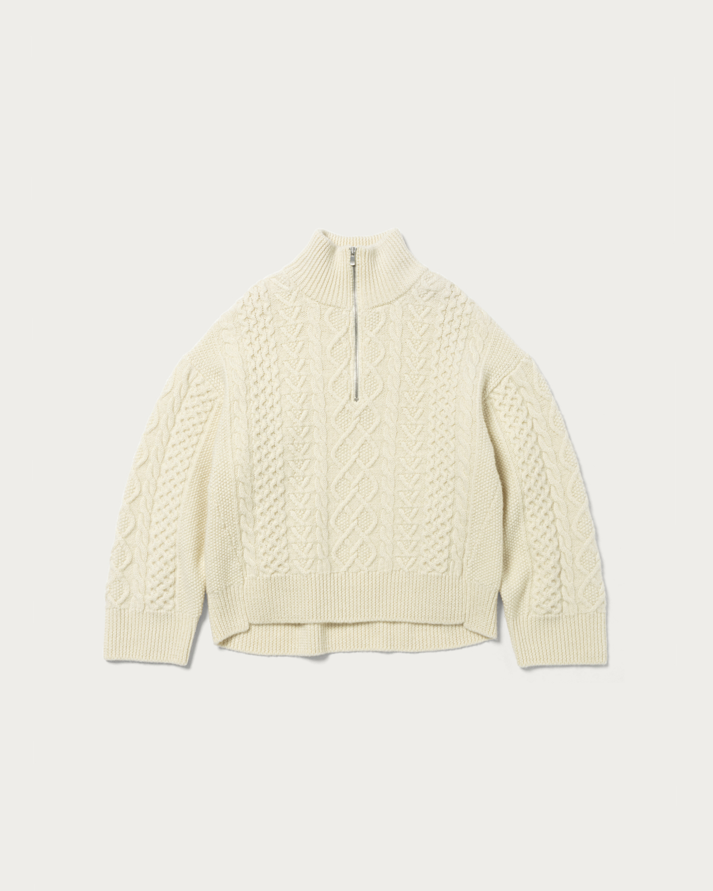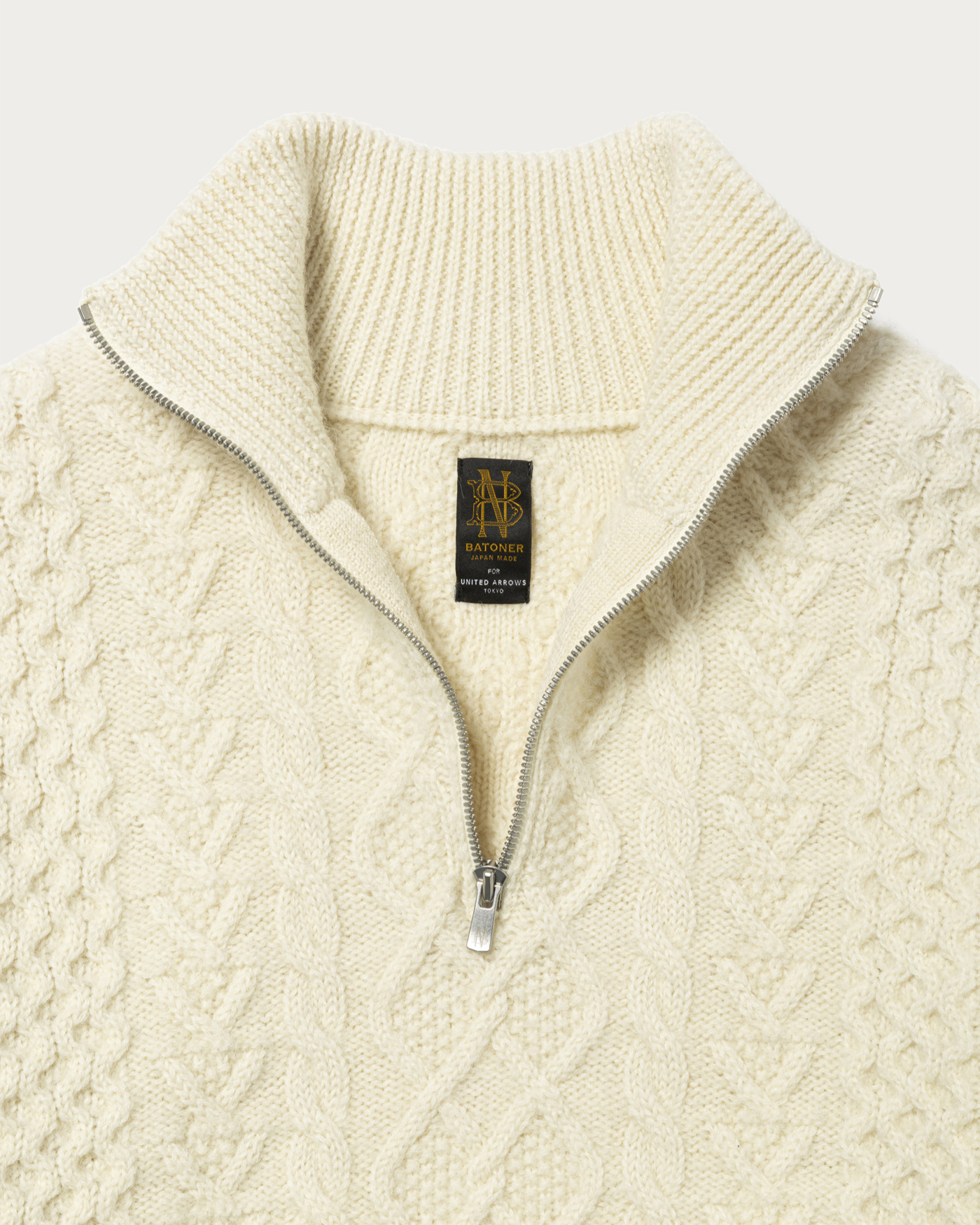 In Yamagata Prefecture, known as a hub for knitwear, the knitwear brand 〈BATONER〉 by Okuyama Meriyasu, which began its collection in the spring and summer of 2013, has released a special edition cable knit. The cable pattern has been reimagined by adding contemporary elements to designs previously offered. This trendy half-zip style features a relaxed fit and slightly voluminous sleeves, resulting in a piece that emphasizes a feminine silhouette.
