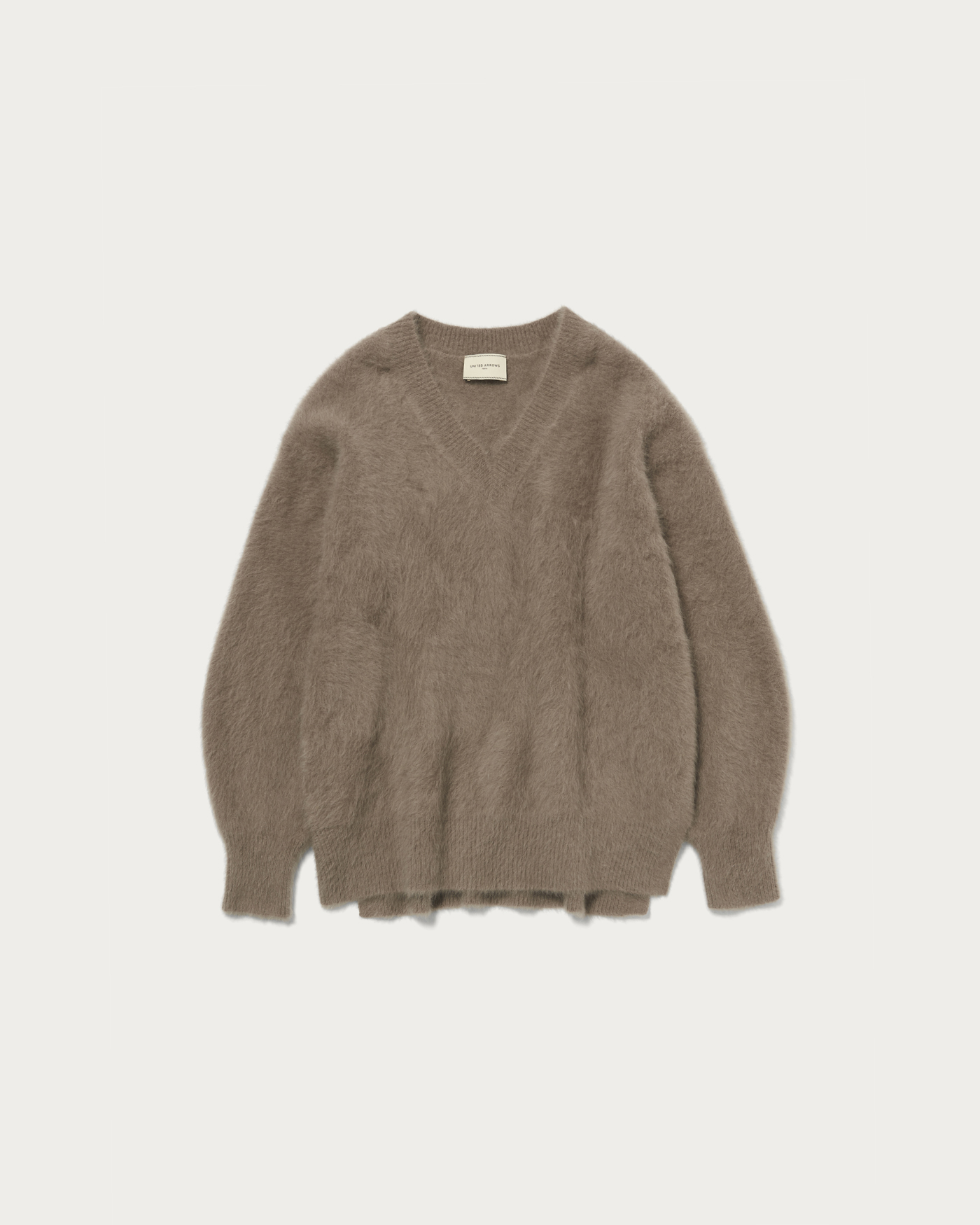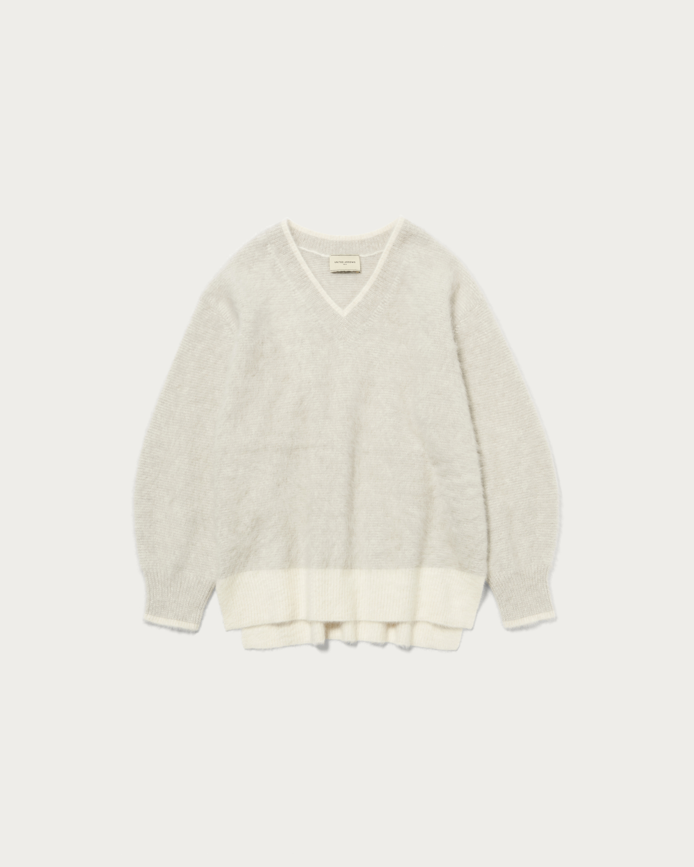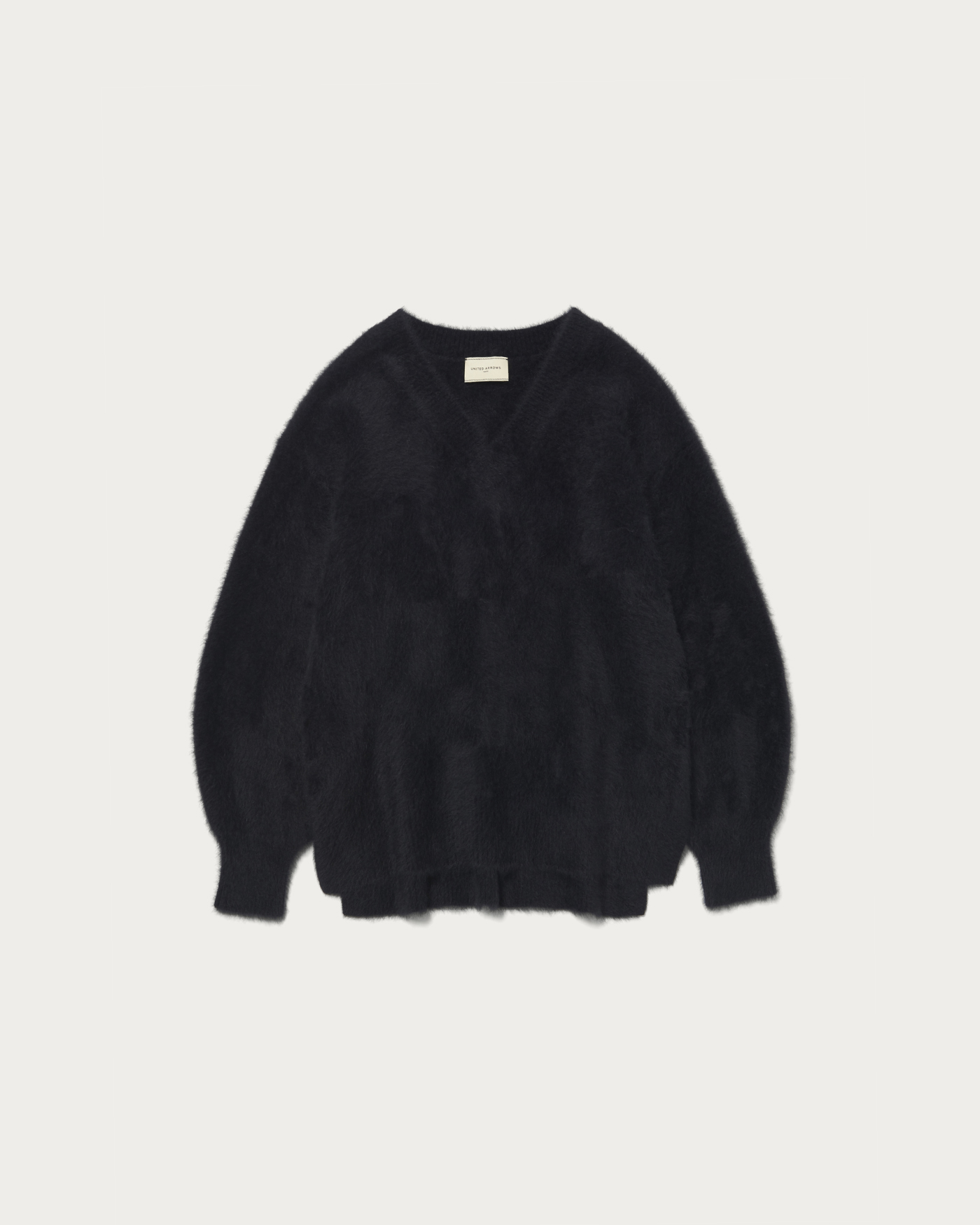 The Fox Cashmere series, which has been highly praised every season, features a V-neck knit that beautifully accentuates the décolletage. This piece stands out on its own, offering a light, soft, and warm feel. Its luxurious, fluffy texture boasts a rich sheen and luster, making it incredibly appealing. The easy-to-wear box silhouette, rounded sleeves, and side slits add a stylish touch when worn. With a perfect balance of relaxed elegance, this piece is a refined addition to your daily wardrobe.