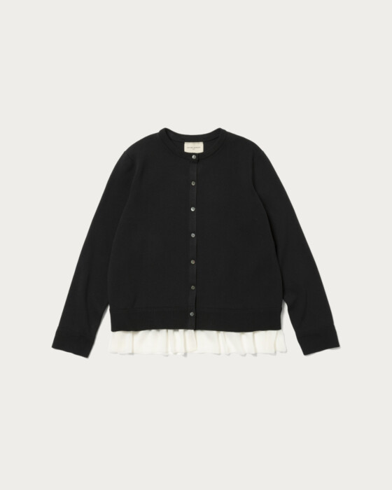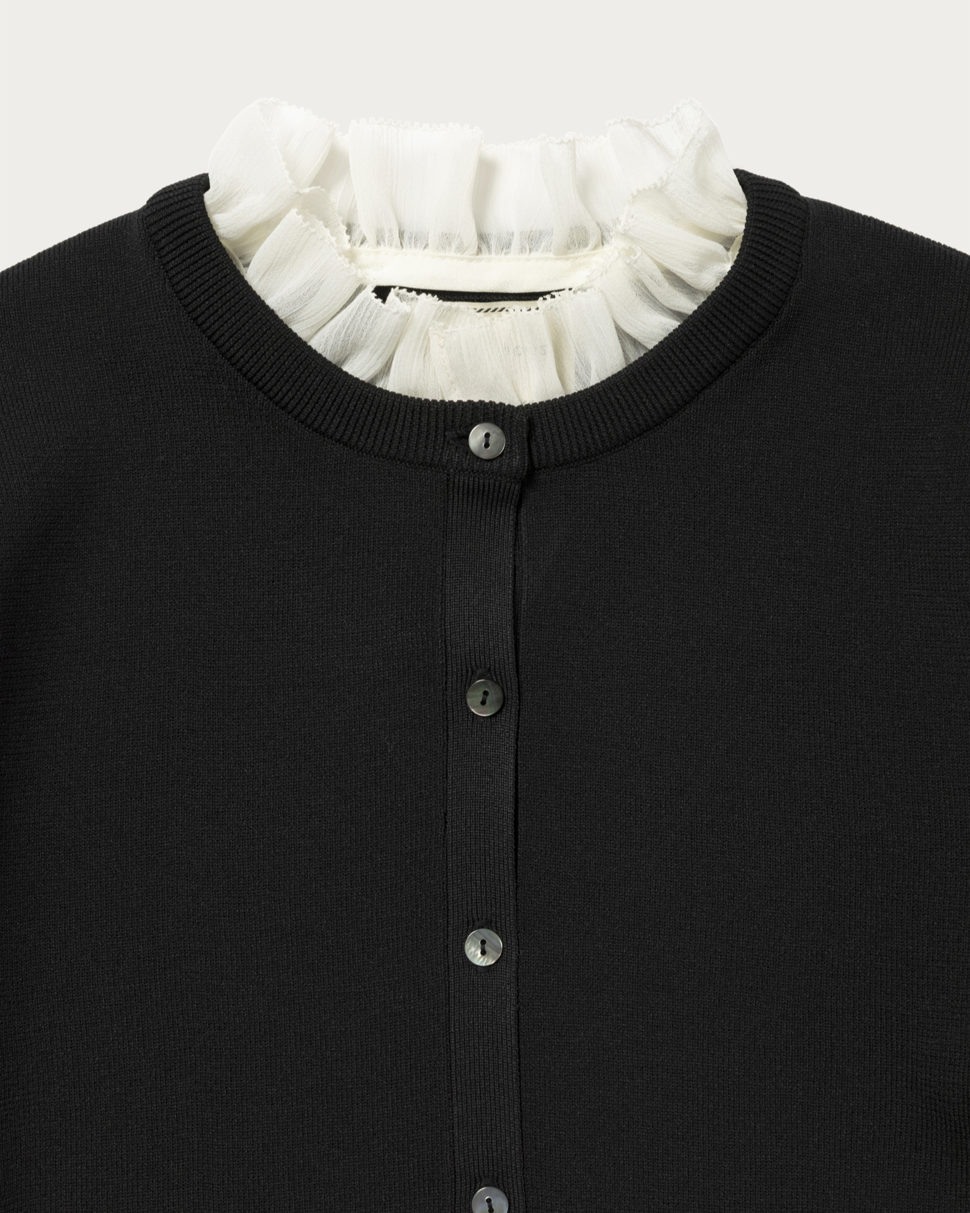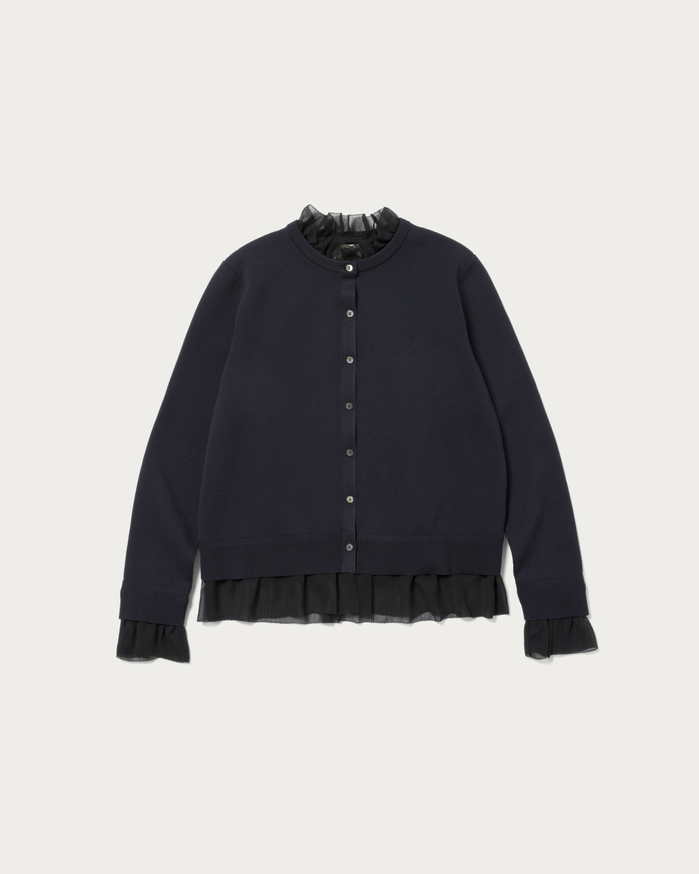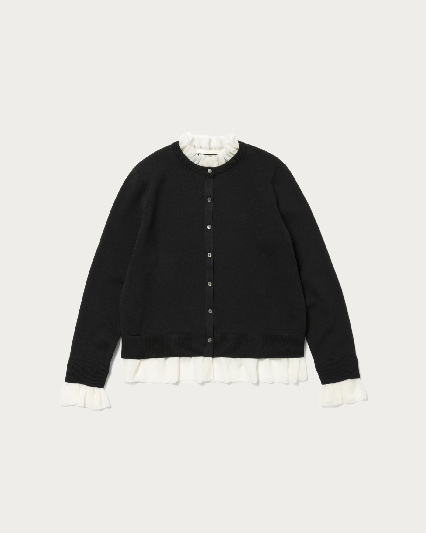 A knit cardigan with a refined impression, featuring soft chiffon peeking out from the collar, cuffs, and hem. The chiffon parts are detachable, allowing for 4-way styling. This versatile piece can be adapted to different occasions, paired items, or moods. Its design makes it suitable for both on and off-duty wear, making it a great choice for office settings as well.