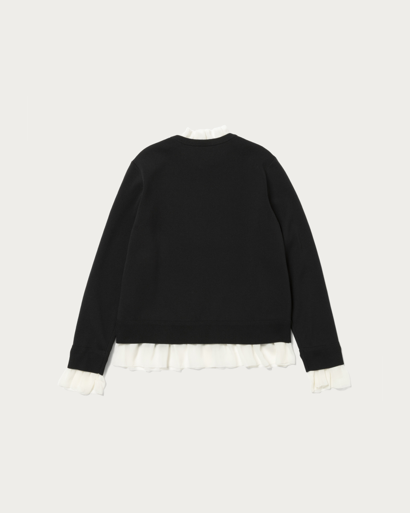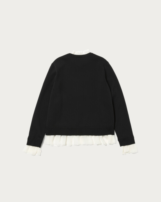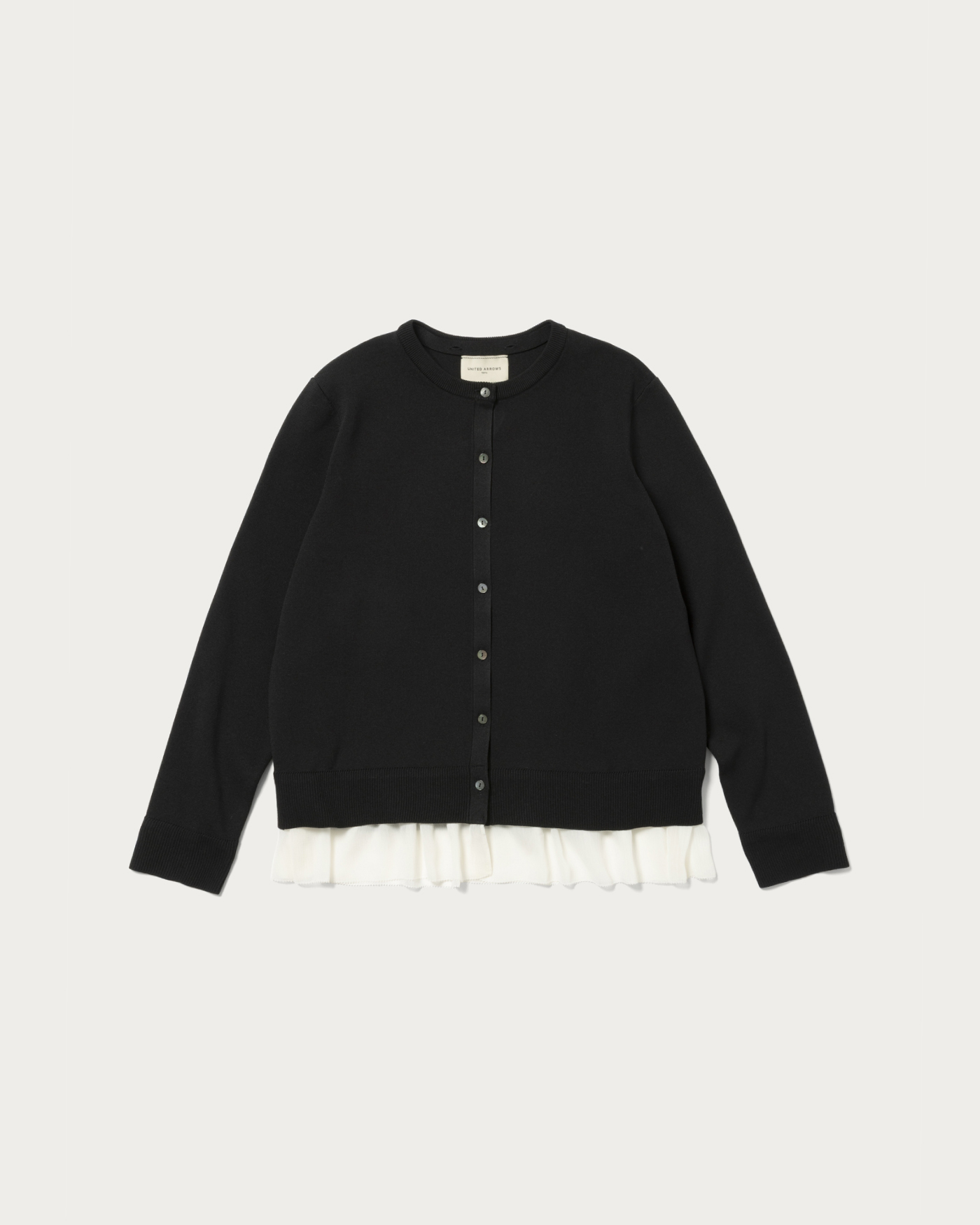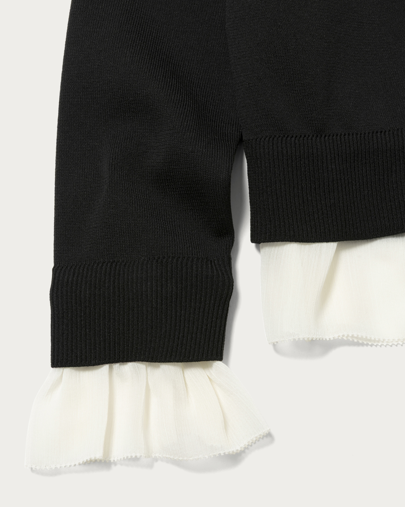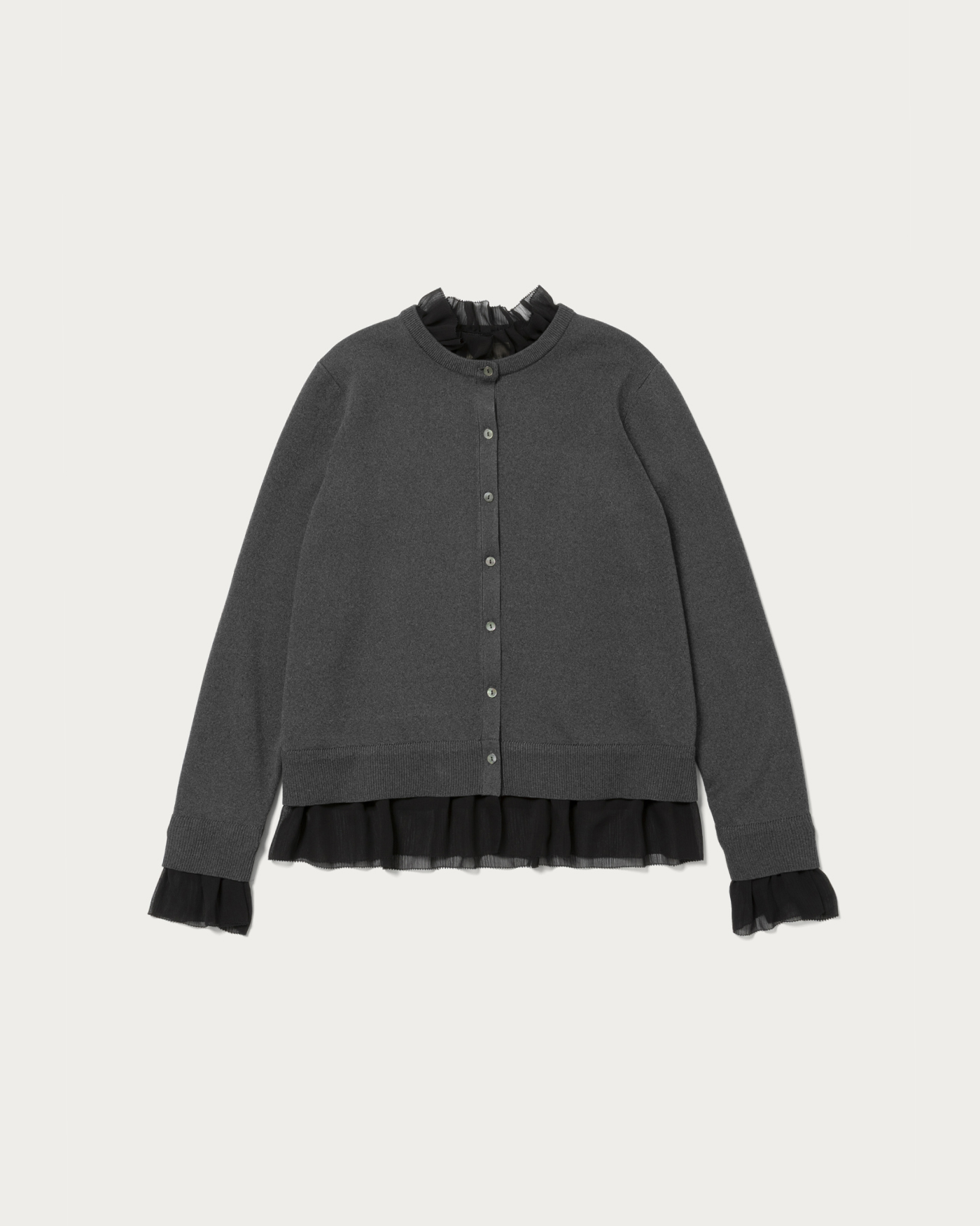 A knit cardigan with a refined impression, featuring soft chiffon peeking out from the collar, cuffs, and hem. The chiffon parts are detachable, allowing for 4-way styling. This versatile piece can be adapted to different occasions, paired items, or moods. Its design makes it suitable for both on and off-duty wear, making it a great choice for office settings as well.
