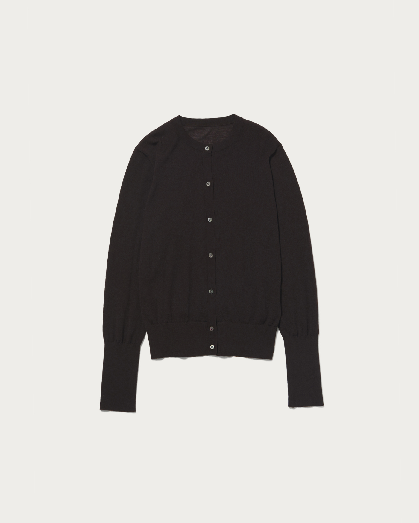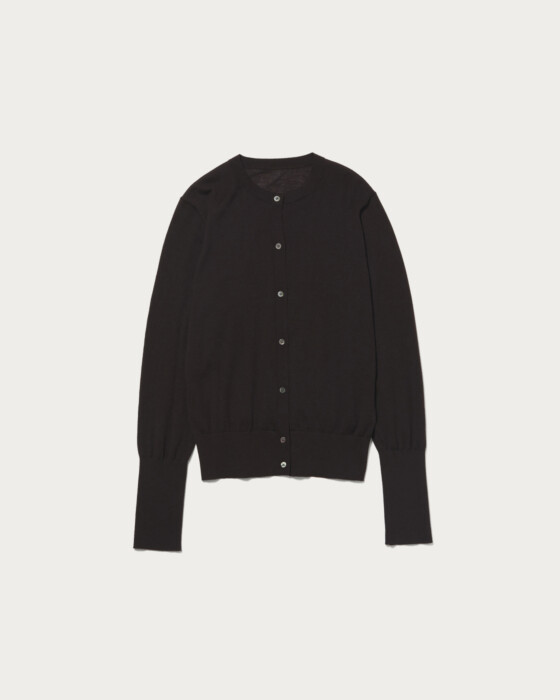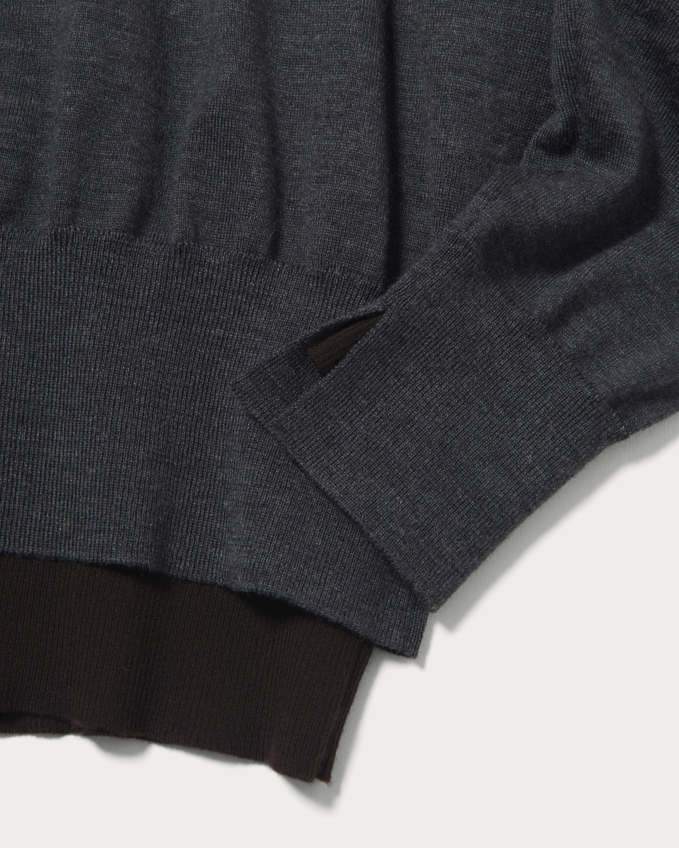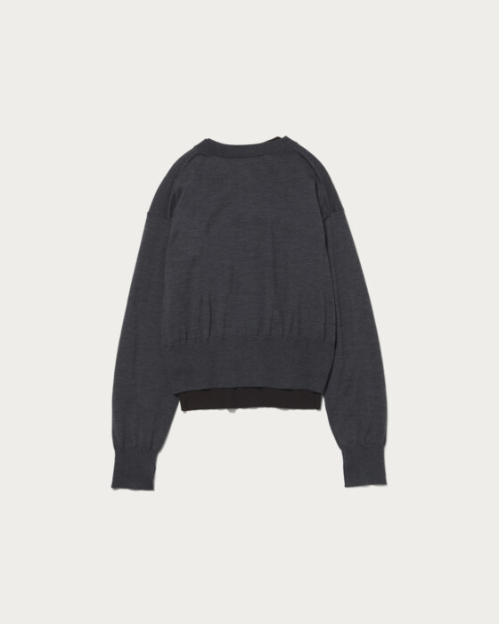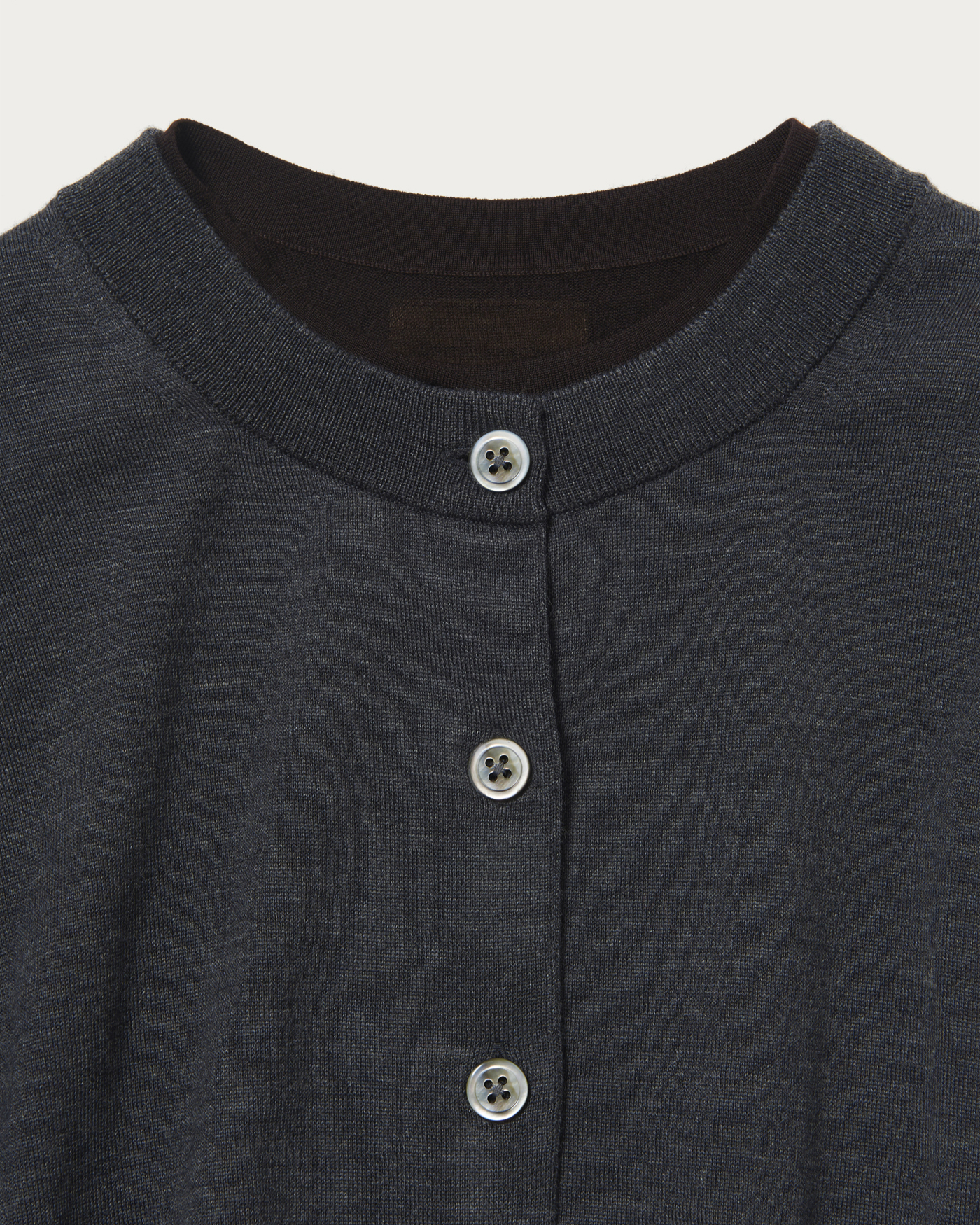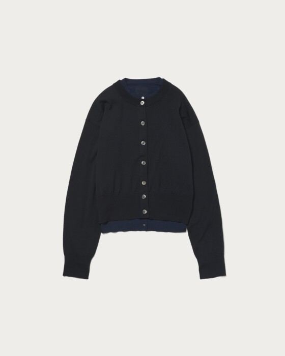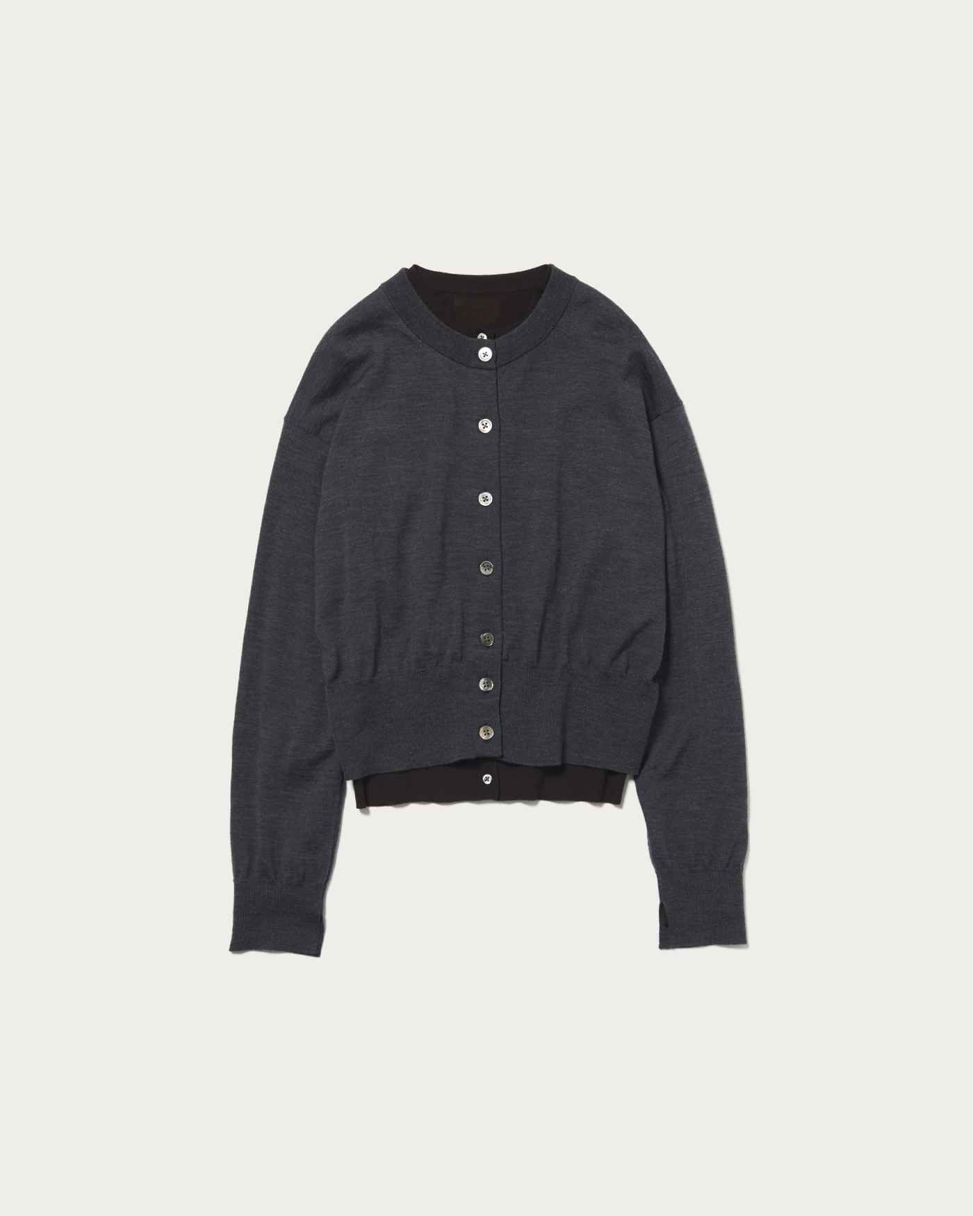 A knit cardigan that refreshes your usual style just by layering. By layering crew cardigans with different silhouettes, you can enjoy a perfect balance. The top features a relaxed silhouette with slits at the cuffs, while the bottom has a fitted silhouette with longer sleeves. This cardigan not only enhances your layered style but can also be worn individually, offering a wide range of coordination options.