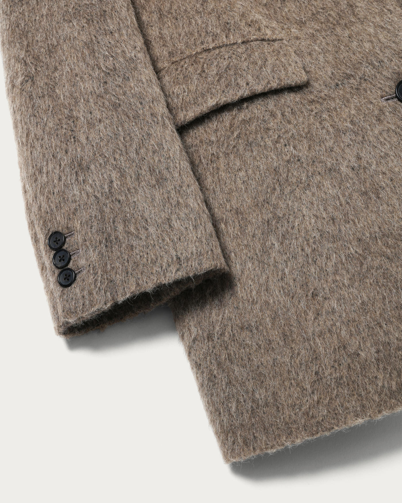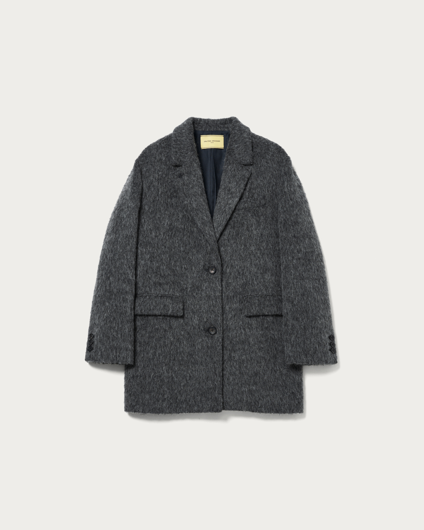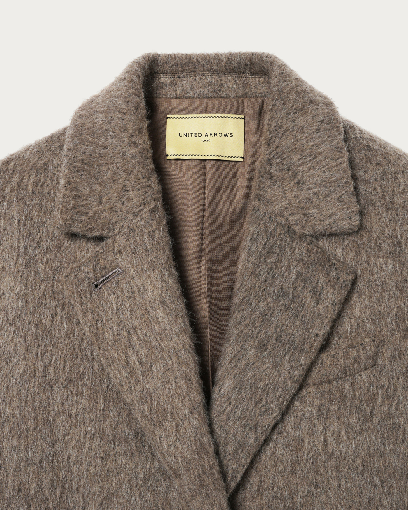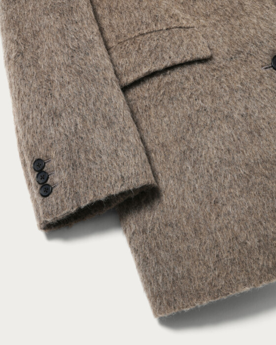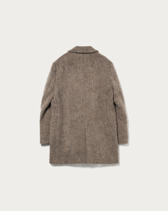 This jacket coat gives the impression of a men's jacket with slightly larger shoulder and body width than usual. It features a 2-way collar with a buttonhole on the lapel, allowing it to be converted into a cold-weather style by fastening the body buttons. The surface incorporates alpaca, with long fibers for a shaggy finish that adds lightness. It can be used as a light outer layer before the season fully sets in, and it shines as a layered winter outerwear piece, making it an exceptionally attractive jacket coat.