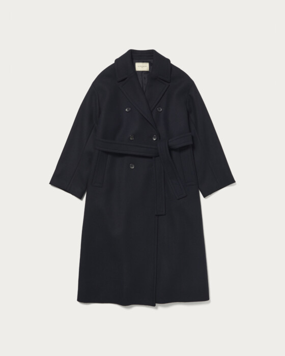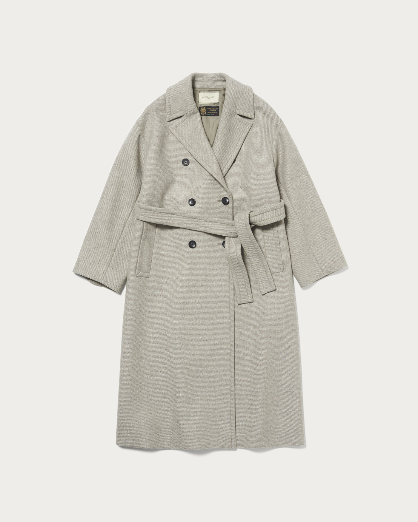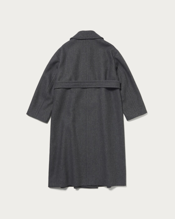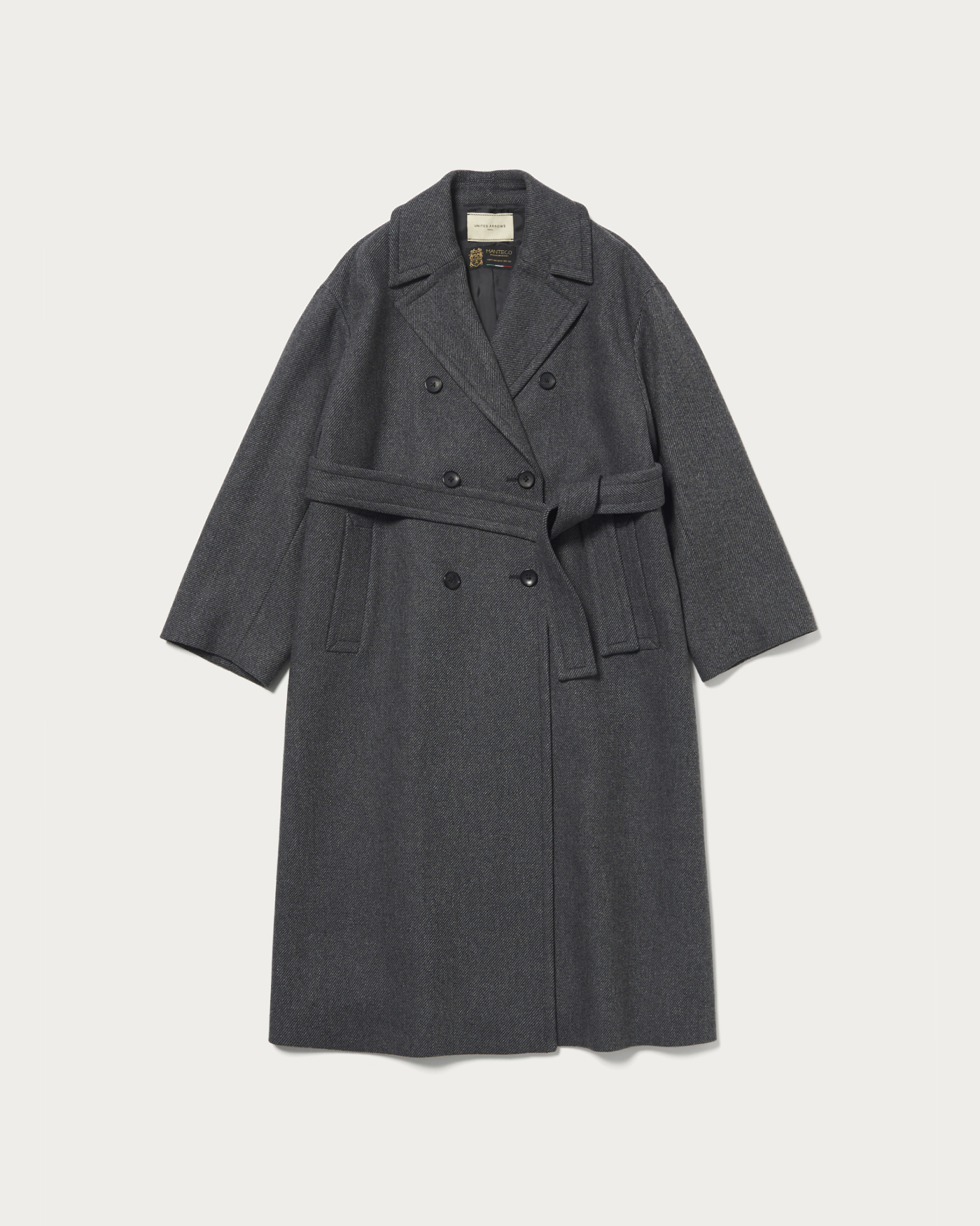 A double-breasted coat with six buttons that defies trends, featuring bold stitching as an accent for a masculine impression. The coat includes a belt and is lined for effective cold protection, with a three-dimensional tailoring that highlights the texture of the material. It is crafted using originally developed materials made from recycled resources, such as collected old clothes and fabric scraps. The unique, nuanced colors that come from the recycled materials are particularly appealing.
