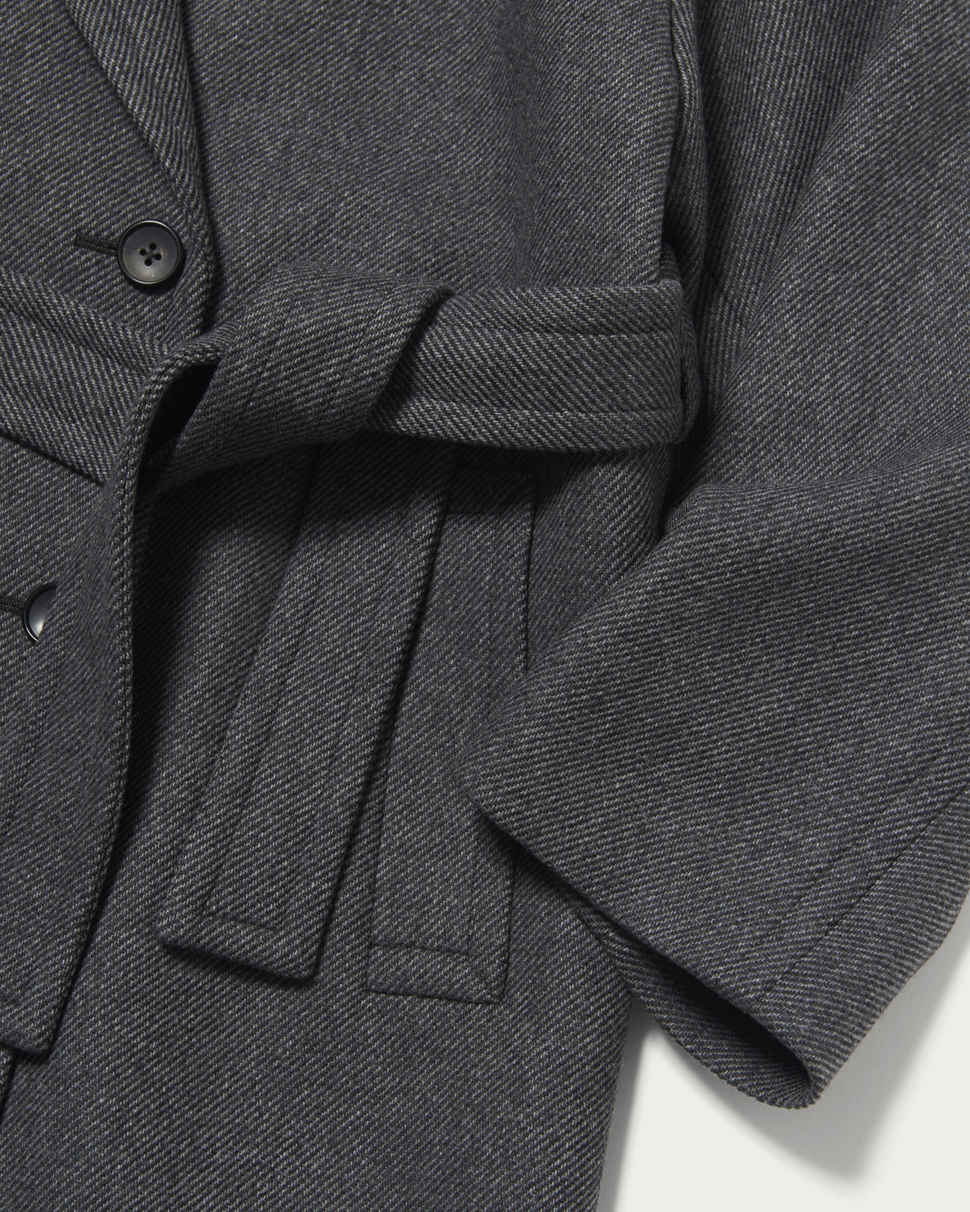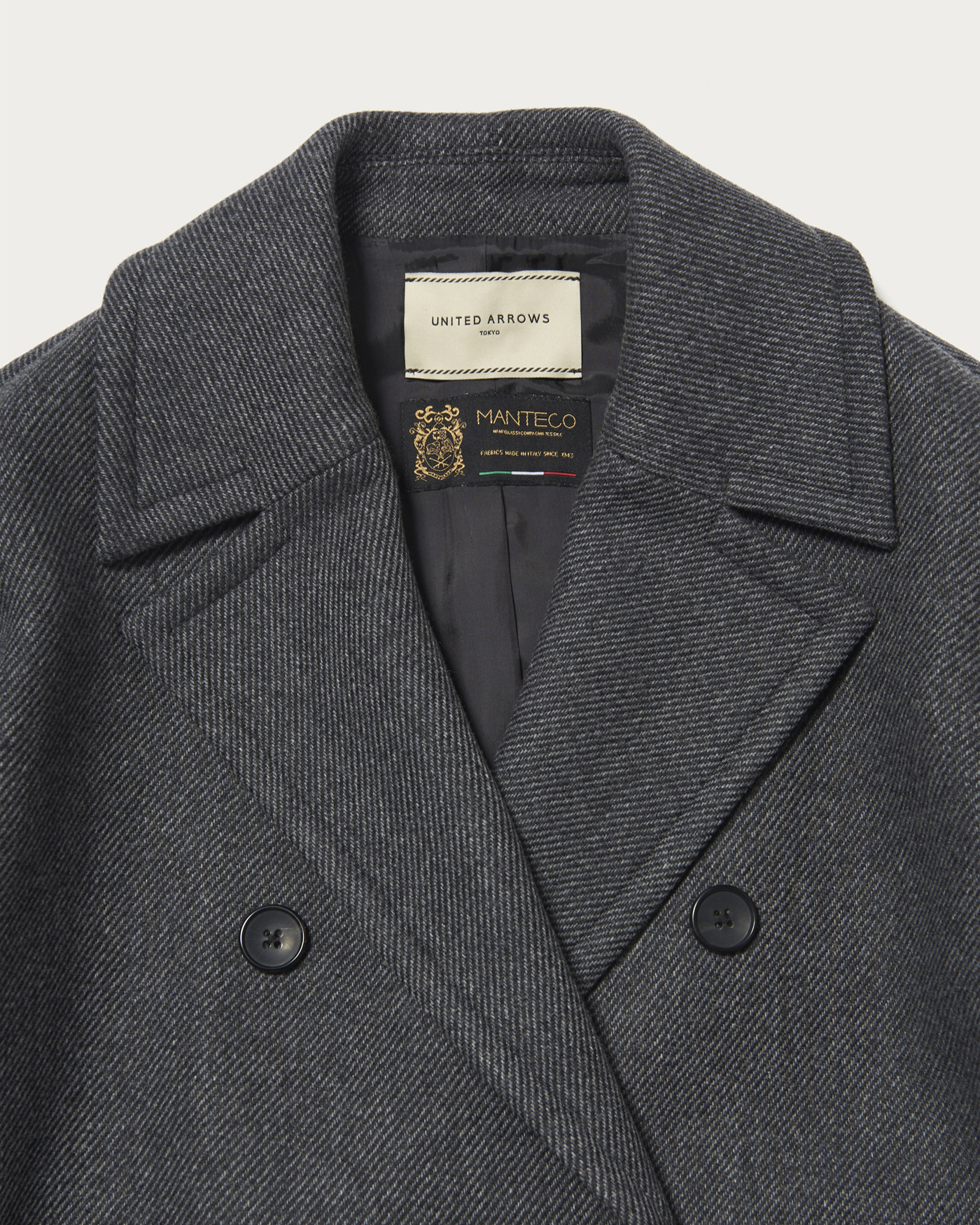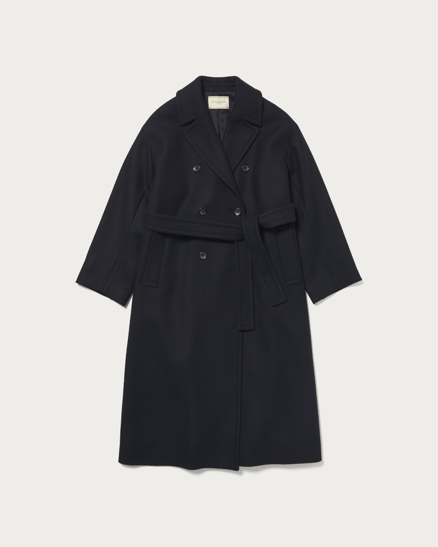 A double-breasted coat with six buttons that defies trends, featuring bold stitching as an accent for a masculine impression. The coat includes a belt and is lined for effective cold protection, with a three-dimensional tailoring that highlights the texture of the material. It is crafted using originally developed materials made from recycled resources, such as collected old clothes and fabric scraps. The unique, nuanced colors that come from the recycled materials are particularly appealing.