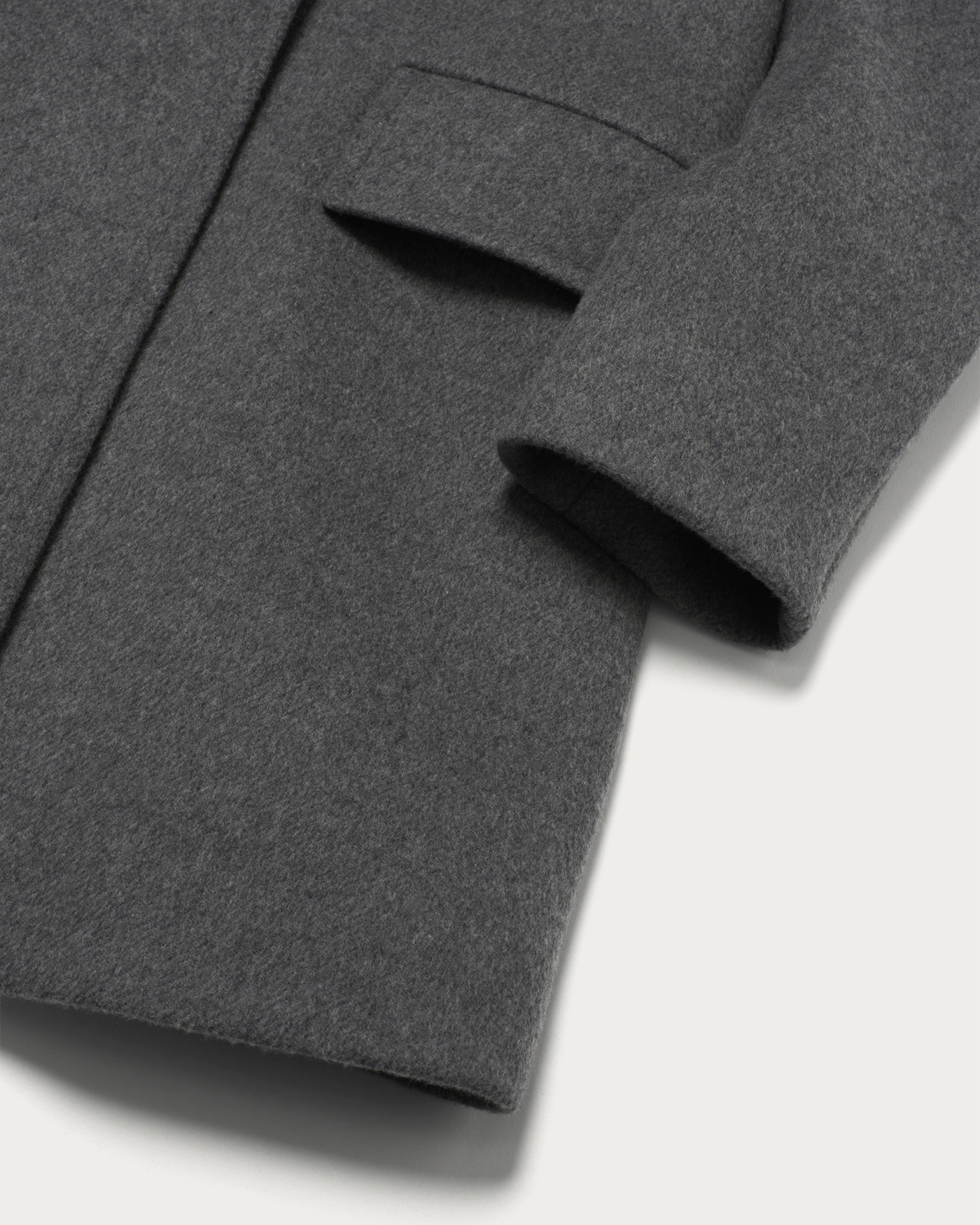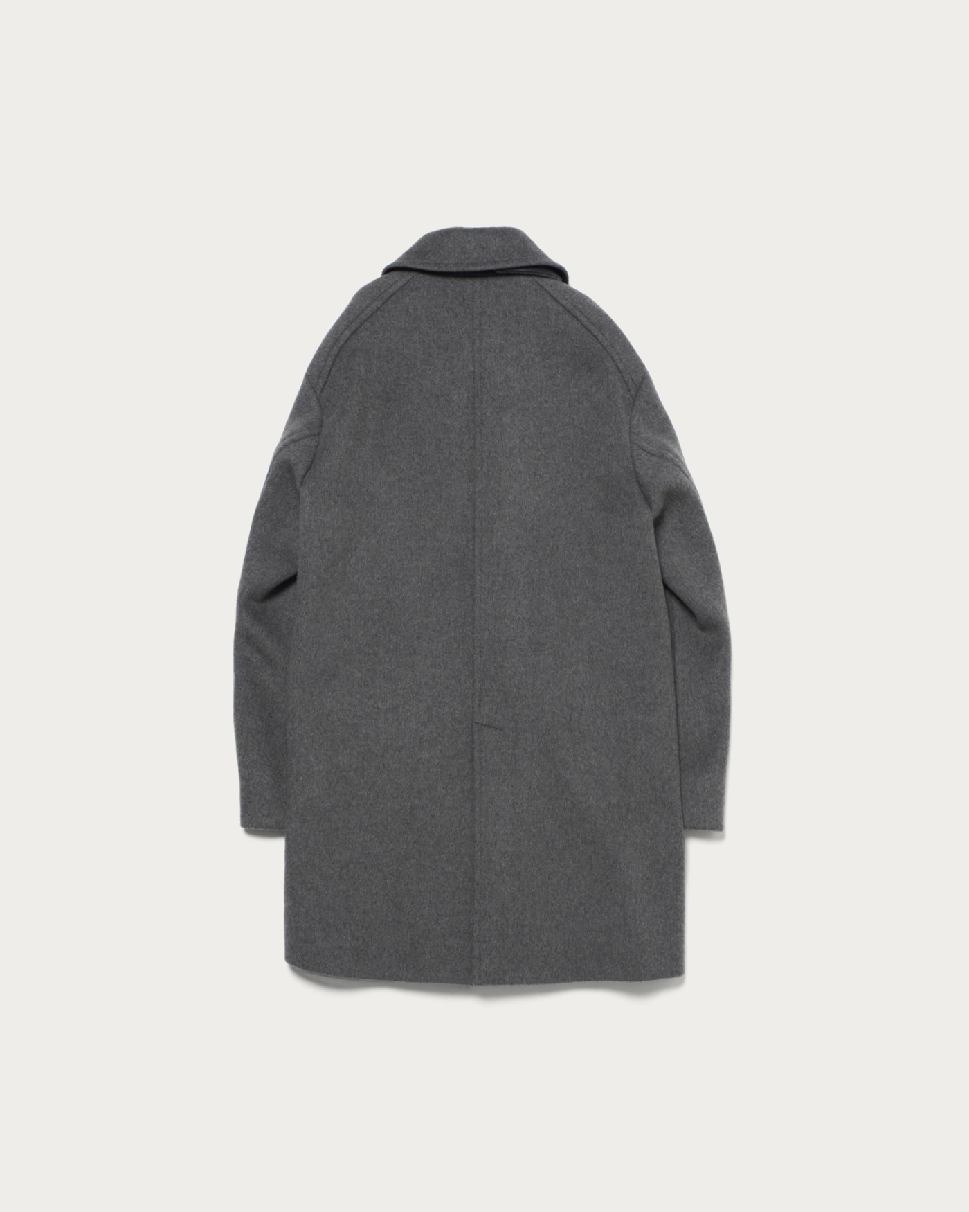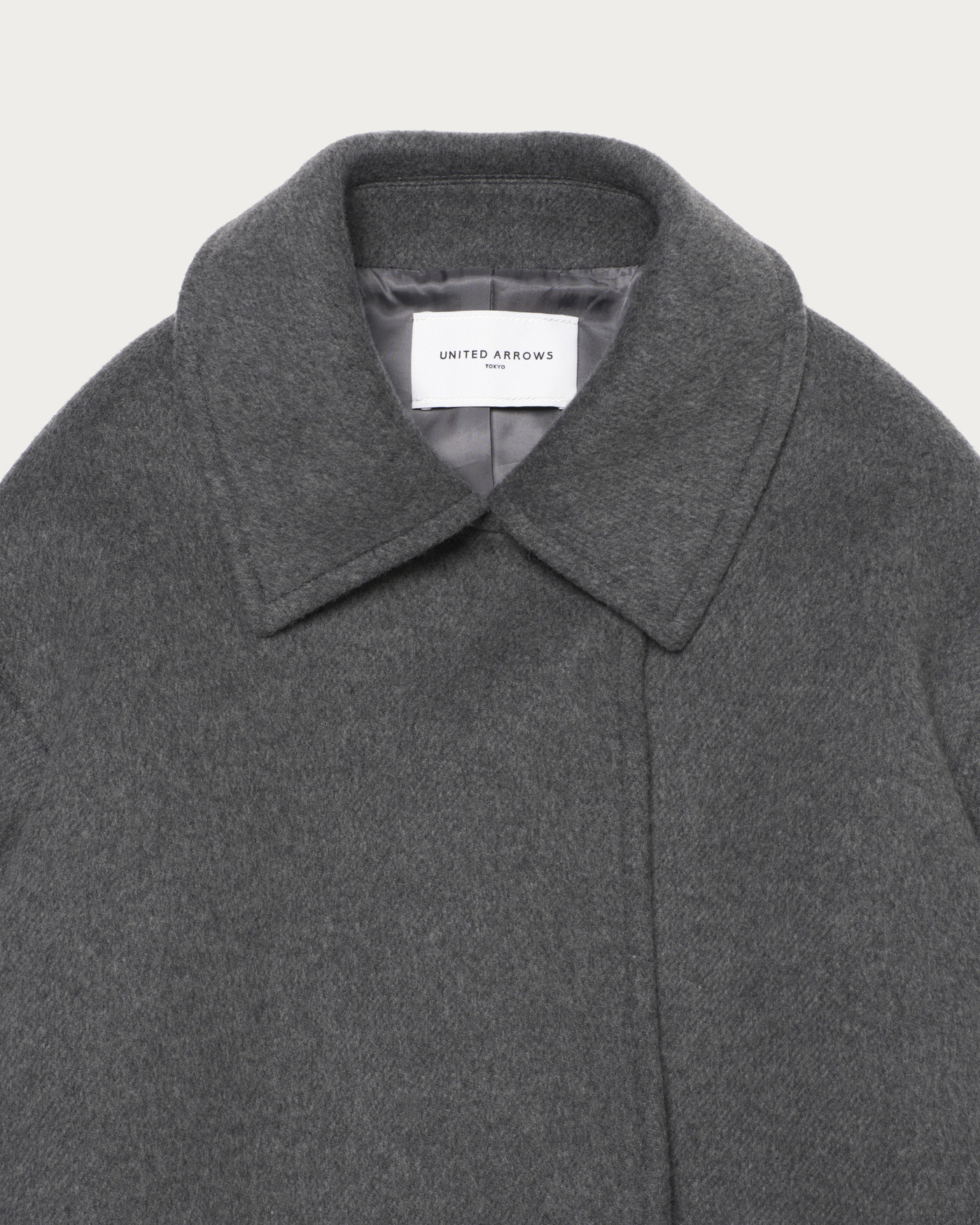 A mid-length coat with a tent line that flares out towards the hem, creating a sharp impression. It features a relaxed design with drop shoulders. The underside of the collar uses a leather-like material, allowing you to wear it as a stand collar for an added touch of modern style. Its simple and easy-to-wear design makes it versatile enough to pair with any item.