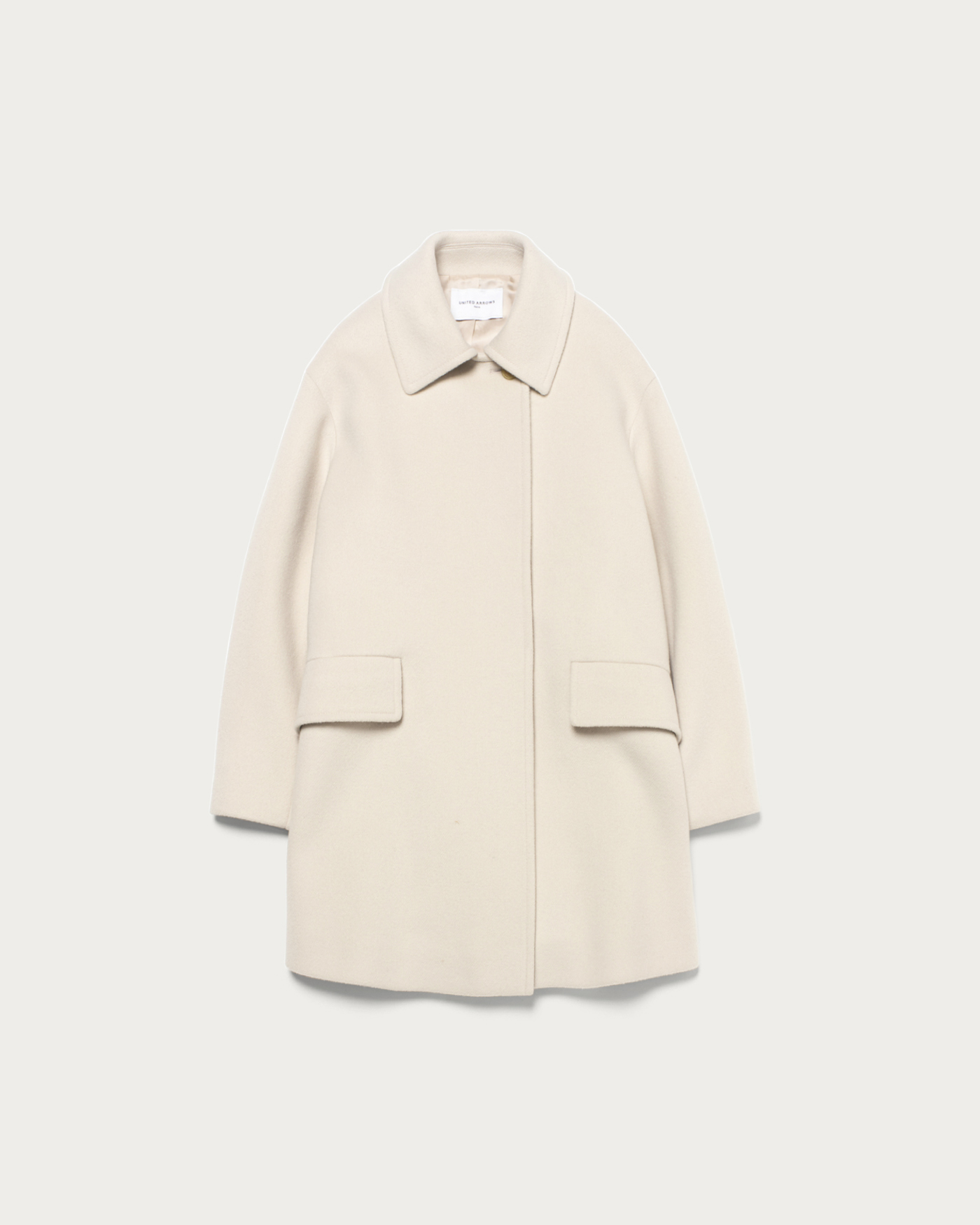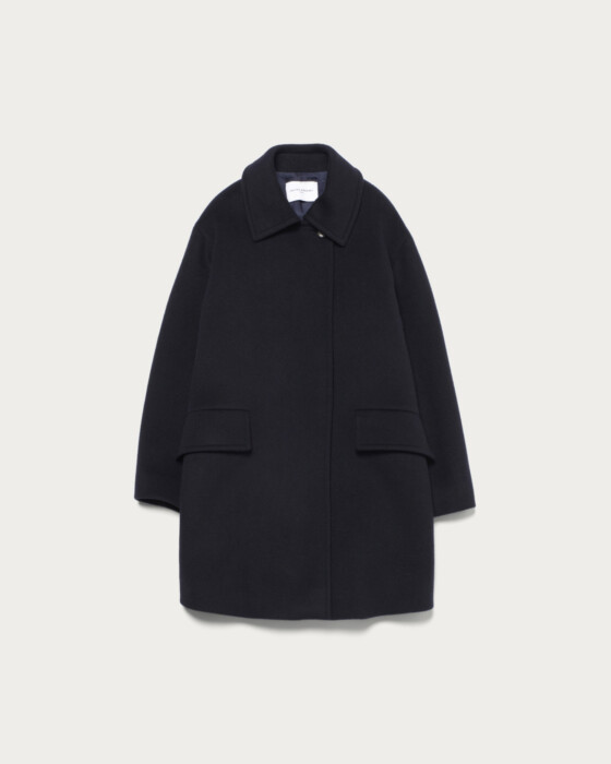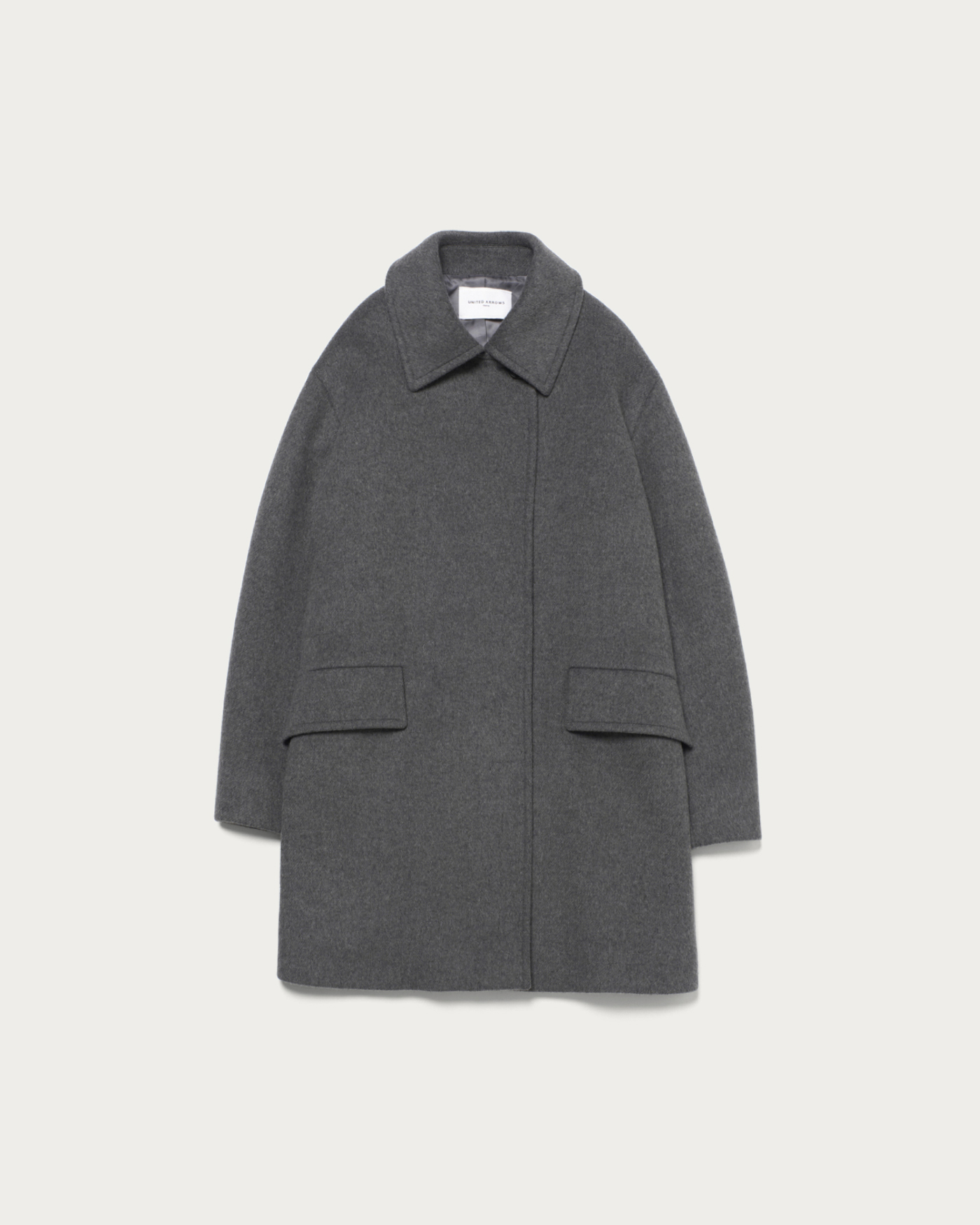 A mid-length coat with a tent line that flares out towards the hem, creating a sharp impression. It features a relaxed design with drop shoulders. The underside of the collar uses a leather-like material, allowing you to wear it as a stand collar for an added touch of modern style. Its simple and easy-to-wear design makes it versatile enough to pair with any item.