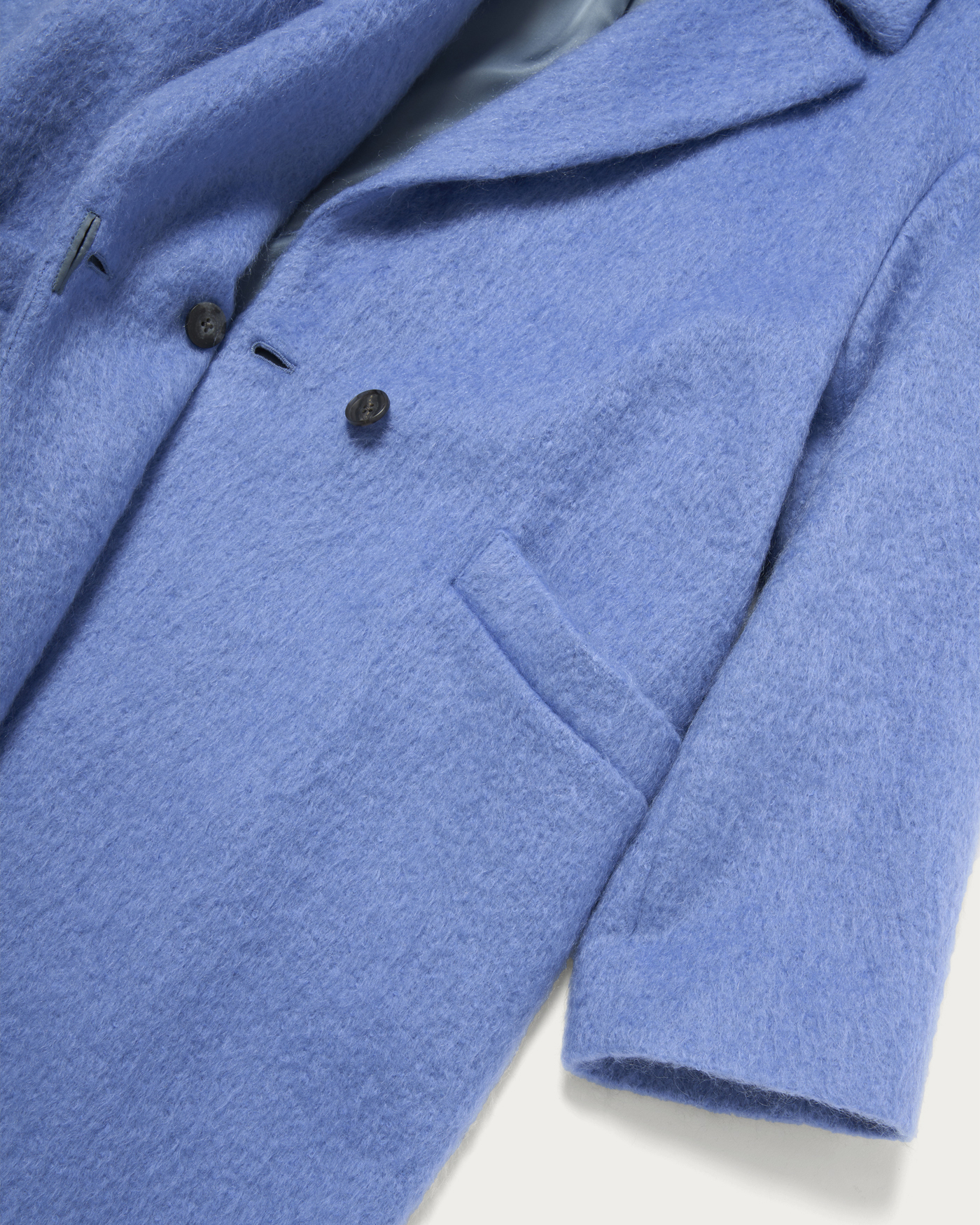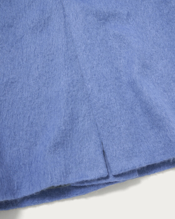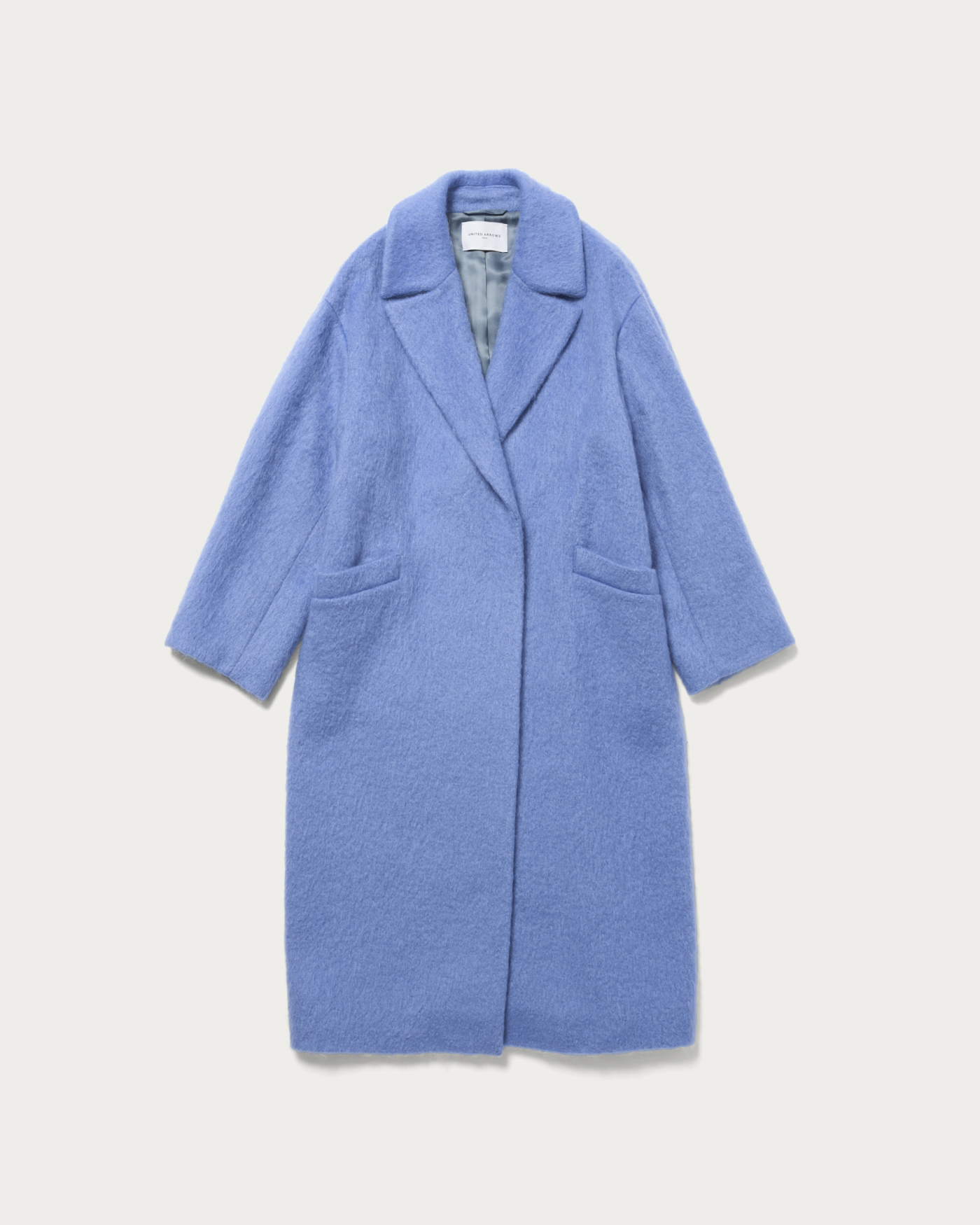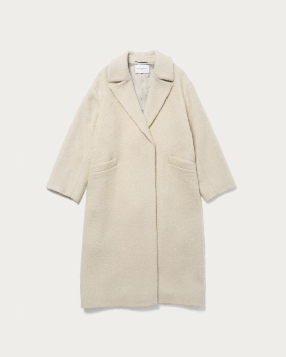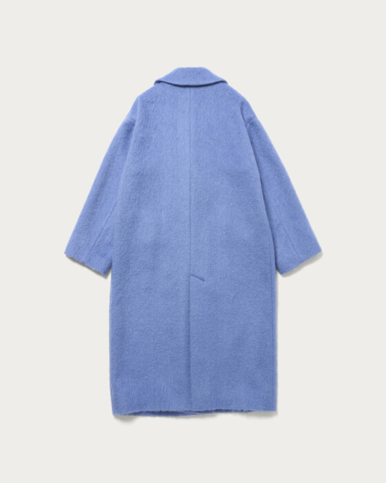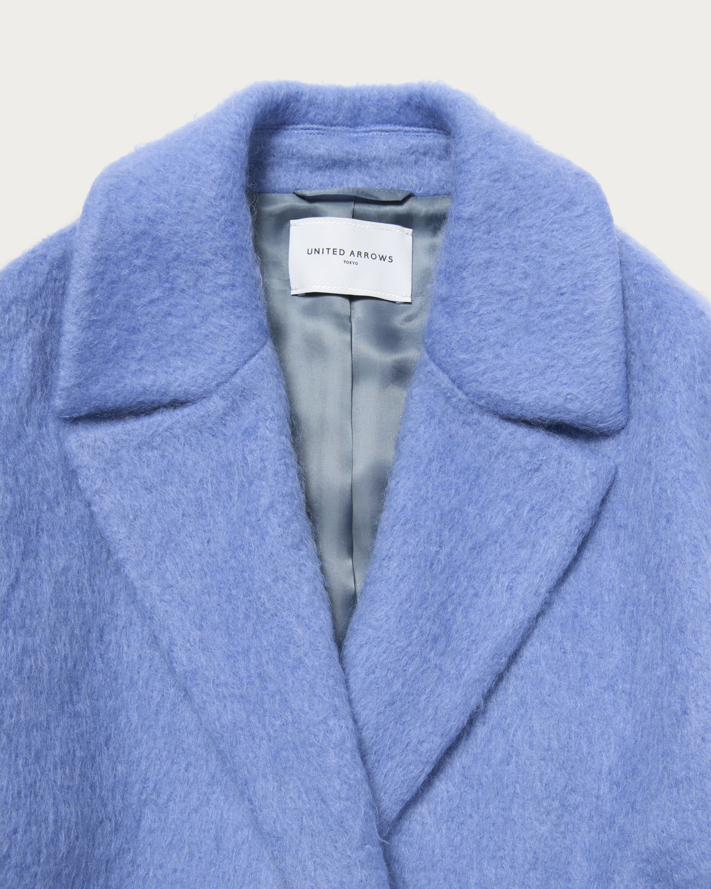 A tailored coat with a striking shaggy texture and soft coloring. The slightly dropped shoulder design and large collar create a glamorous look around the face, enhancing femininity. With a slightly longer below-the-knee length, it is also recommended for an elegant style.